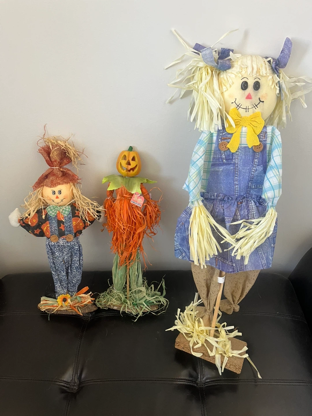 Here's a set of three adorable fall scarecrow decorations! They're perfect for adding a touch of autumn charm to your home. The set includes a scarecrow girl, a pumpkin scarecrow, and a scarecrow with pigtails. They are in great condition and ready to find a new home!