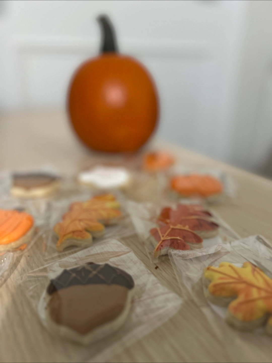 512individually wrapped fall themed cookies. They are decorated with leaves, pumpkins, and acorns. Perfect for a Thanksgiving treat!