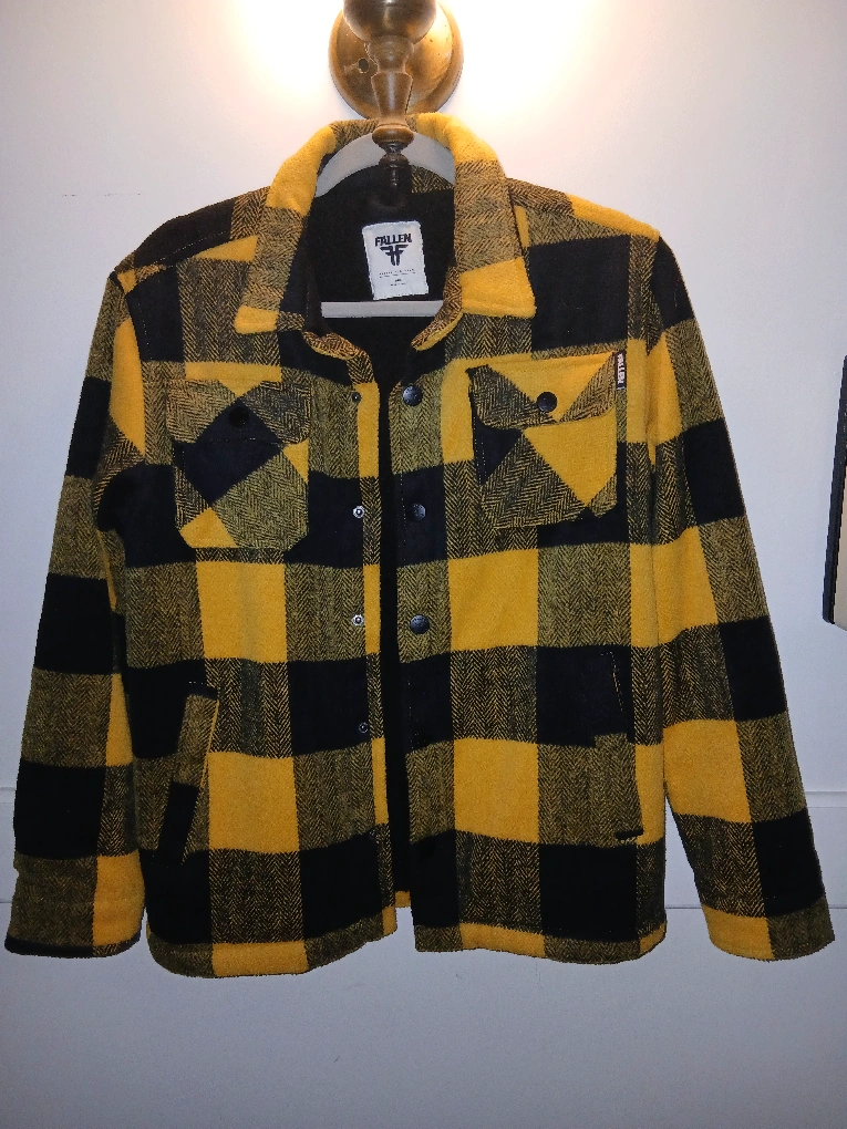 10youth Fallen flannel jacket in a yellow and black plaid pattern. It's a youth size 14/L and in great condition. warn only a few times. Sherpa lined. great for fall, spring and as layers all year long.