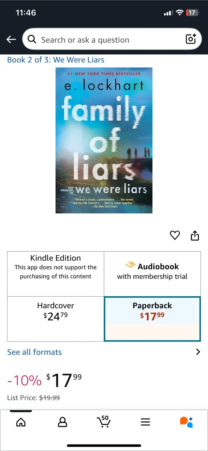 Selling the paperback edition of "Family of Liars" by E. Lockhart, which is book 2 of 3 in the series "We Were Liars"! The list price was $19.99, but it's currently listed on the screenshot for $17.99.