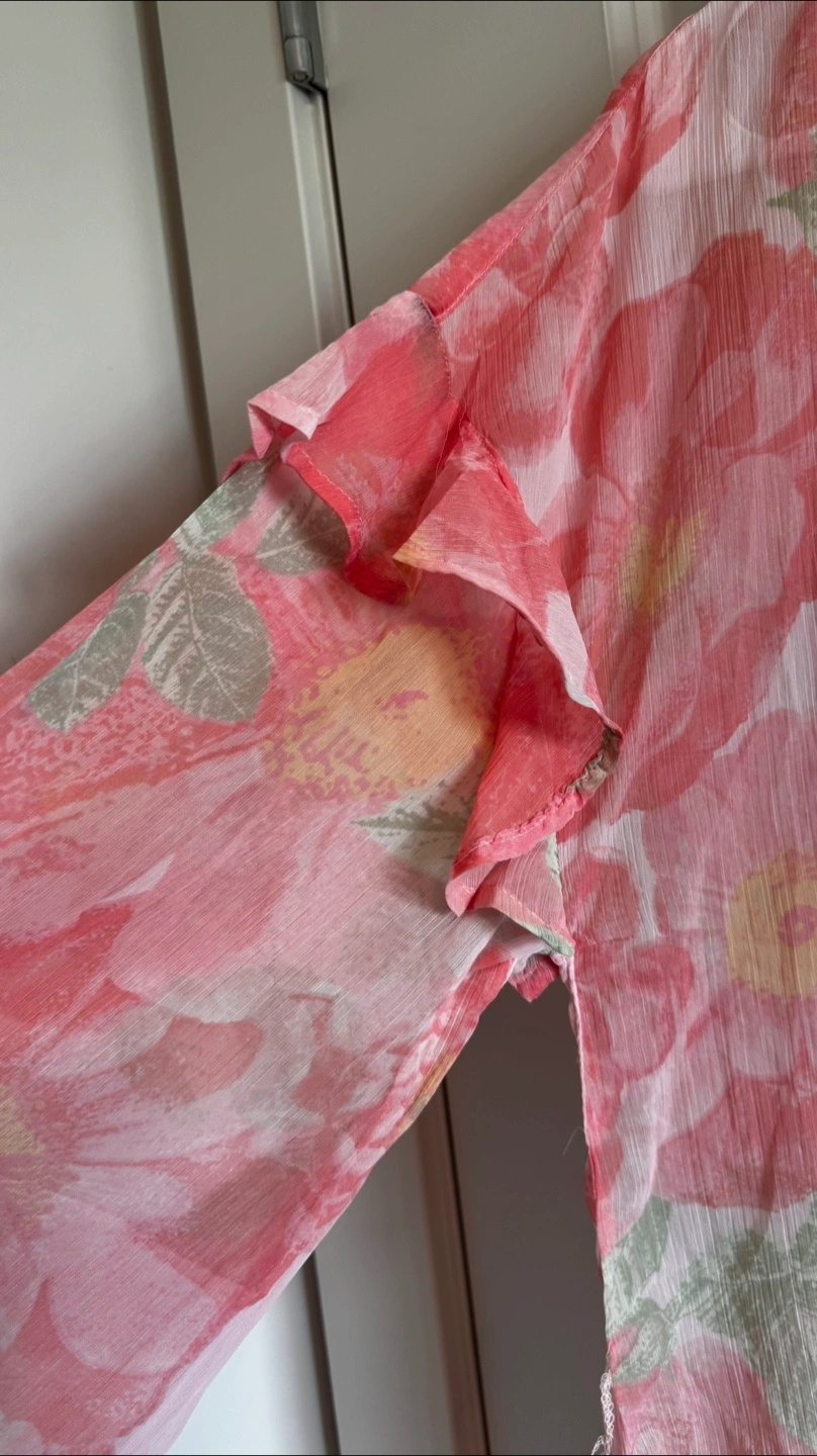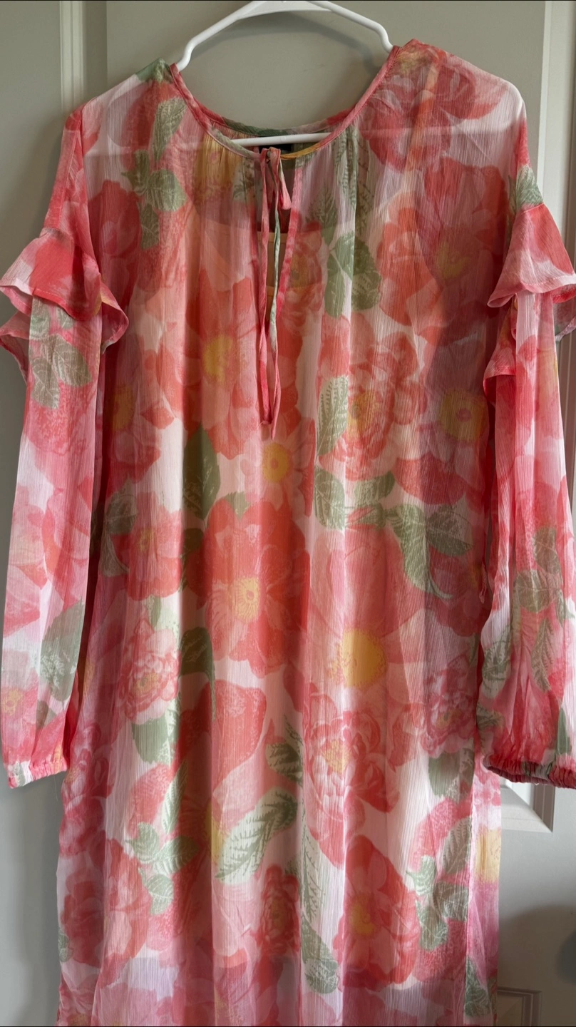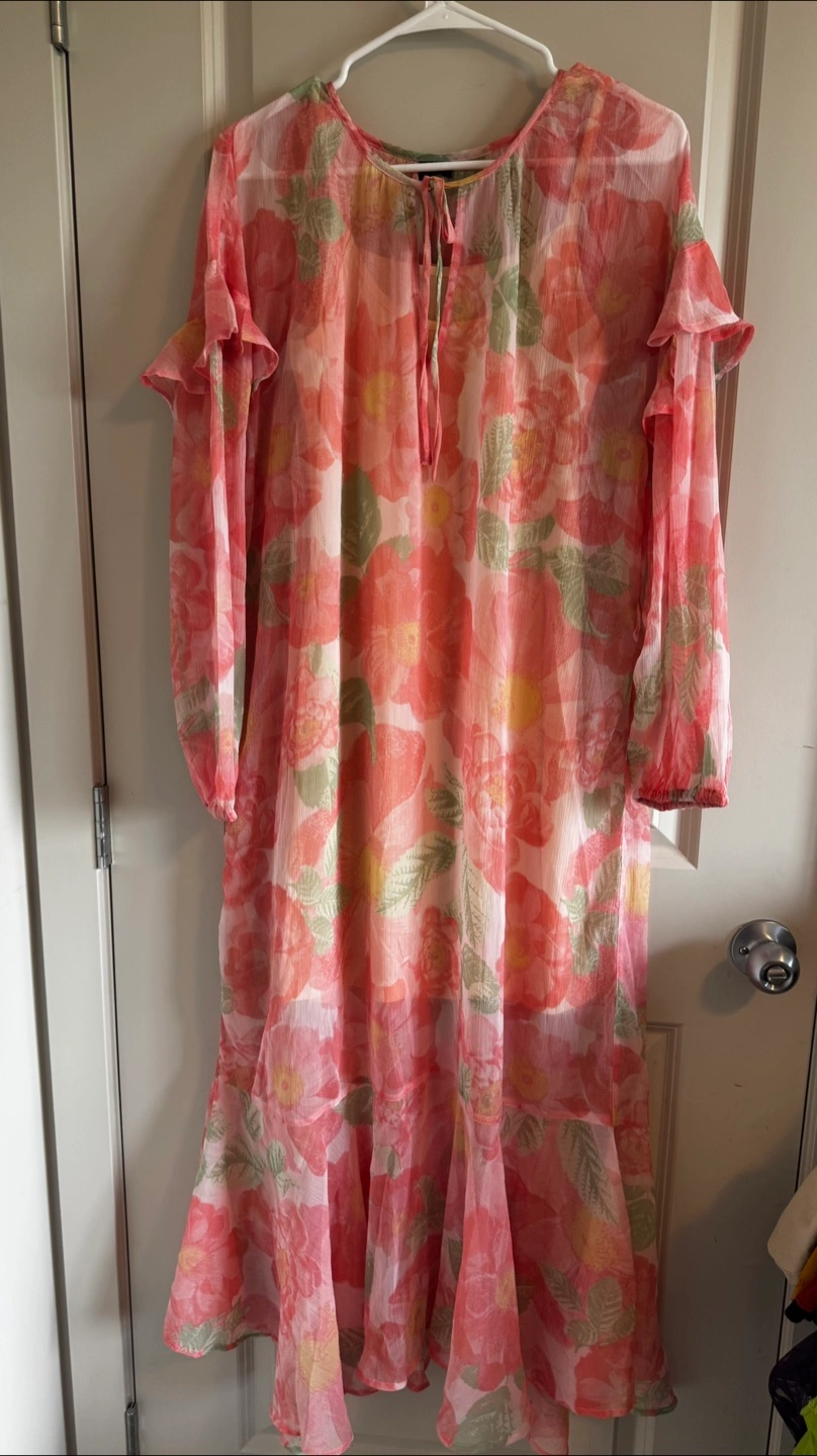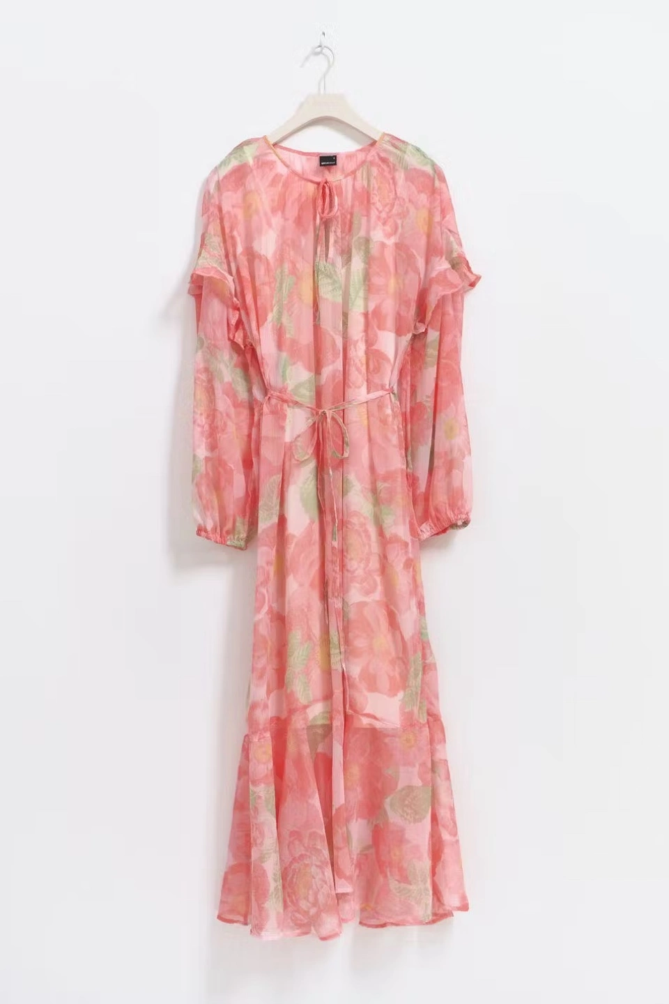 Beautiful maxi dress in a floral print. Features long sleeves, ruffle details, and a tie at the neckline. The dress has a flowy silhouette, perfect for a warm summer day. You will love how graceful you feel in this lovely dress. #25
