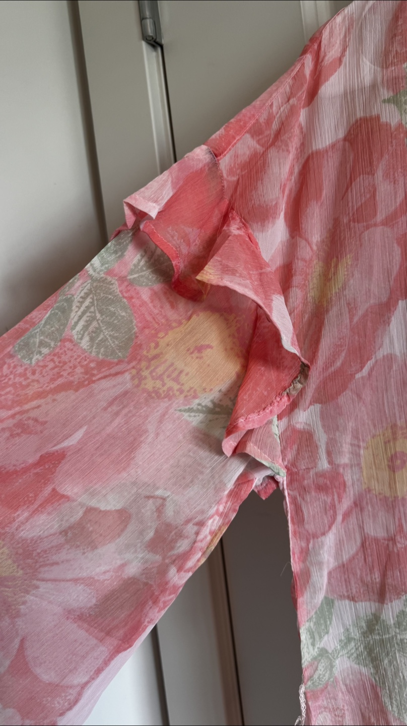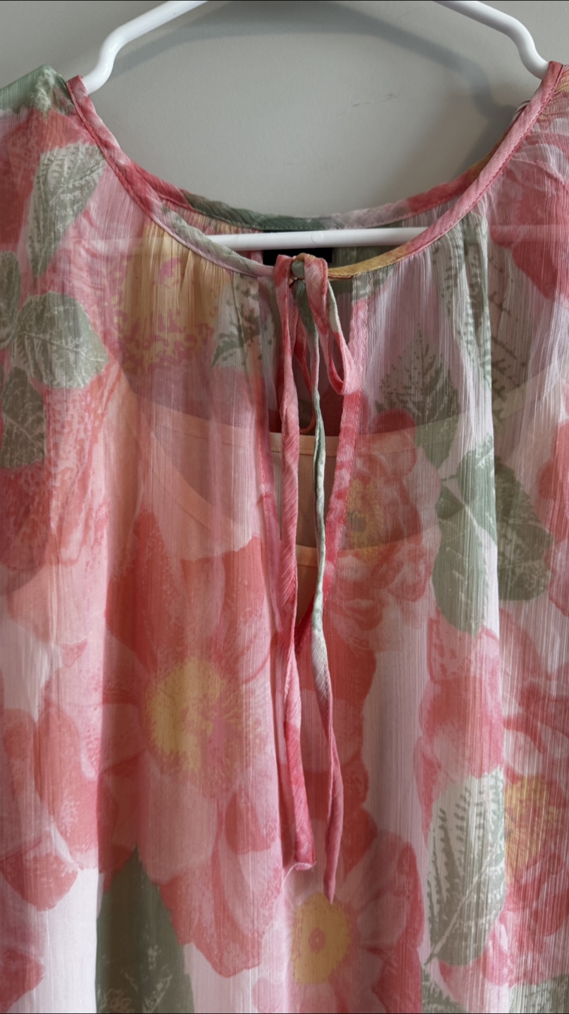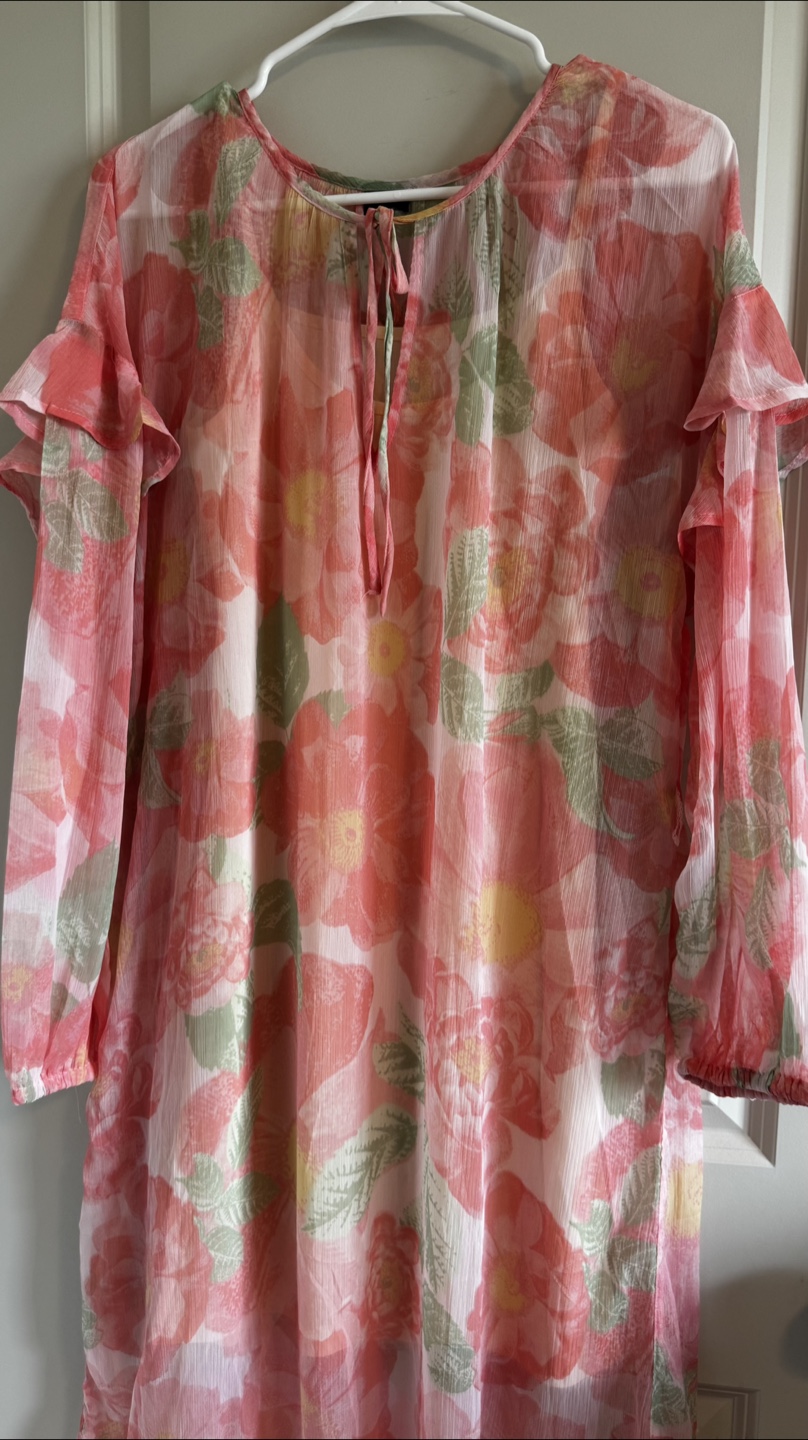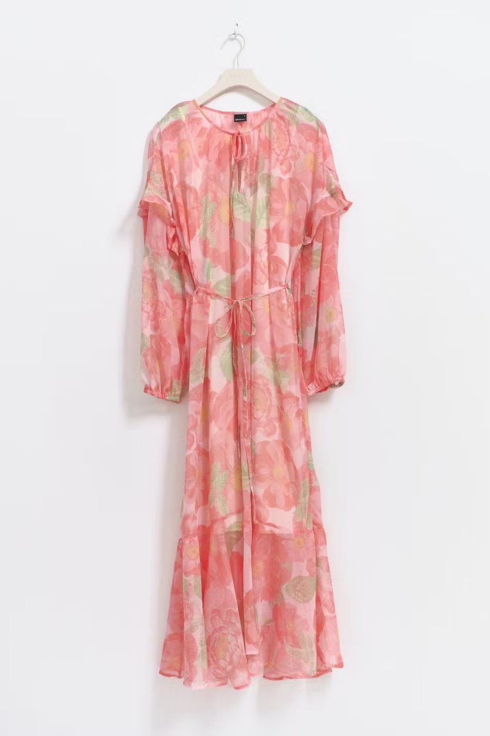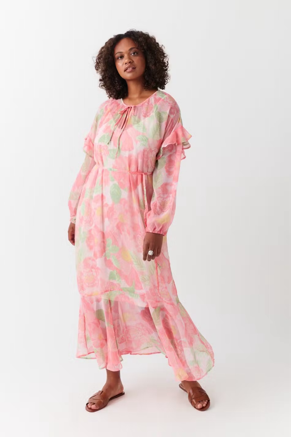 Beautiful maxi dress in a floral print. Features long sleeves, ruffle details, and a tie at the neckline. The dress has a flowy silhouette, perfect for a warm summer day. You will love how graceful you feel in this lovely dress. #25