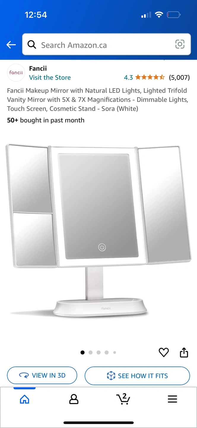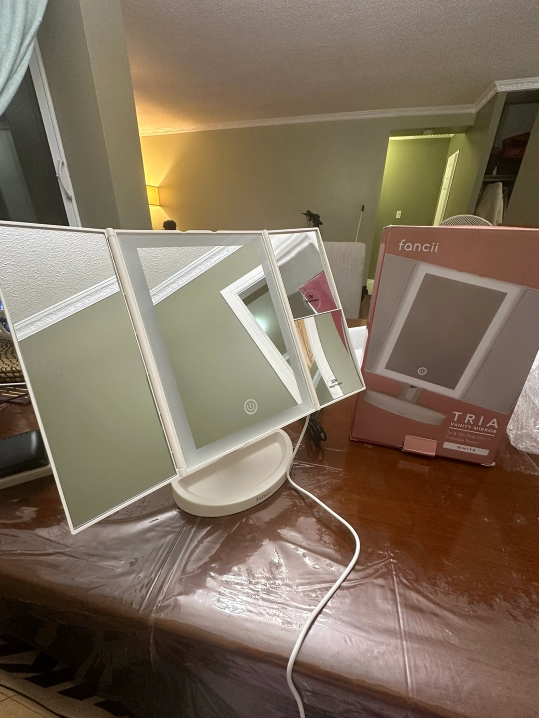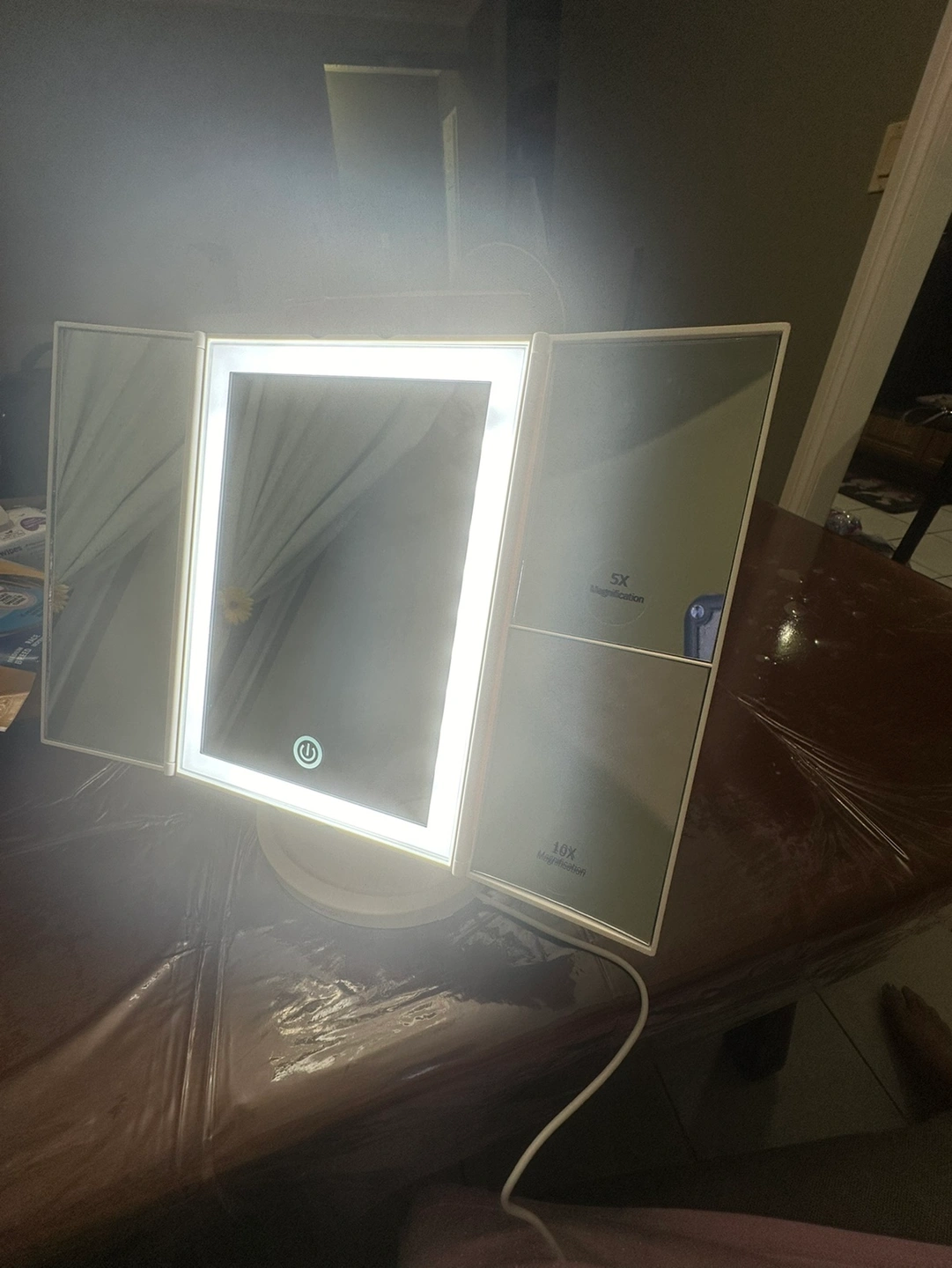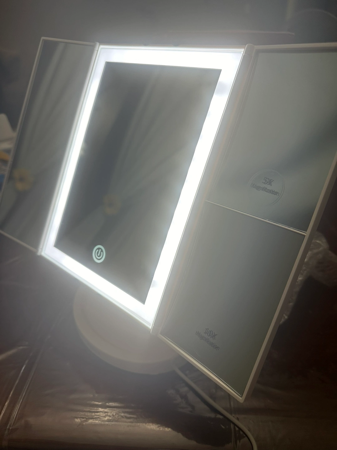 157Fancii Lighted Makeup Mirror with Natural LED Lights, Lighted Trifold Vanity Mirror with 5x and 10x Magnifications - Dimmable Lights, Touch Screen, Cosmetic Stand - Sora (White)
