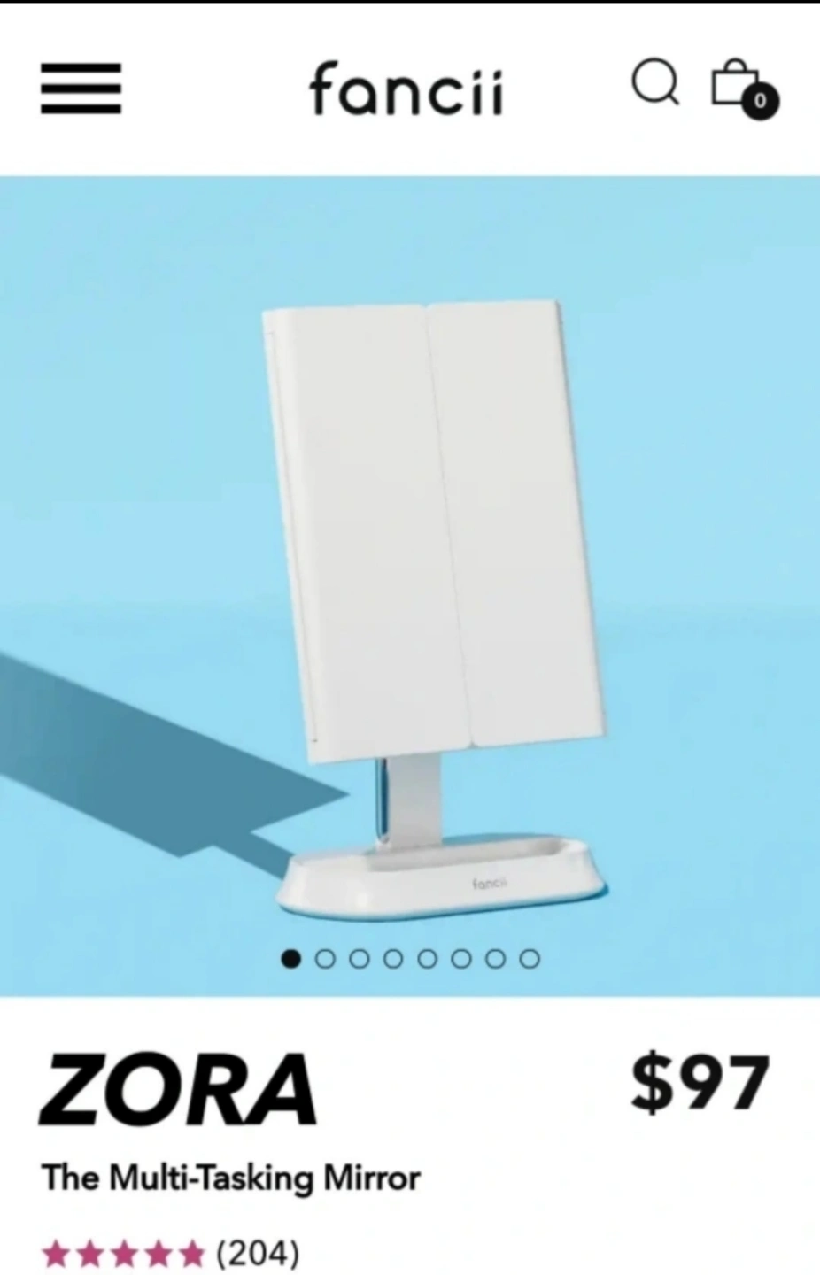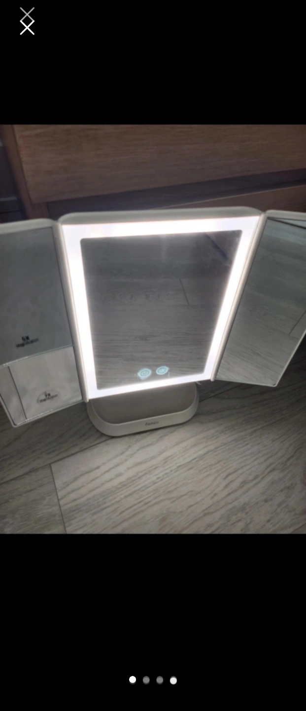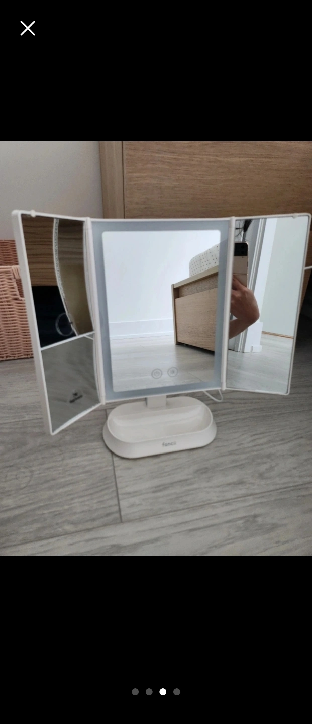 Three-sided lighted vanity mirror. Adjustable brightness. Compact and portable design. Perfect for makeup application.
