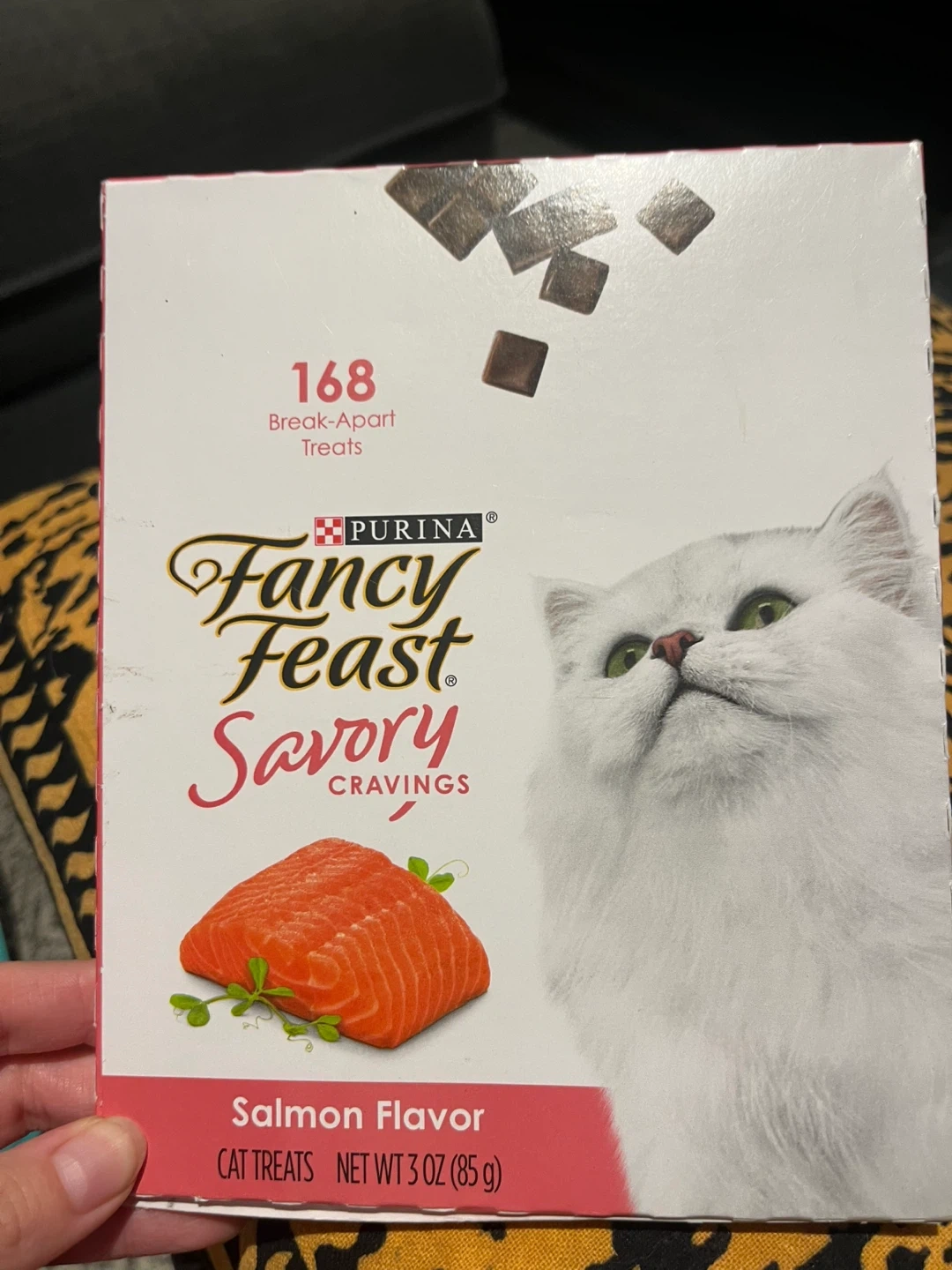 Selling a brand new box of Fancy Feast Savory Cravings cat treats in salmon flavour! These are break-apart treats, perfect for your feline friend. The box contains 168 treats and weighs 3 oz (85 g). Best before April 2026, so your kitty can enjoy them fresh!