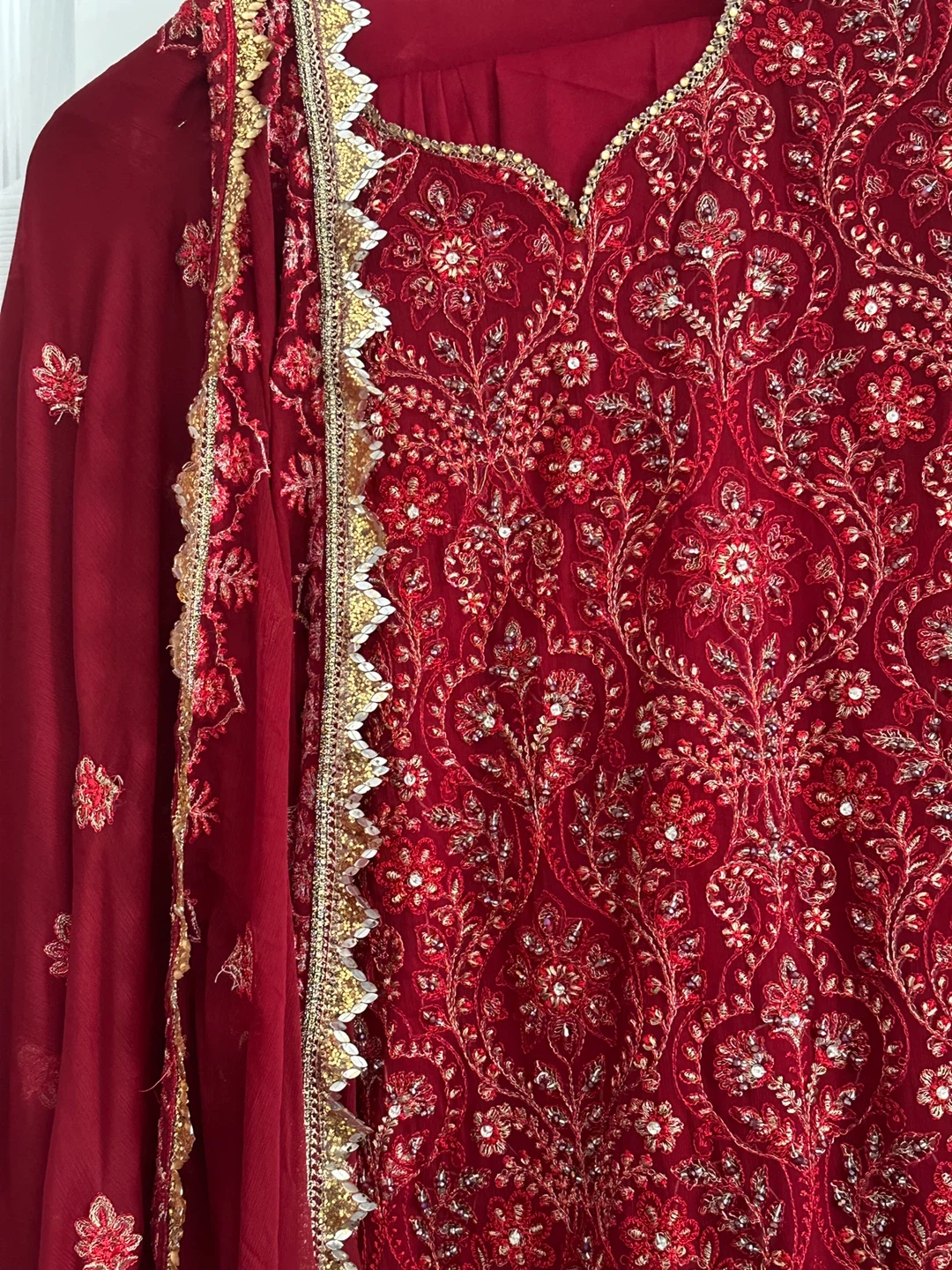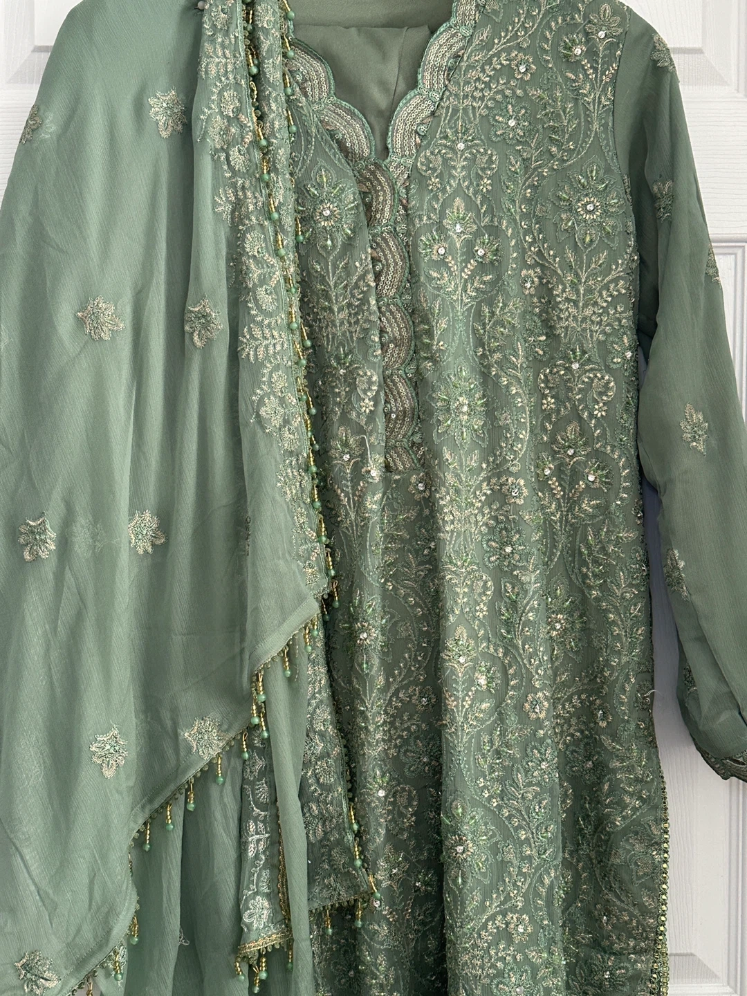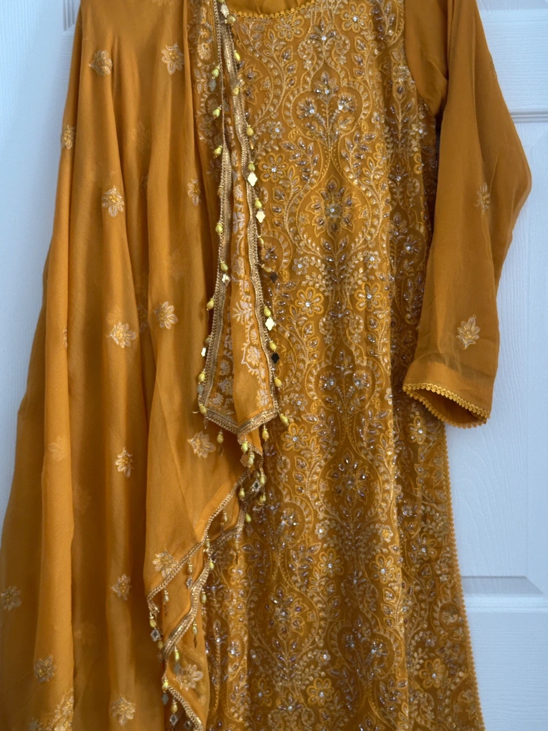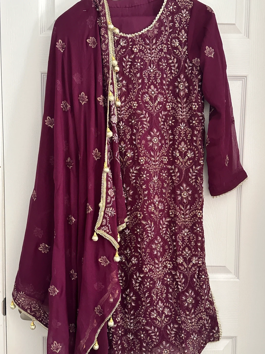 5Selling these beautiful salwar kameez sets! Each set includes a long tunic-style top, matching bottoms, and a dupatta (scarf). The outfits are intricately embroidered with floral and paisley patterns, and feature delicate beadwork and embellishments. Available in red, green, purple, and yellow.