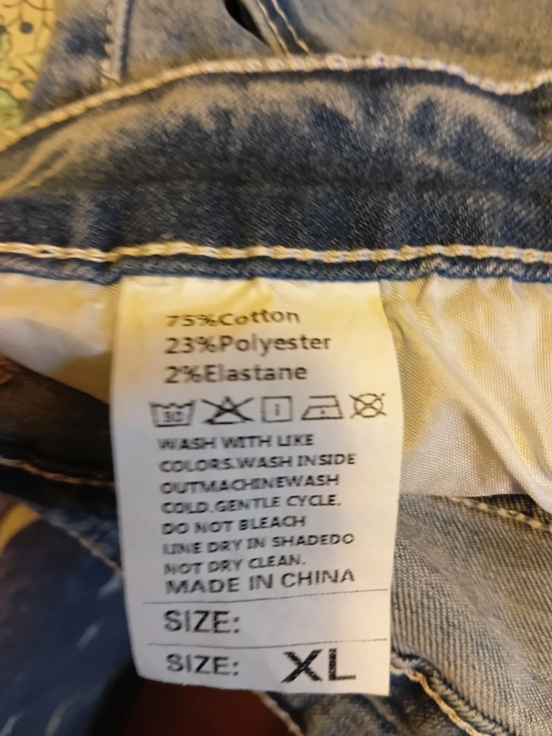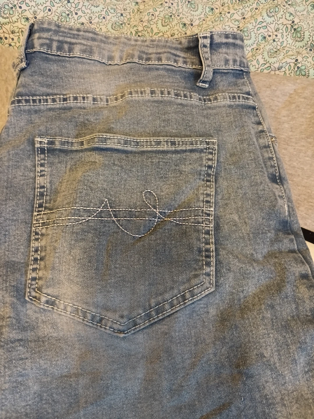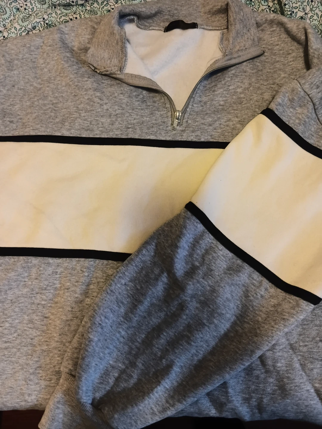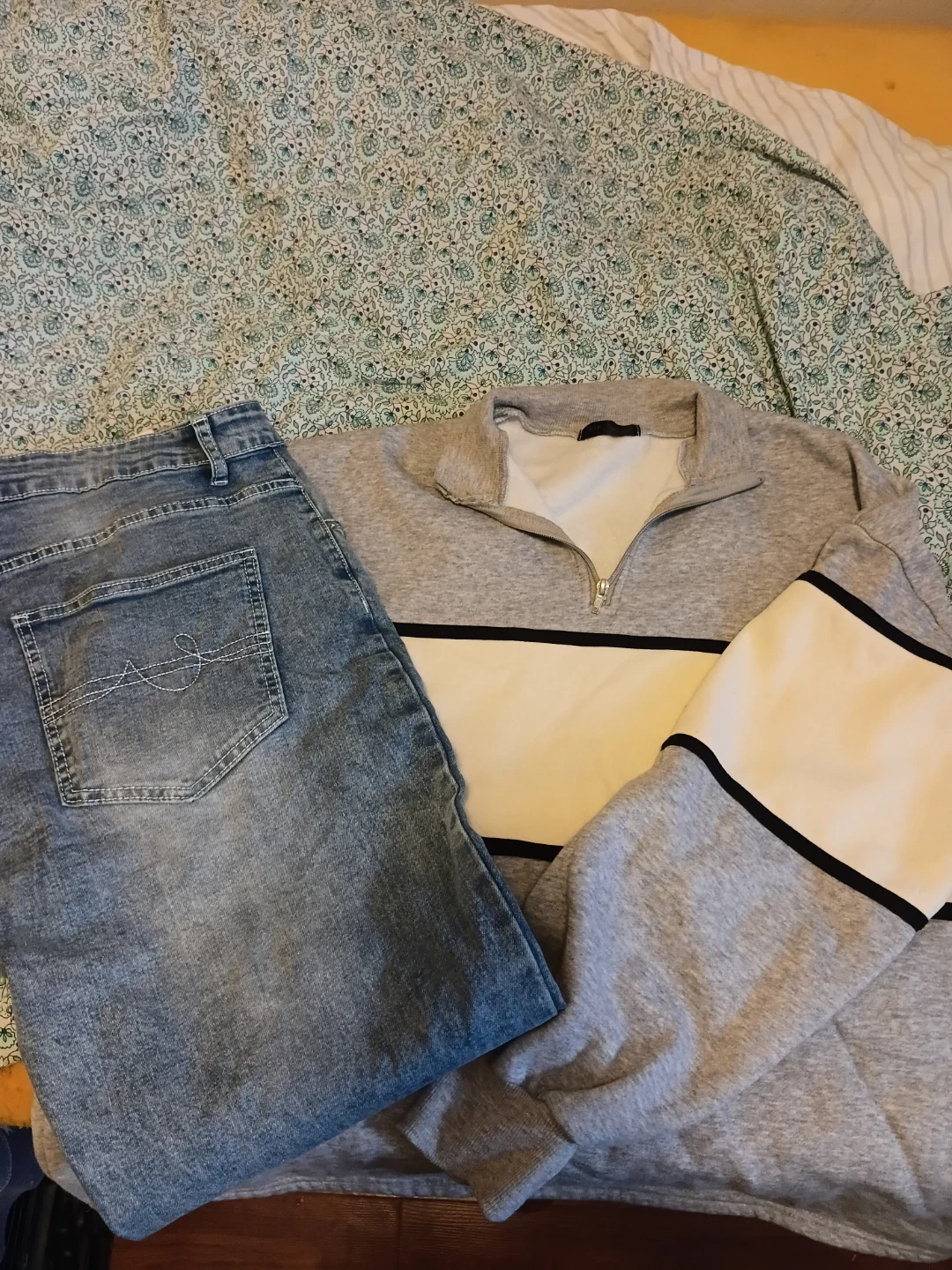 Grey quarter zip sweatshirt with white and black stripe detail. Jeans are a light wash denim. Both items are size XL.