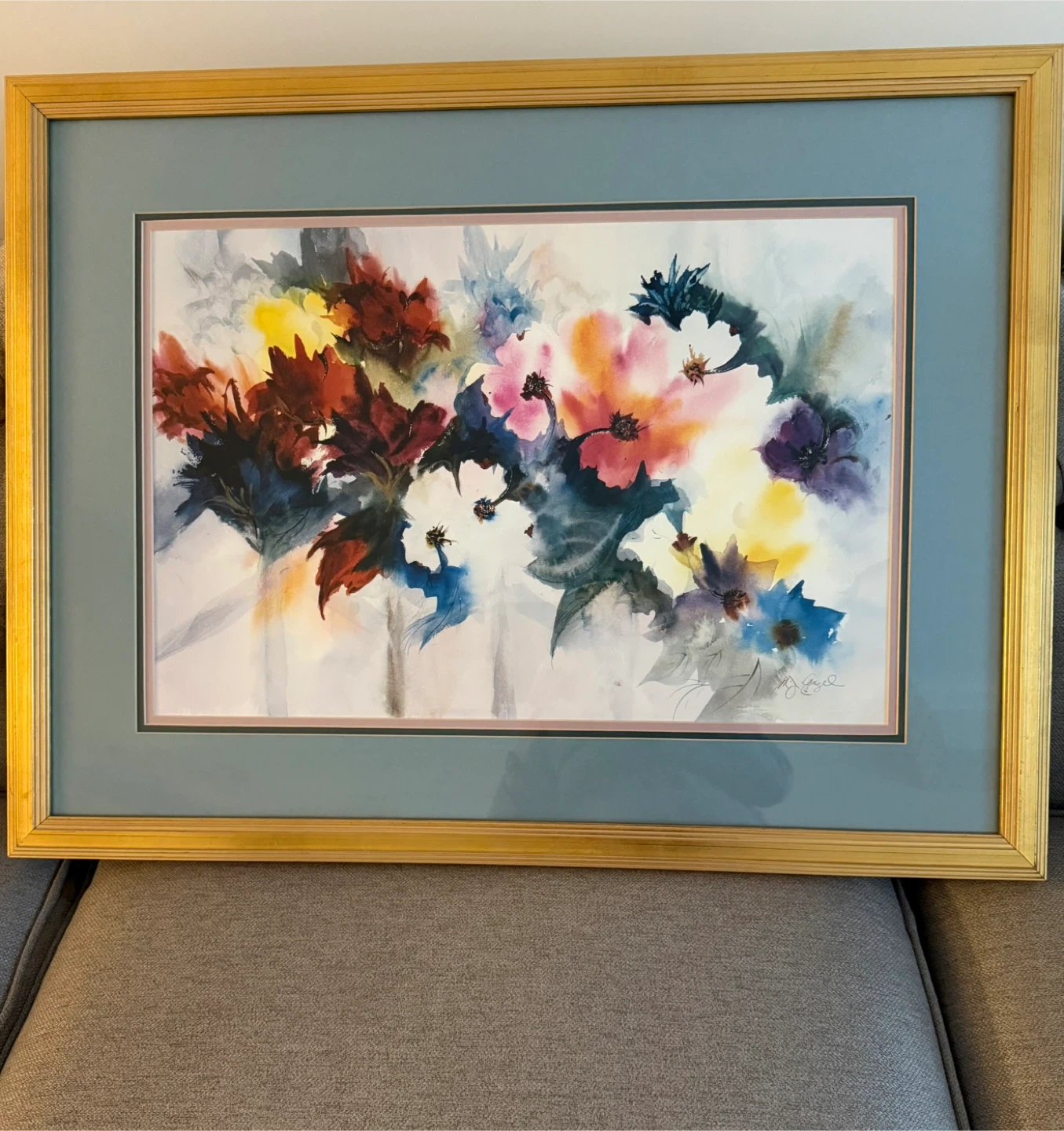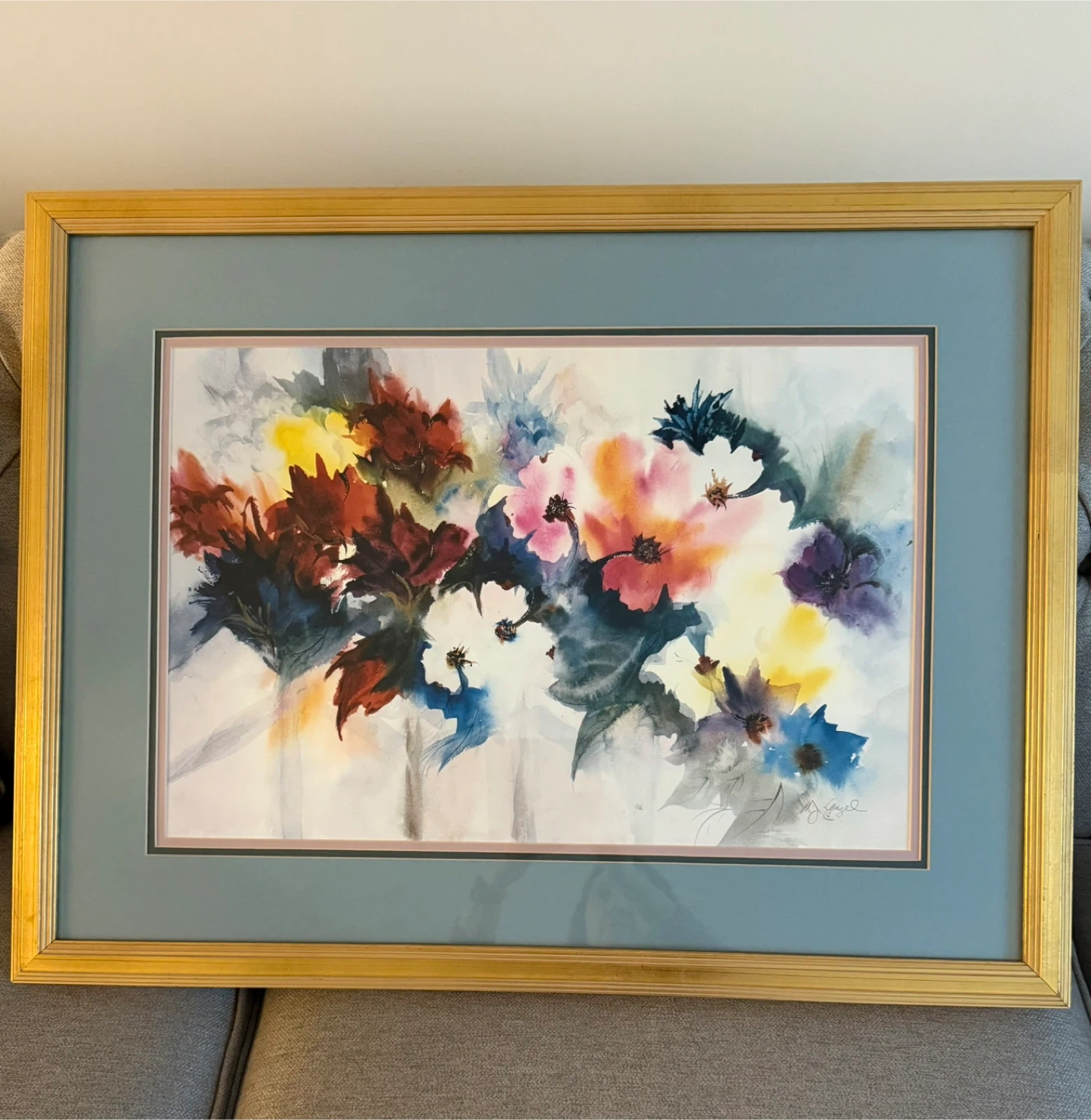 413Beautiful framed watercolour painting of a floral arrangement. The painting features a variety of colourful flowers. The frame is a gold colour solid wood with a blue and pink border. It's in great condition and ready to hang in your home! Easy to hang wire. Smoke free home. Cash only. Please pick up in Mississauga. All sales final and bundle offers are welcome. A freebie is included with every purchase.