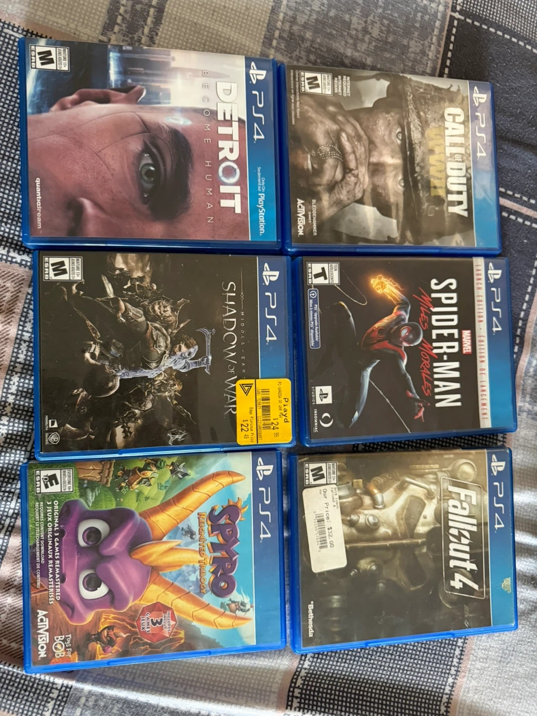 Bundle of six PlayStation 4 games including, Marvel's Spider-Man: Miles Morales,, Fallout 4, and Shadow of War. All games are for PS4 and come in their original cases. DM for price