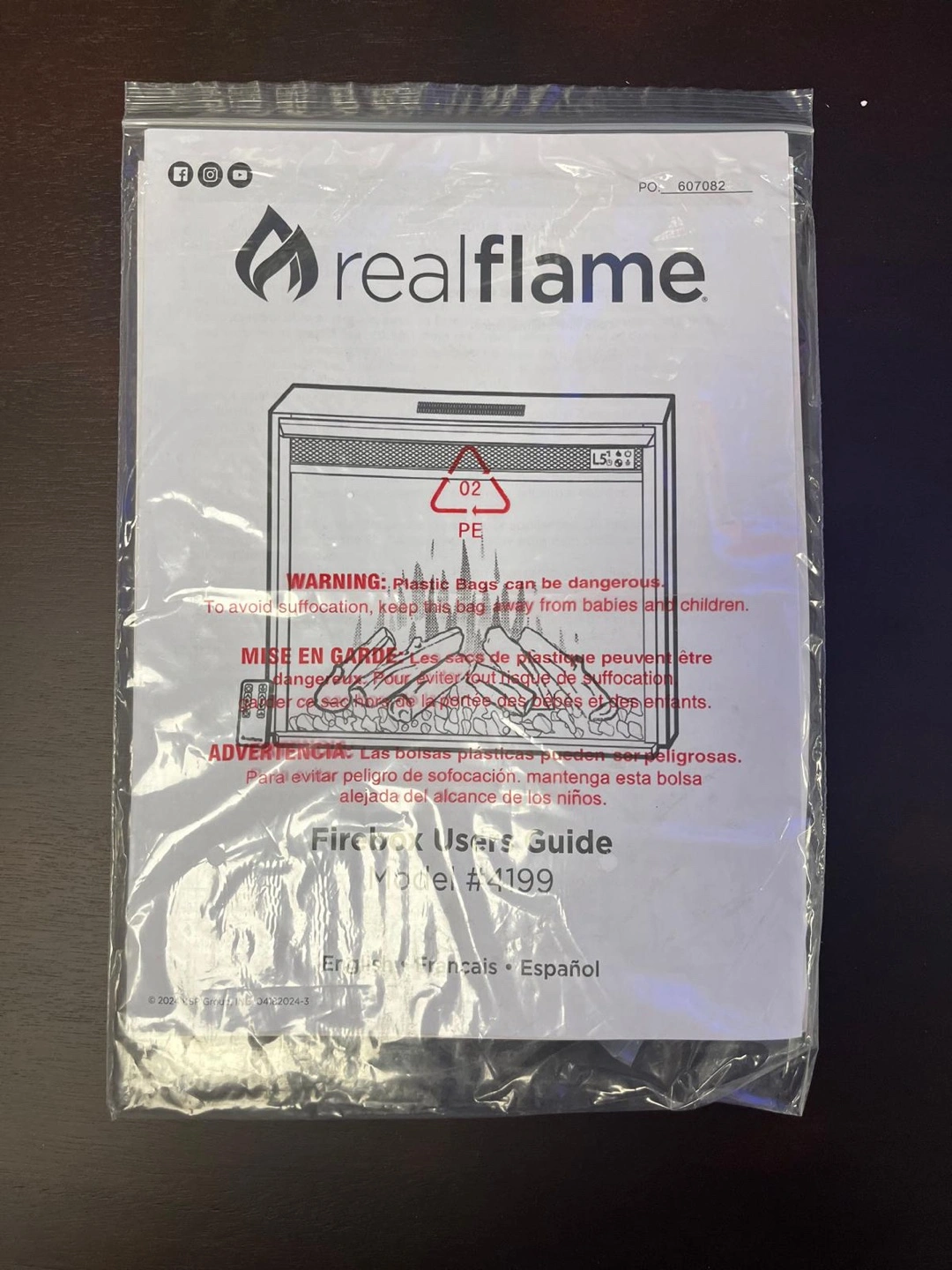Electric fireplace with a wooden frame and glass doors on either side. Includes remote and instructions.