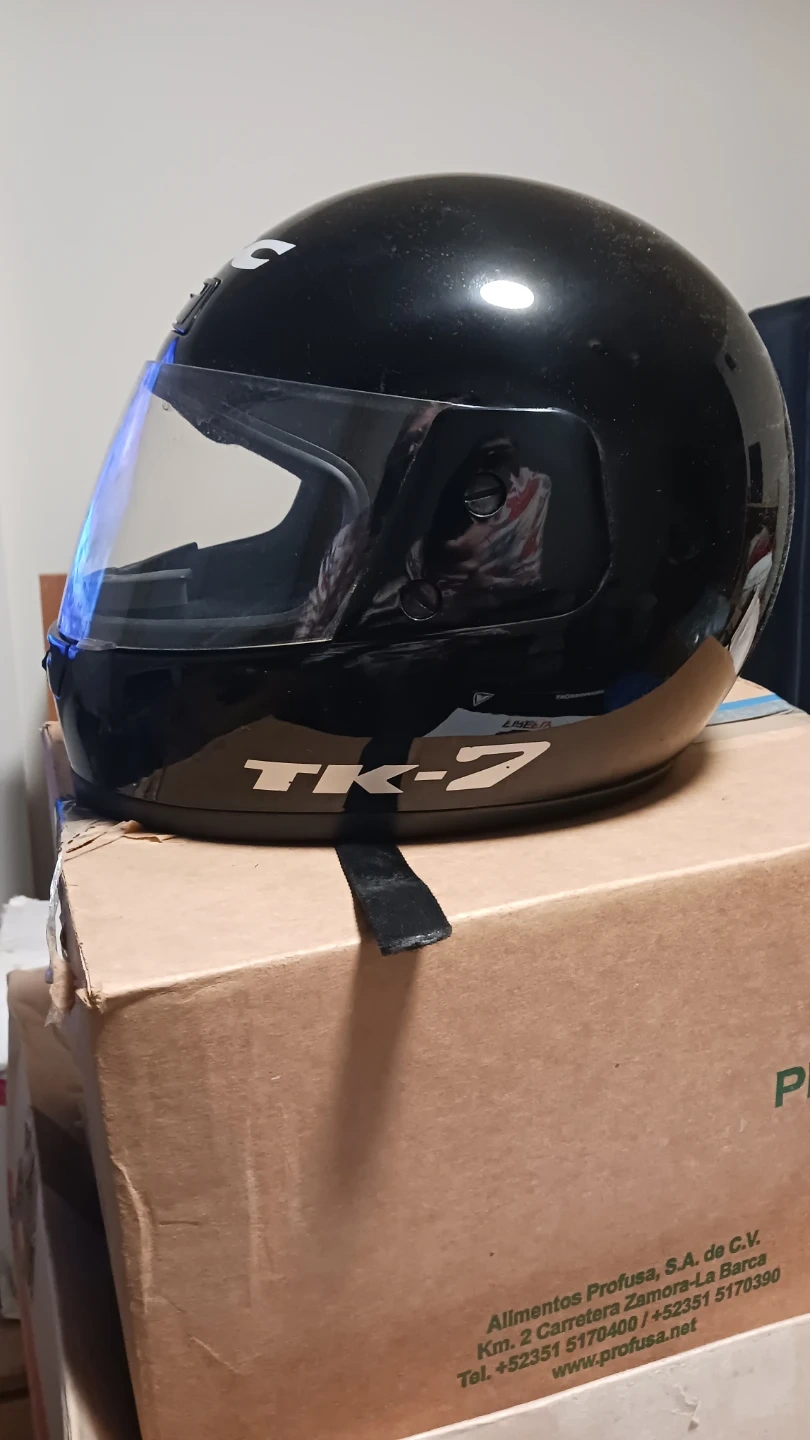 Black full-face motorcycle helmet from KBC. It's a TK-7 model with a clear visor. Comes with a protective helmet bag. Includes adjustable chin strap. Never been in an accident of any type of bumped roughly. Extremely great shape.