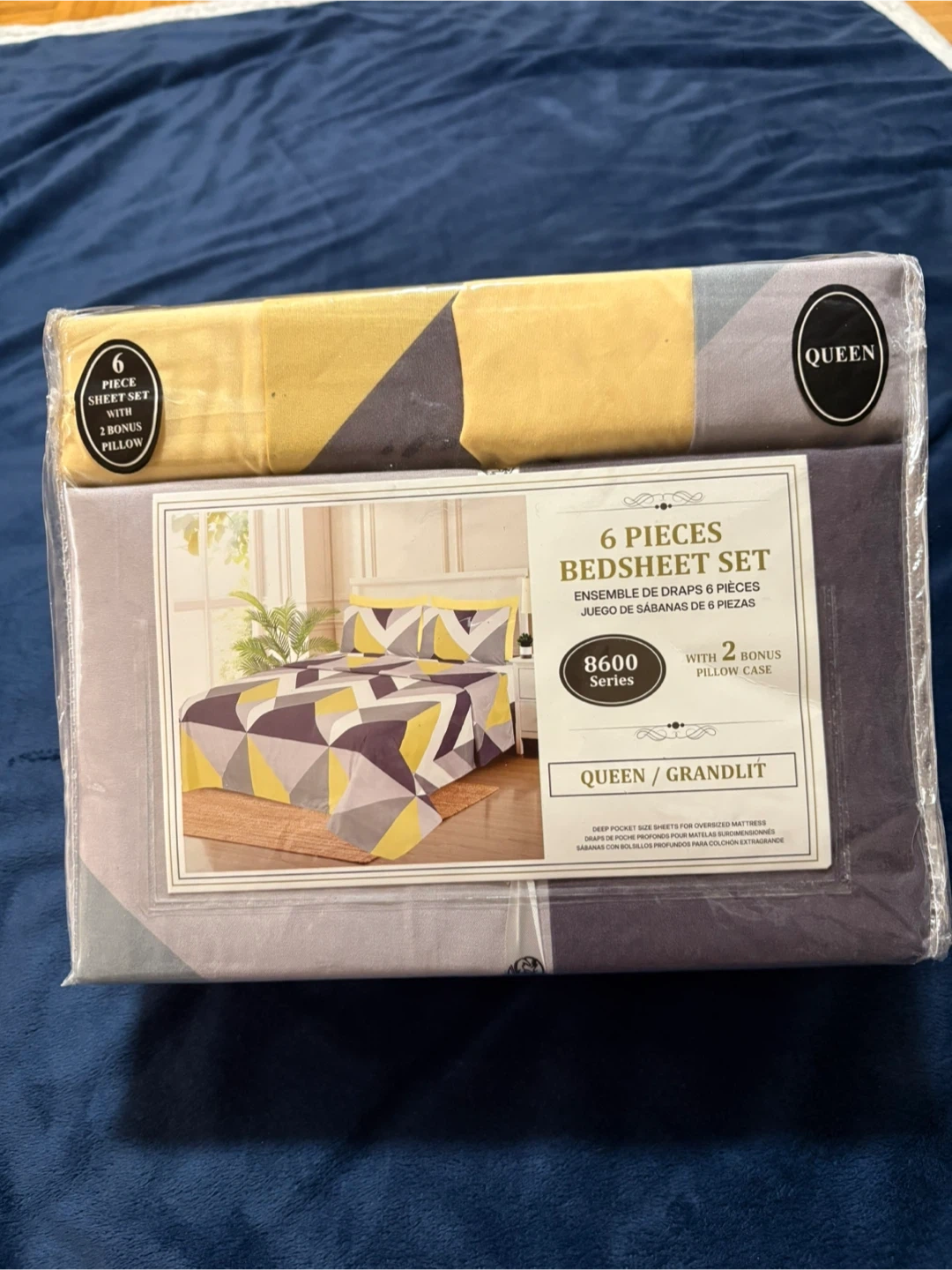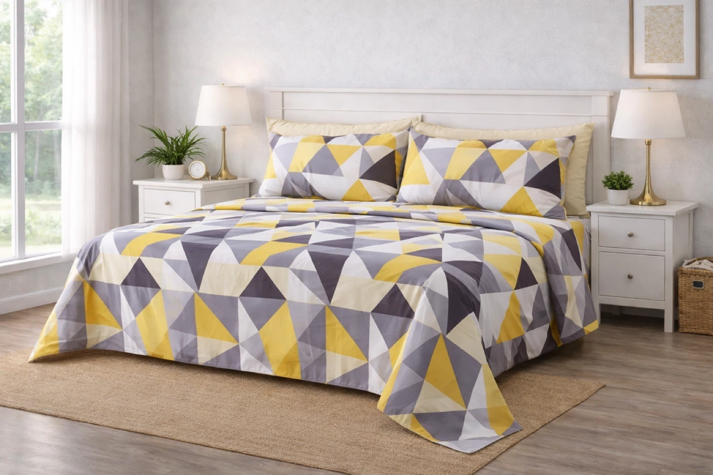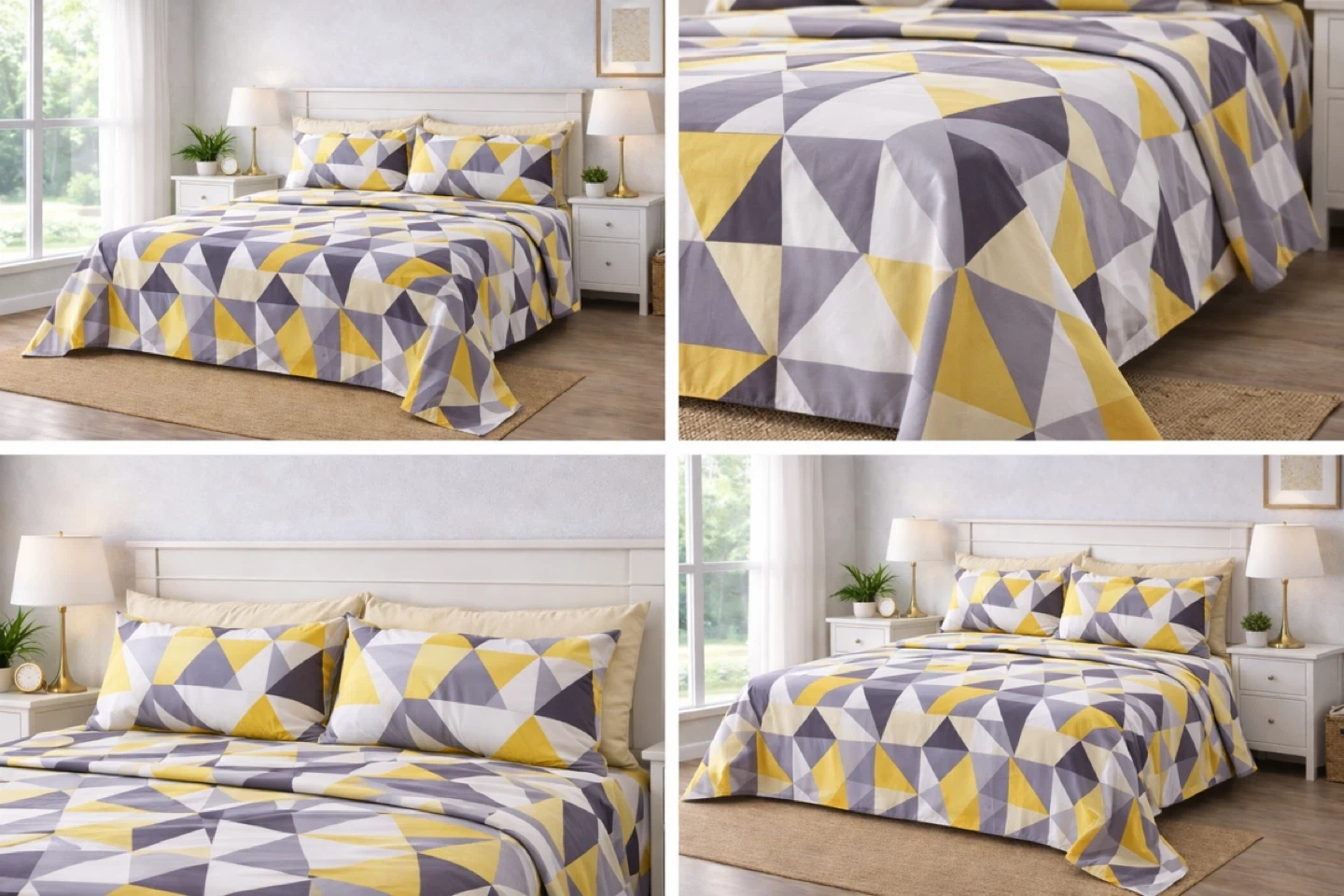 This Brand New Queen size 6-piece bedsheet set features a modern geometric pattern in grey, yellow, and white. It includes 1 flat sheet, 1 fitted sheet, and 4 pillow covers. This set's eye-catching design can refresh any bedroom's look!