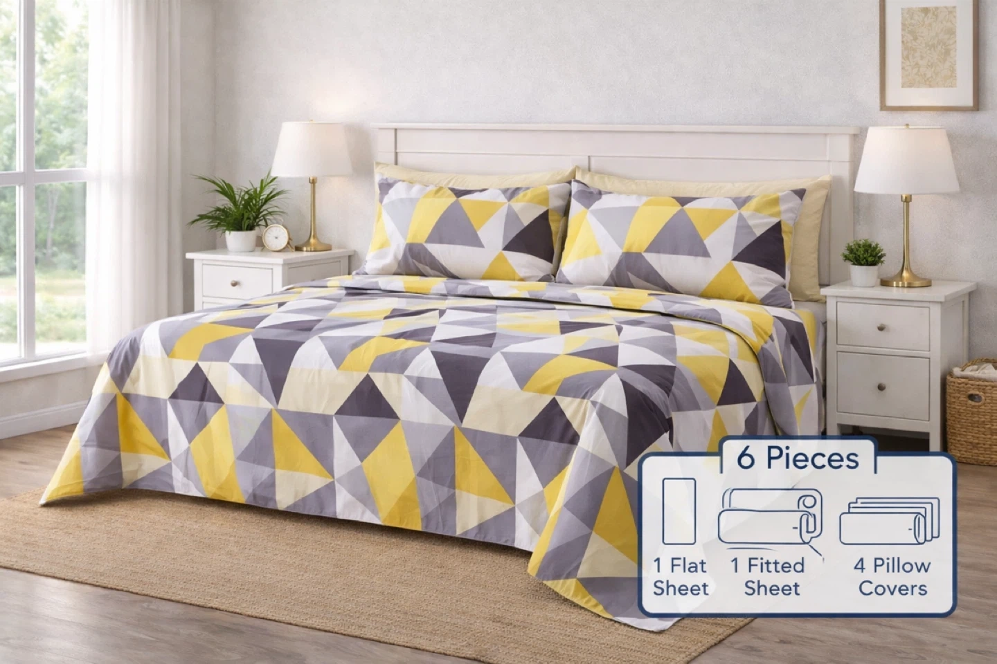 This Brand New Queen size 6-piece bedsheet set features a modern geometric pattern in grey, yellow, and white. It includes 1 flat sheet, 1 fitted sheet, and 4 pillow covers. This set's eye-catching design can refresh any bedroom's look!