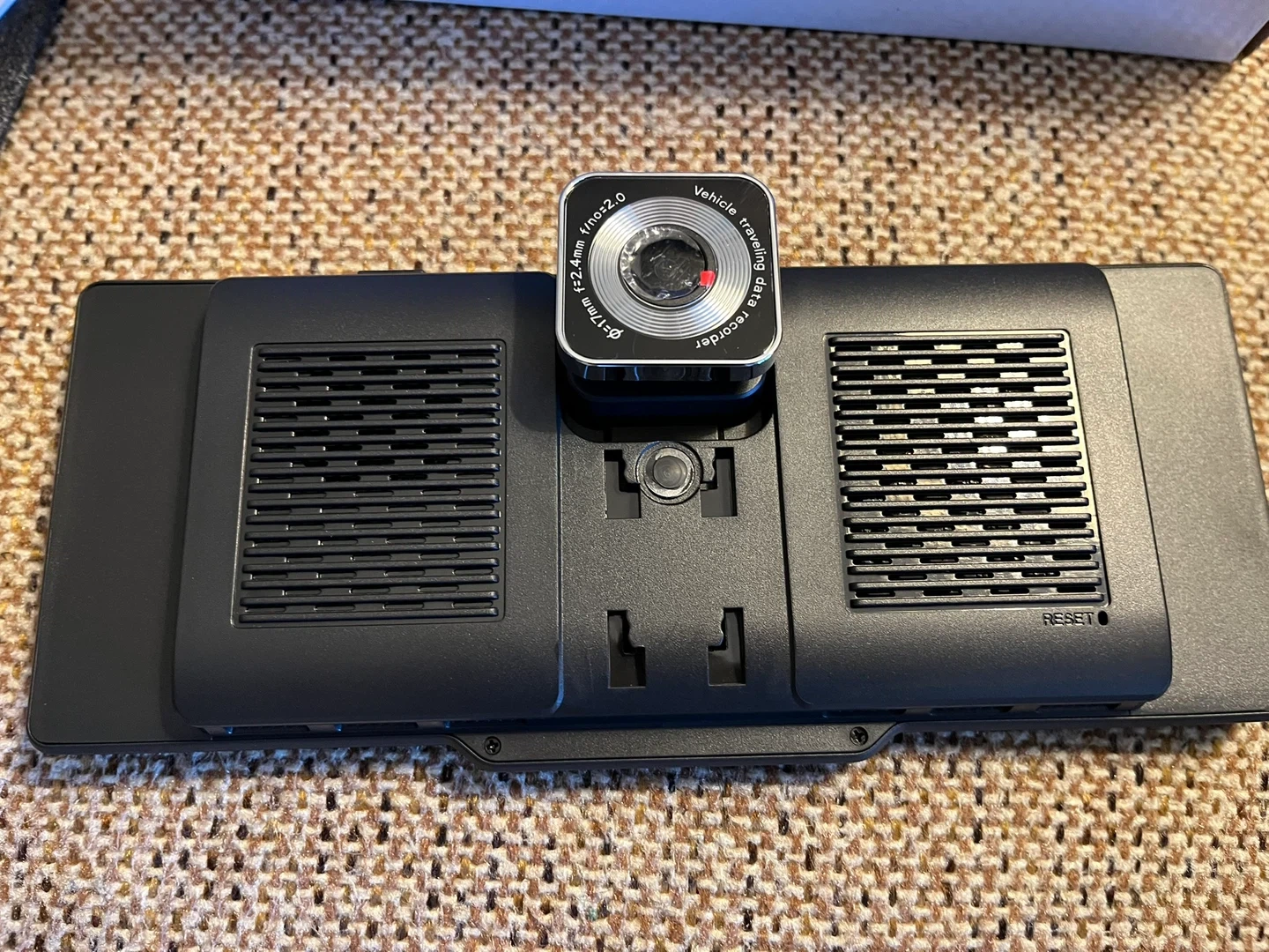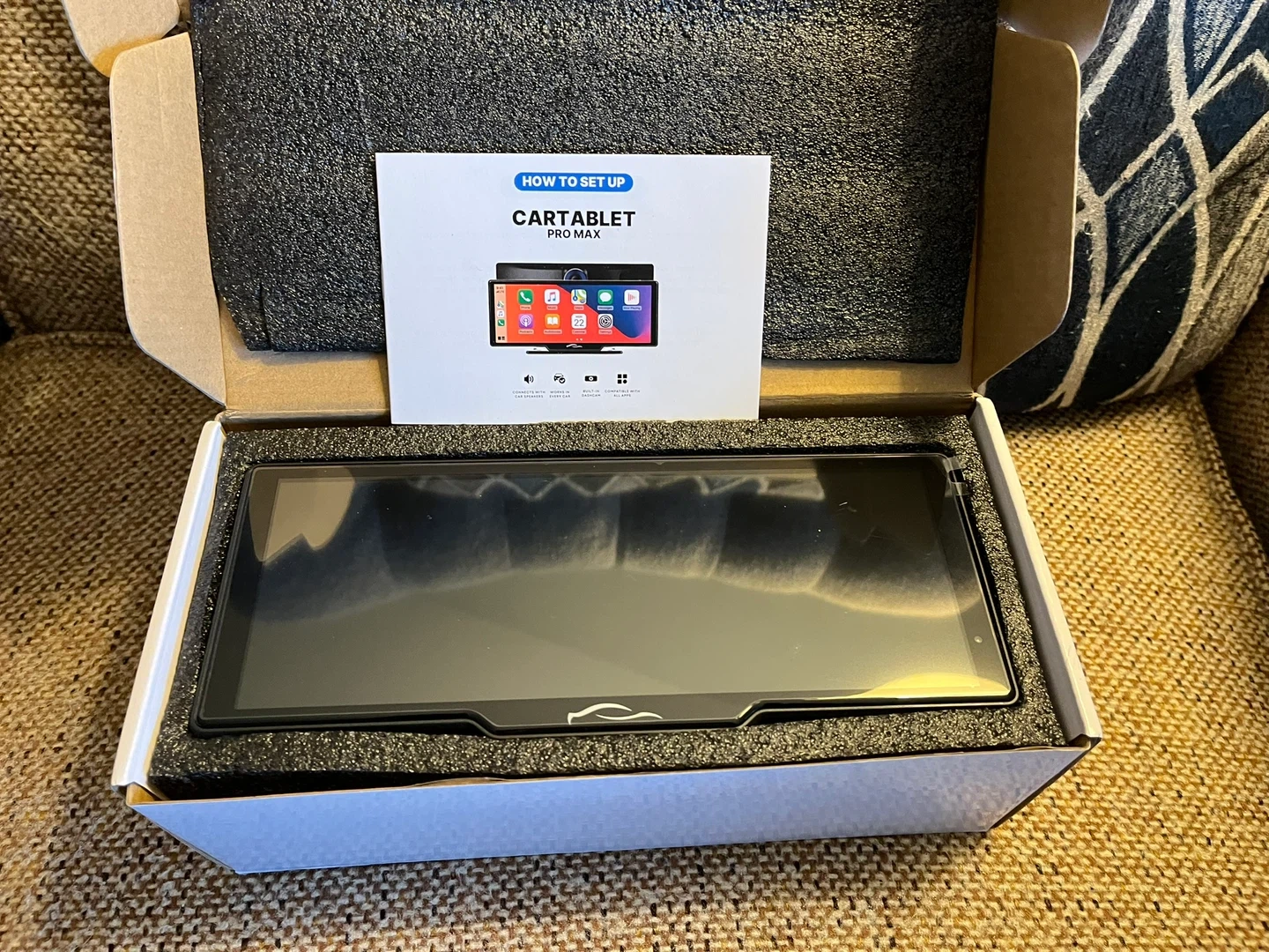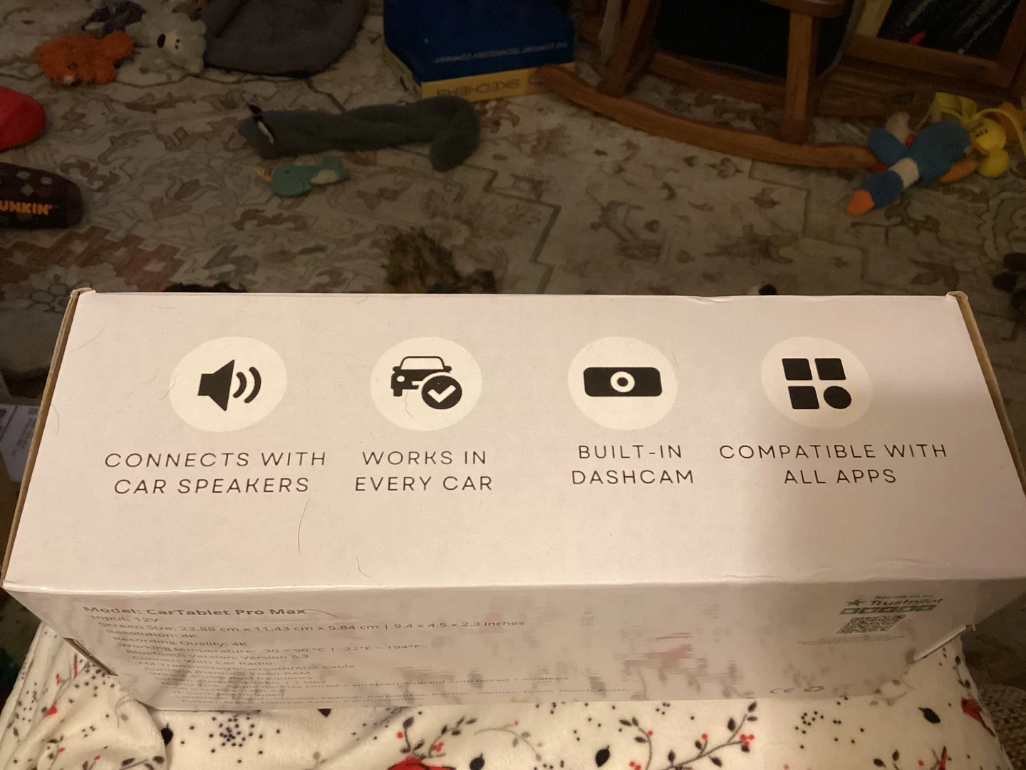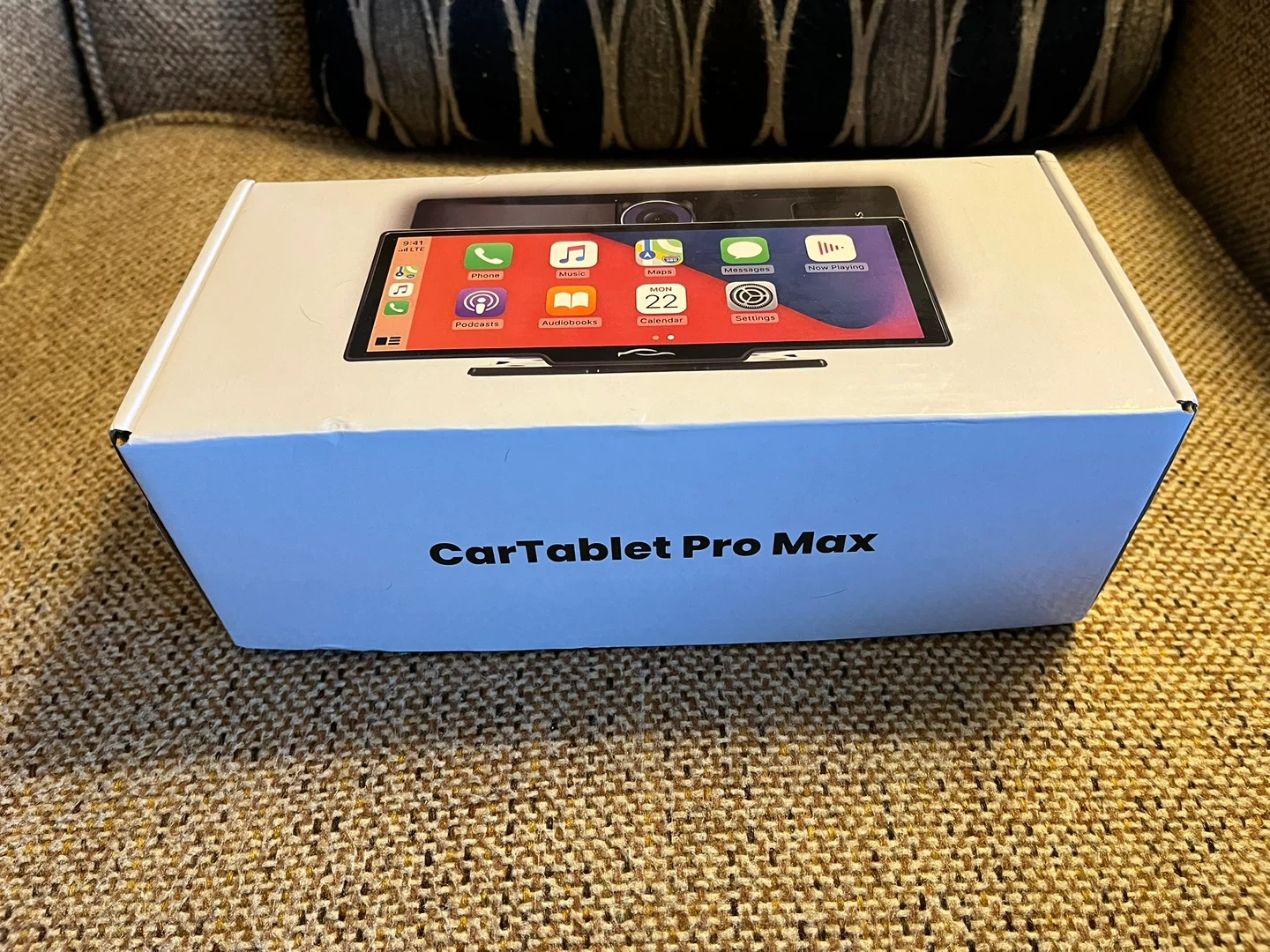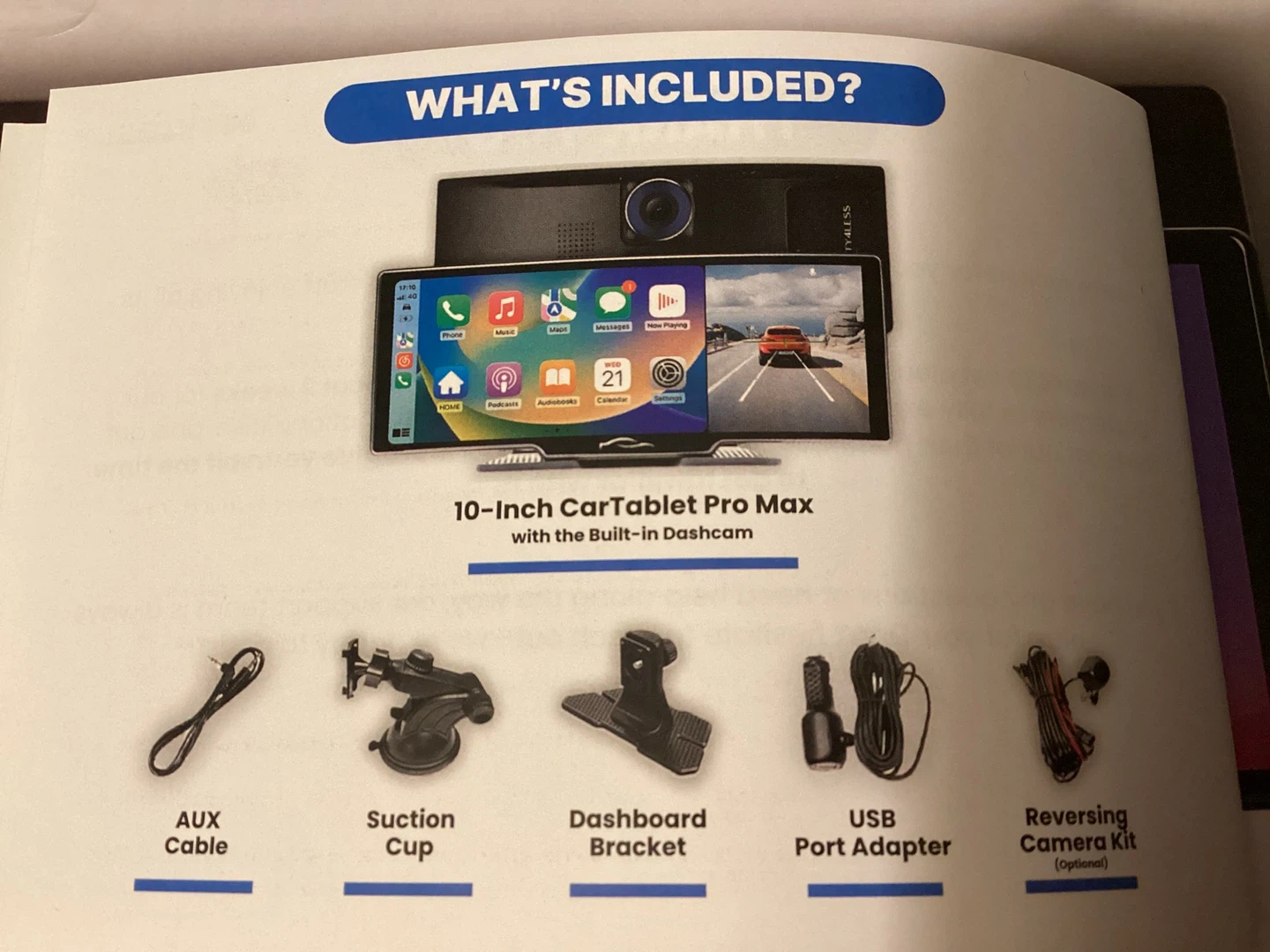 10-inch CarTablet Pro Max with a built-in dashcam. Screen size is 23.88 cm x 11.43 cm. It connects with car speakers and works in every car. Includes AUX cable, suction cup, dashboard bracket, USB port adapter, and optional reversing camera kit. Brand new in the box. Paid $153.53. Includes mounting brackets, back-up camera and all necessary wiring harnesses.