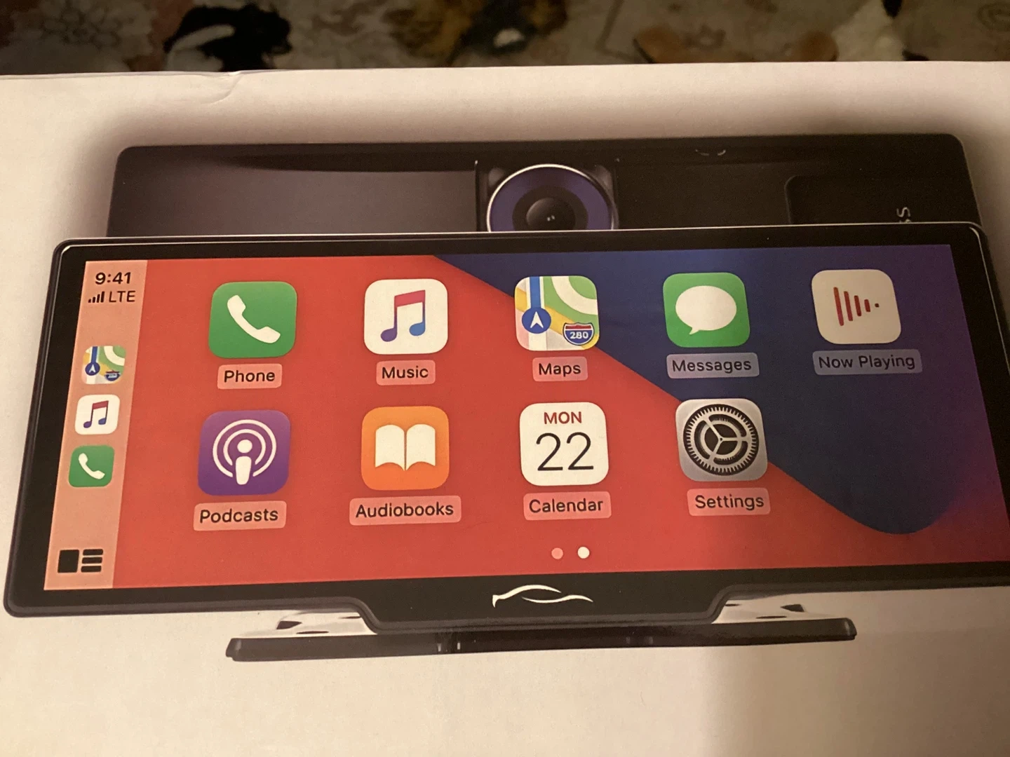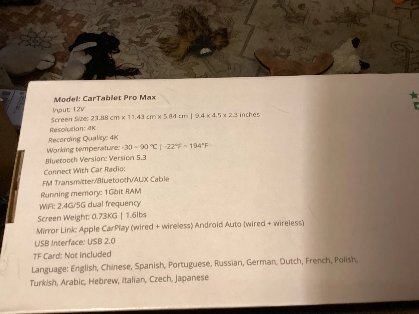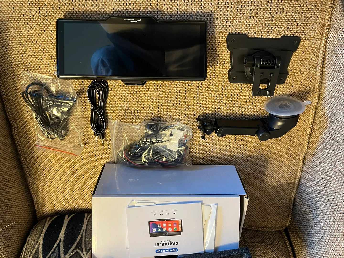 10-inch CarTablet Pro Max with a built-in dashcam. Screen size is 23.88 cm x 11.43 cm. It connects with car speakers and works in every car. Includes AUX cable, suction cup, dashboard bracket, USB port adapter, and optional reversing camera kit. Brand new in the box. Paid $153.53. Includes mounting brackets, back-up camera and all necessary wiring harnesses.