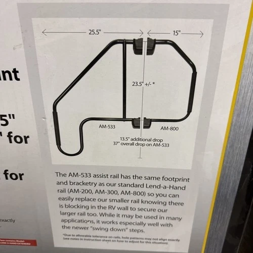 Enhance your RV experience with the Stromgberg Carlson Extended Lend A Handrail in sleek black, model number AM-533. Designed for durability and ease of use, this handrail provides added safety and convenience when navigating your RV's exterior. Crafted by Stromgberg Carlson, a trusted name in recreational vehicle accessories, this extended handrail is a practical addition to your camping gear. It features a robust construction and comes with a manufacturer part number of AM-533, ensuring a quality product.