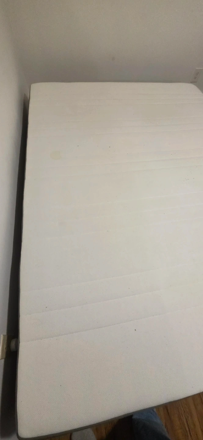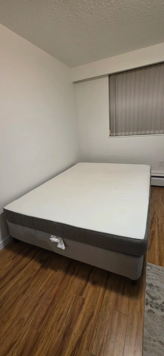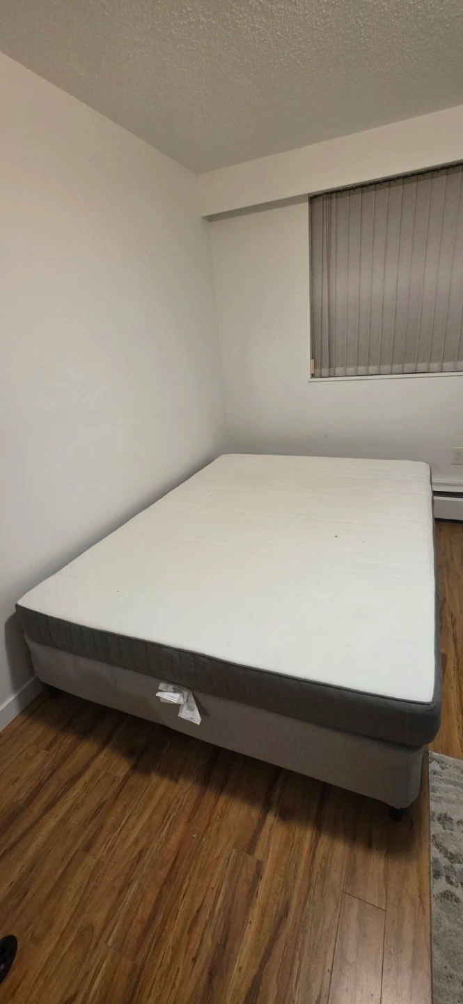 This queen size mattress has been used. It has few small stains but it's comfortable and still fully usable. Its comes with box spring.