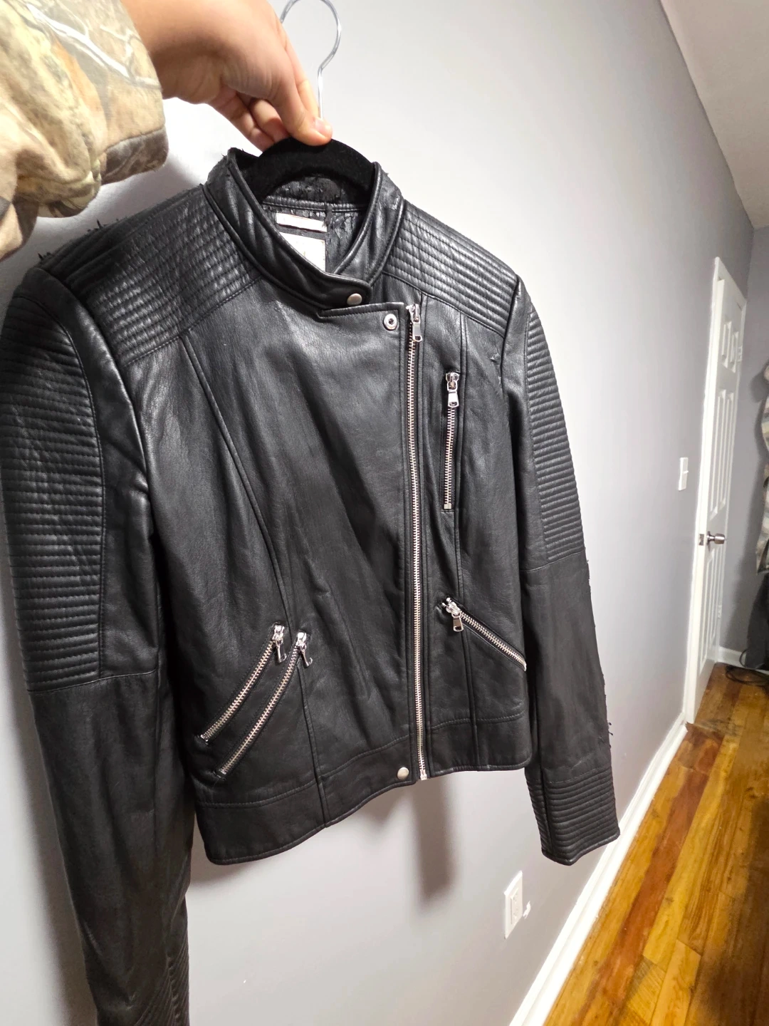ZARA TRF faux leather biker jacket in black. Features quilted detailing on shoulders and sleeves, with a zip-front closure and multiple zip pockets. It's a size small