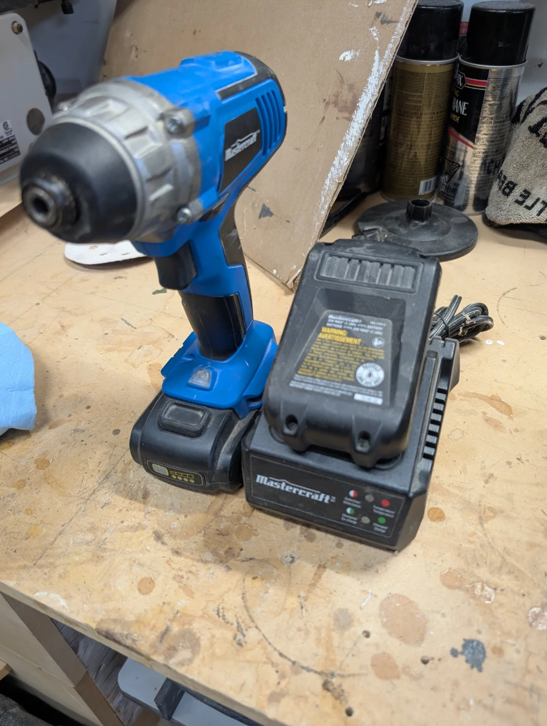 Mastercraft cordless impact wrench and charger included. Power tool is blue and black with silver accents. Battery charger has indicator lights for charging status.