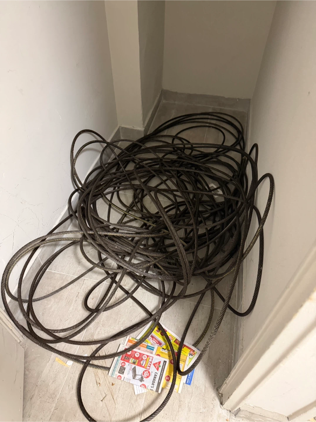 A large coil of heavy-duty steel cable. The cable appears to be made of braided steel strands for strength. It's suitable for various industrial or DIY applications where strong support or tension is needed. I have more more or less a ton