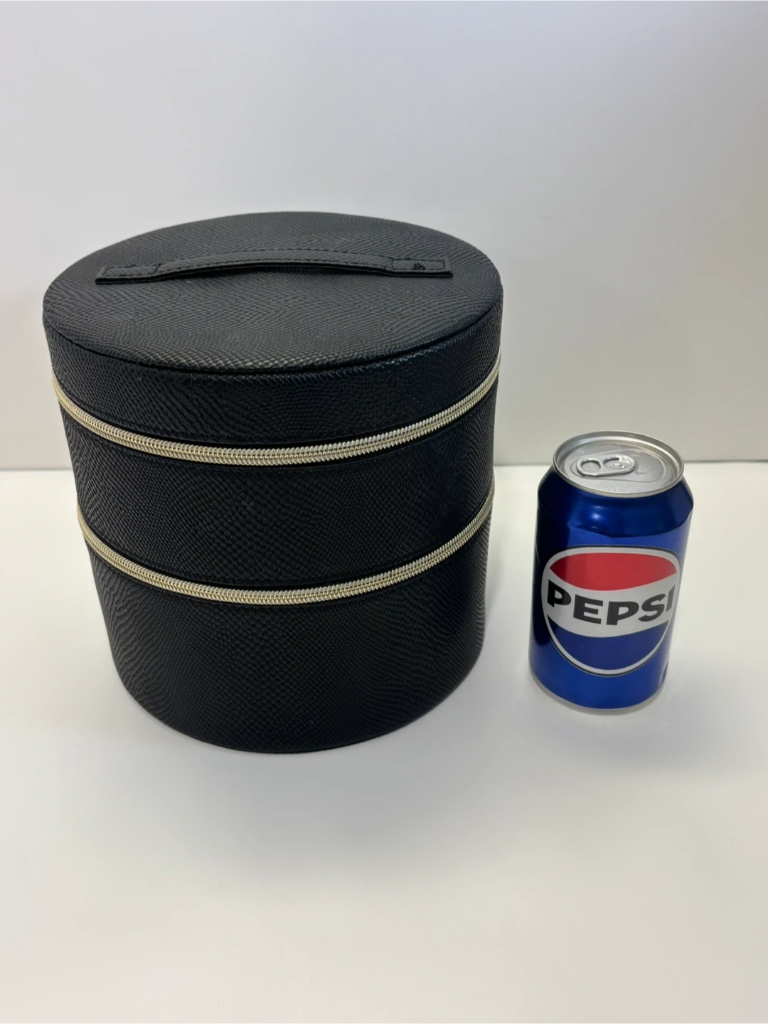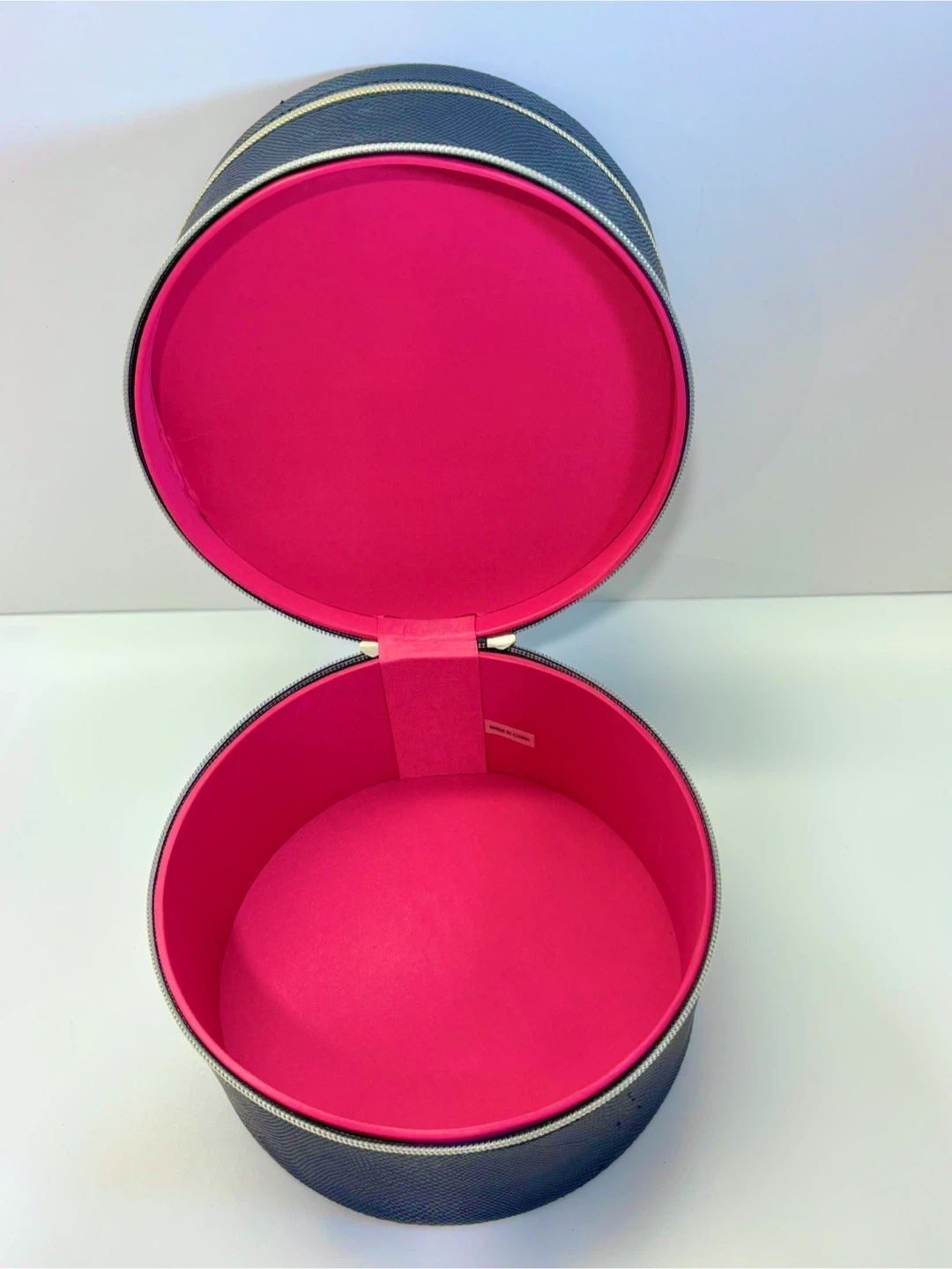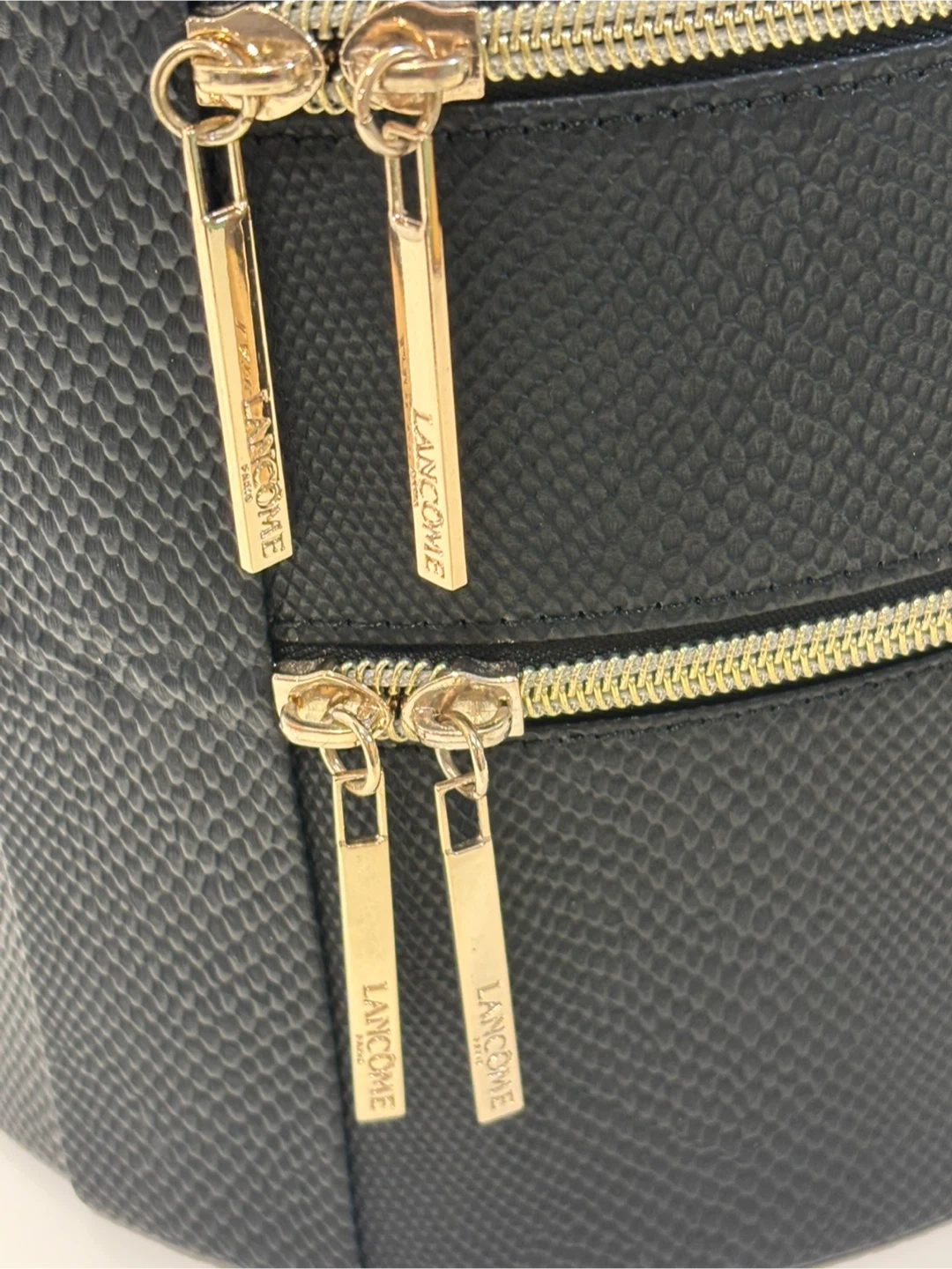 Lancome jewelry case or make up case is black with a textured finish. It features a bright pink interior lining and a mirror inside the lid. A double zipper closure secures the main compartment.