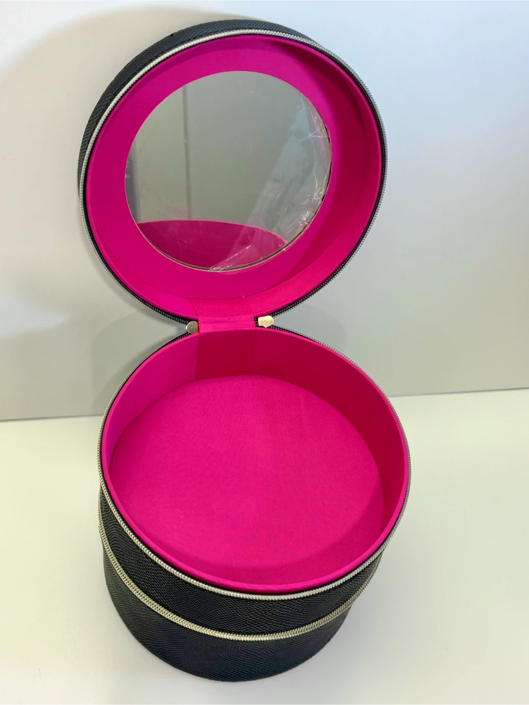 Lancome jewelry case or make up case is black with a textured finish. It features a bright pink interior lining and a mirror inside the lid. A double zipper closure secures the main compartment.