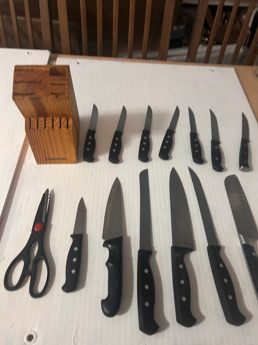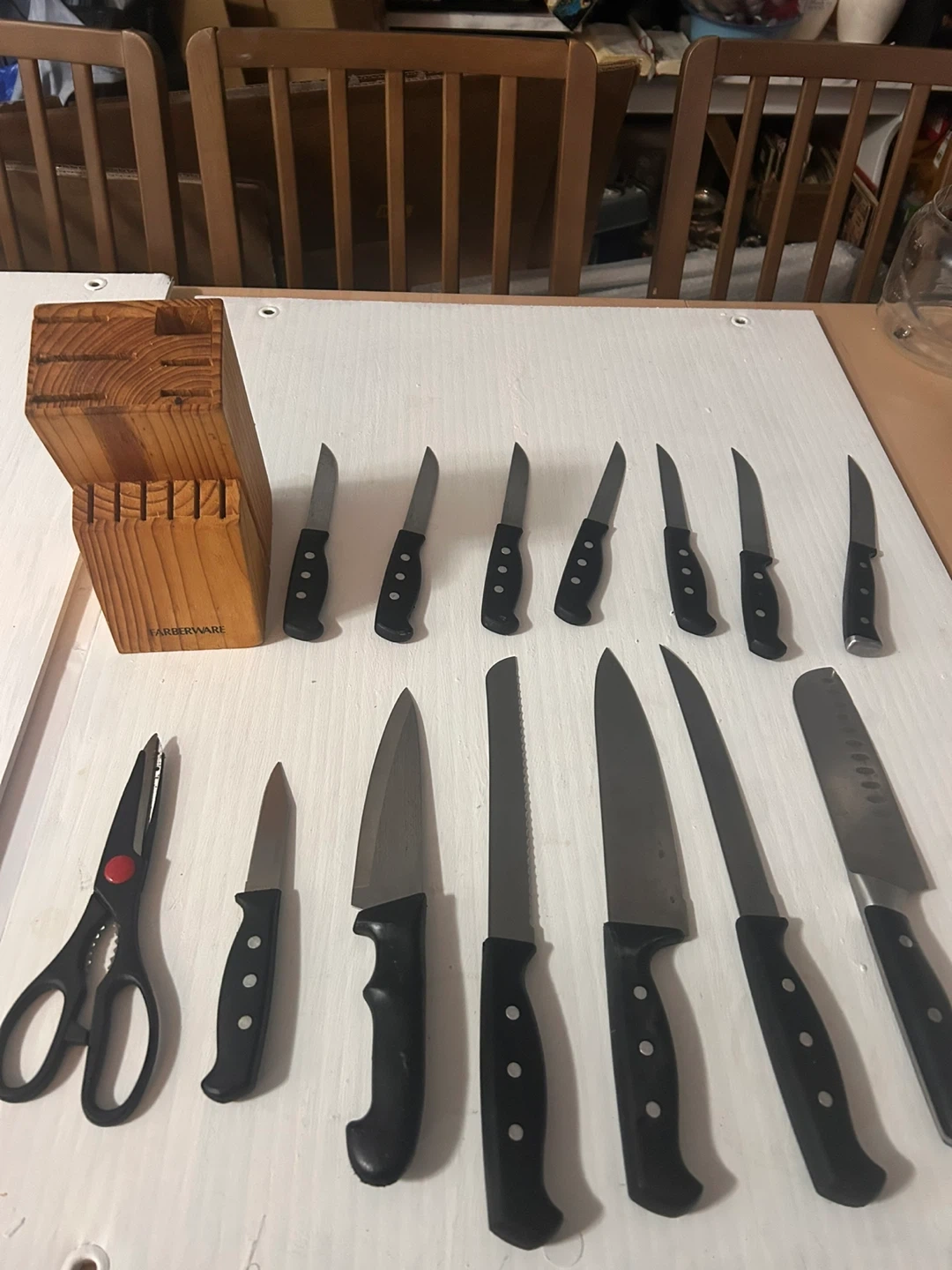 91Selling a Farberware 13-piece knife set with a wooden block! The set includes various knives suitable for different cutting tasks and a pair of kitchen shears