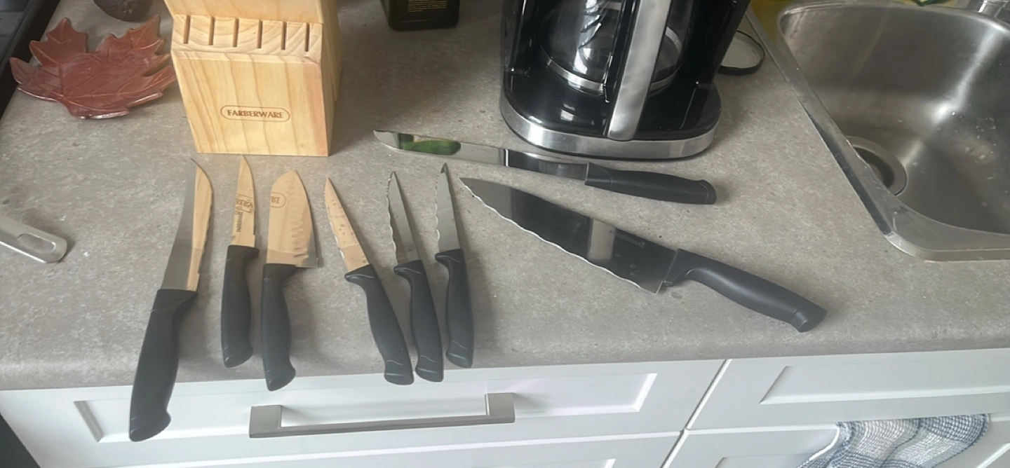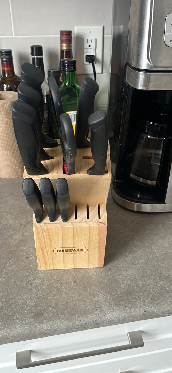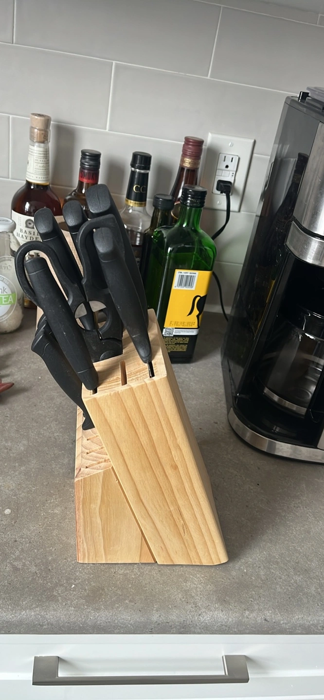 95Wooden block knife set. Includes various knives. Black handles. Good for everyday use. Located at Kingsway and Royal york