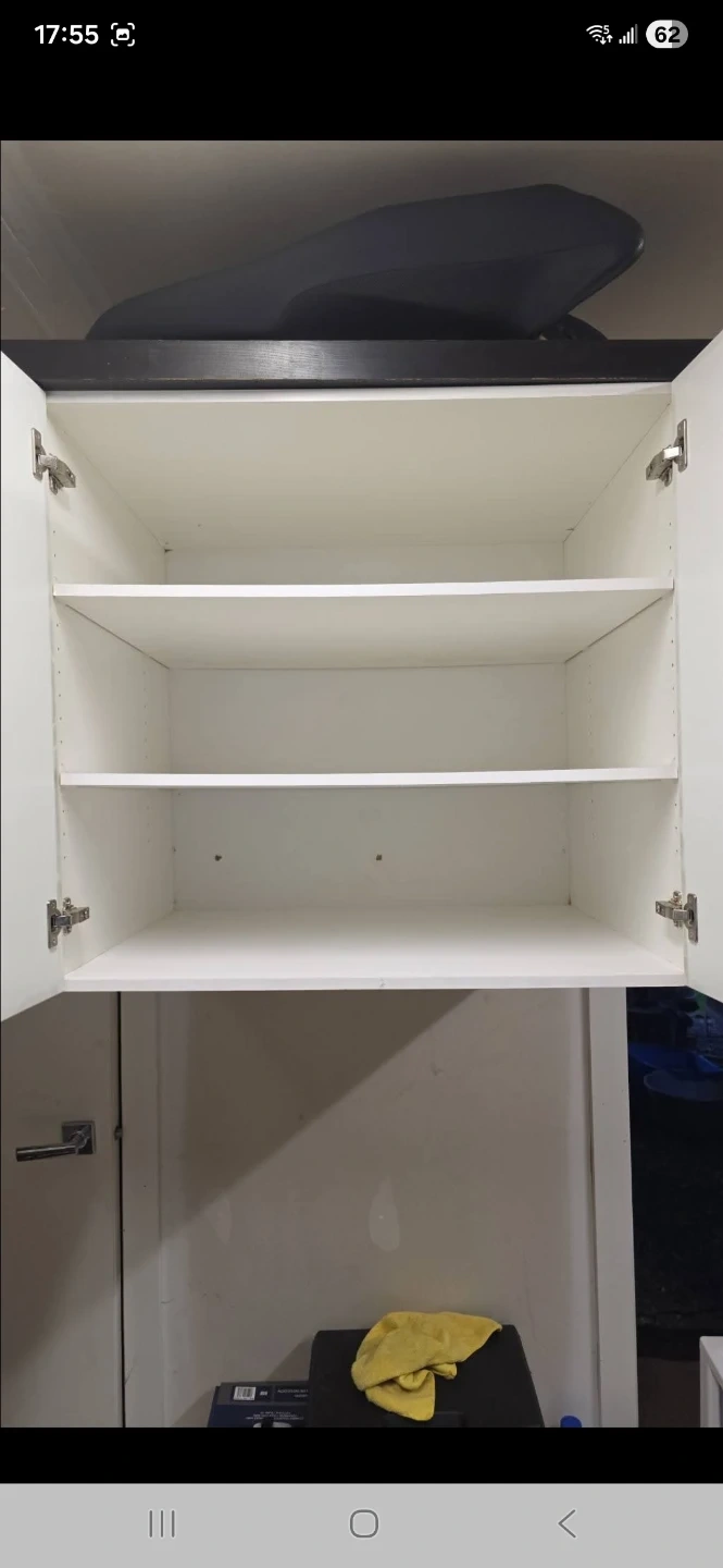 This is a clean, white wall cabinet. It's got three spacious shelves inside. Perfect for organizing your kitchen or pantry!
