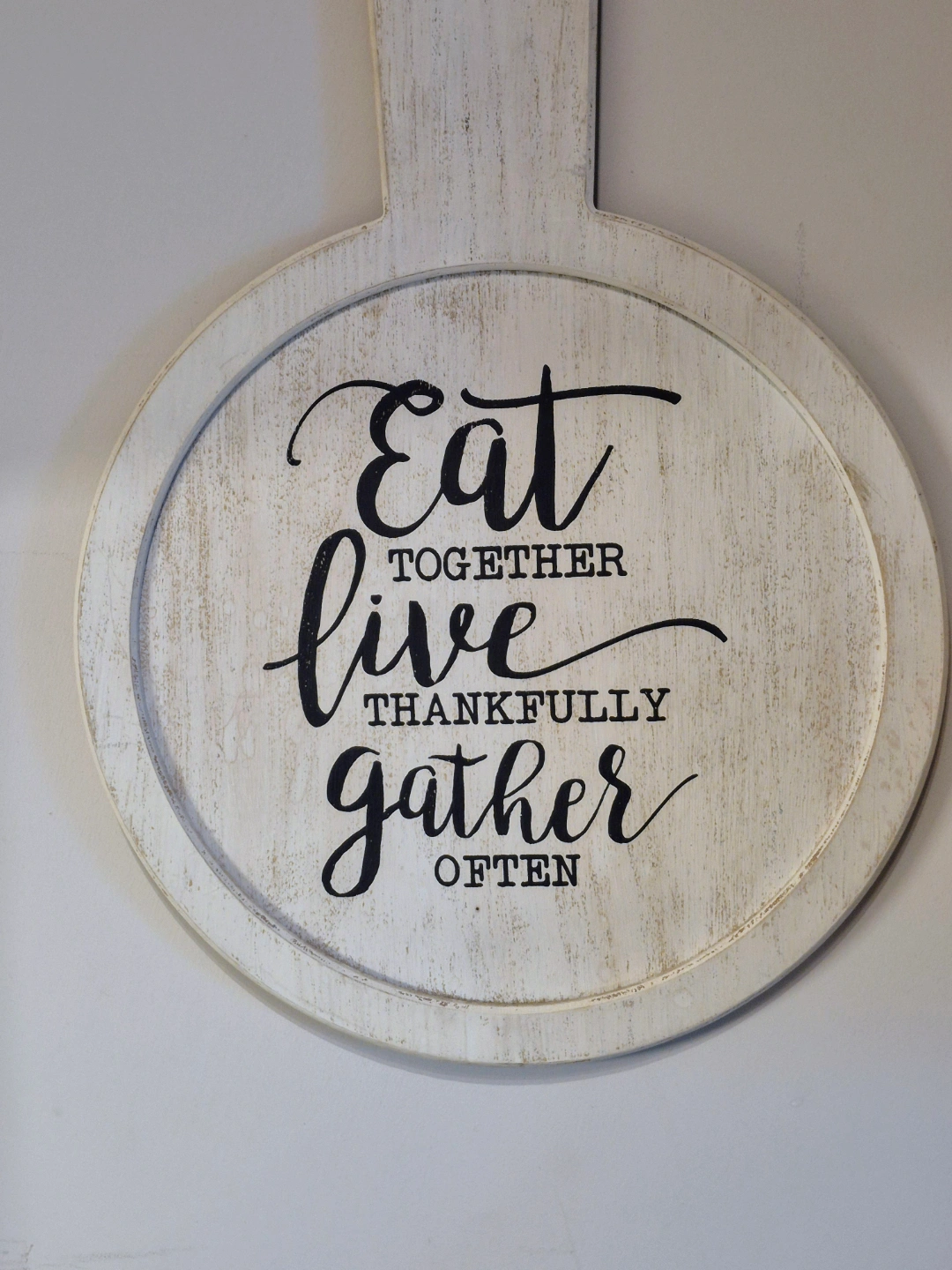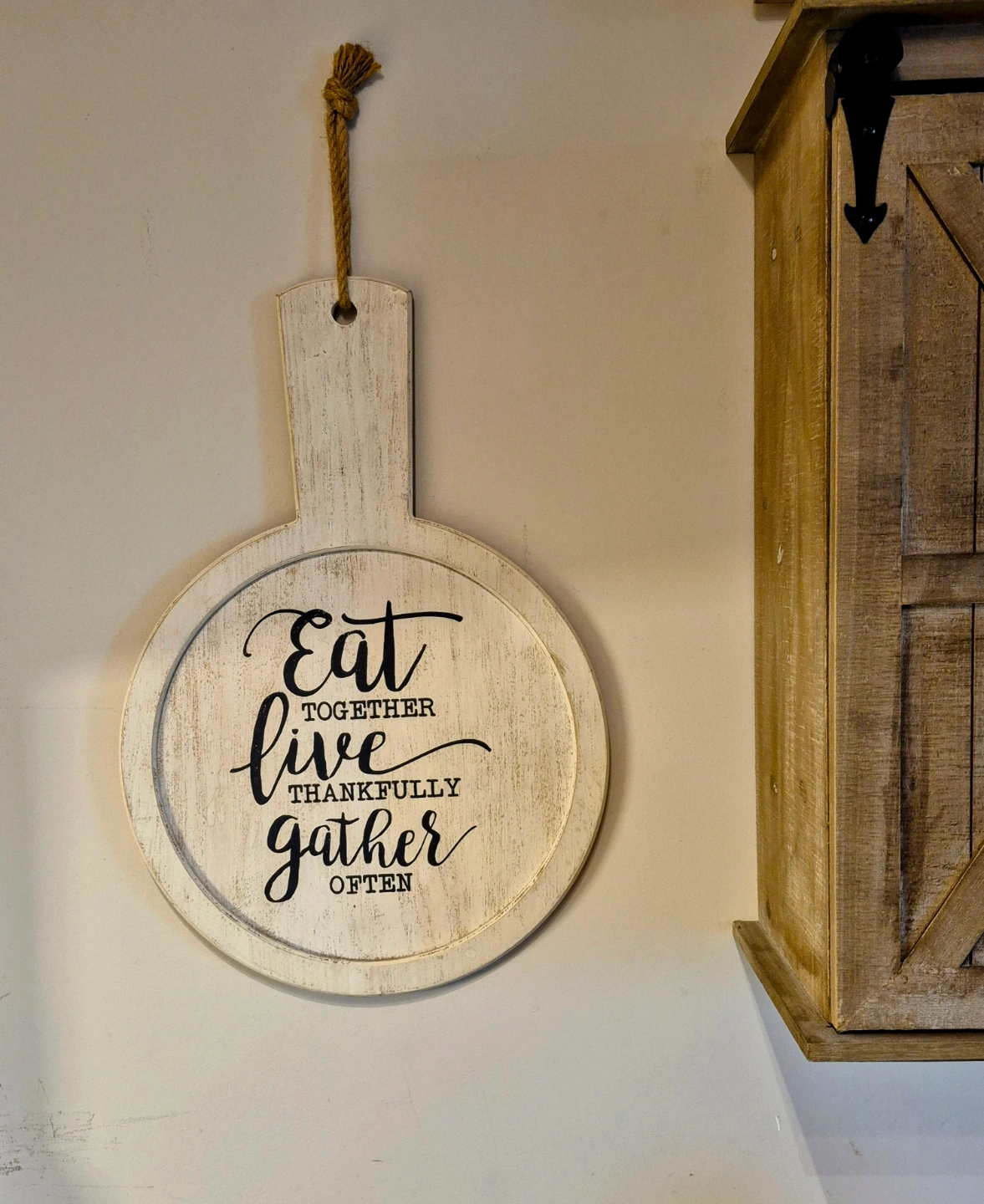 145Round wooden wall hanging. Distressed white finish. Features inspirational quote. Rope hanger.