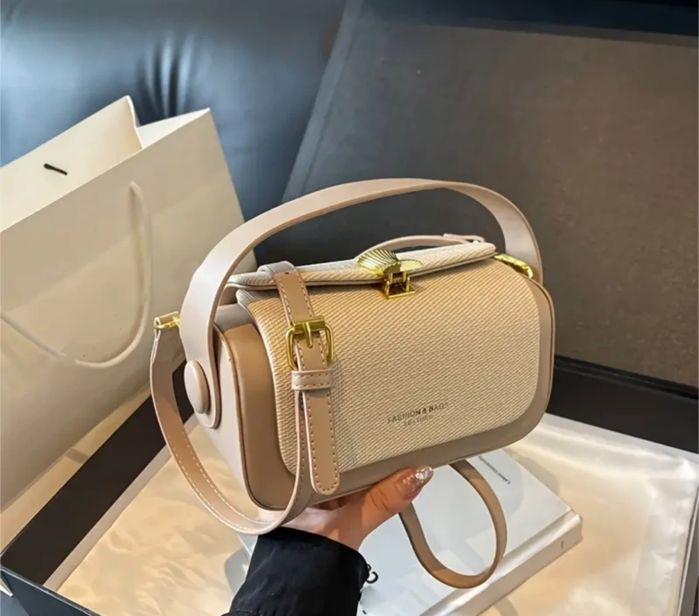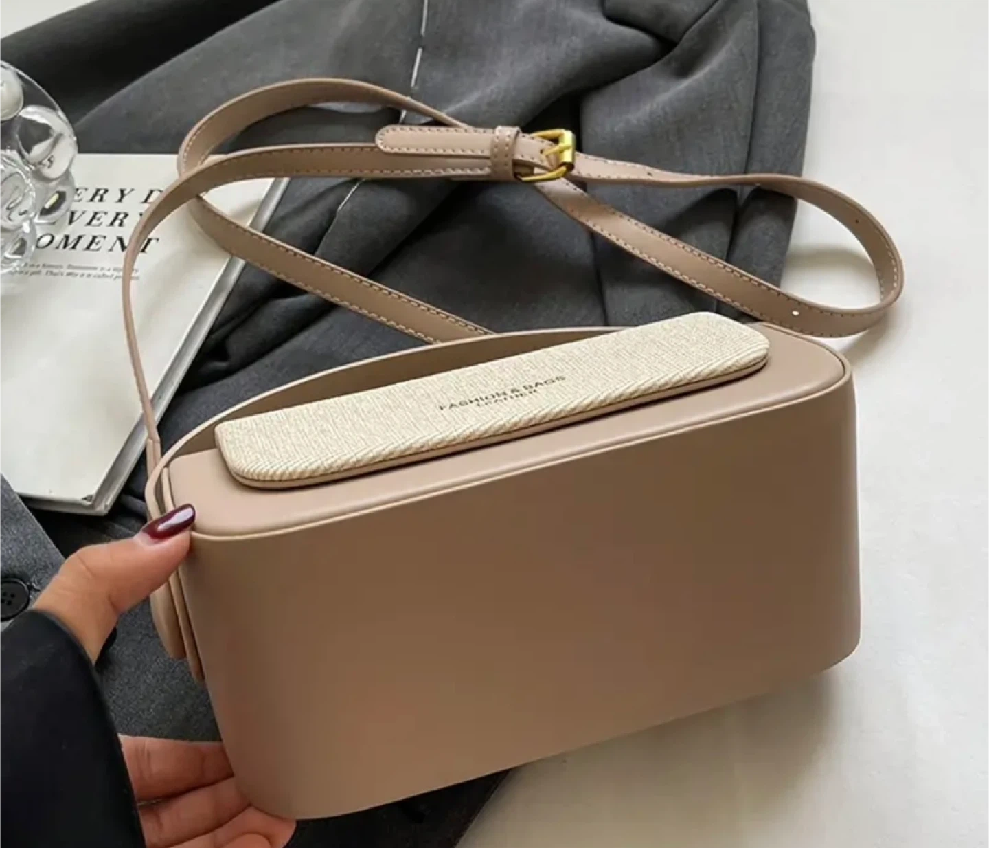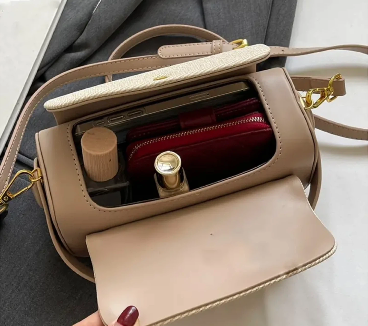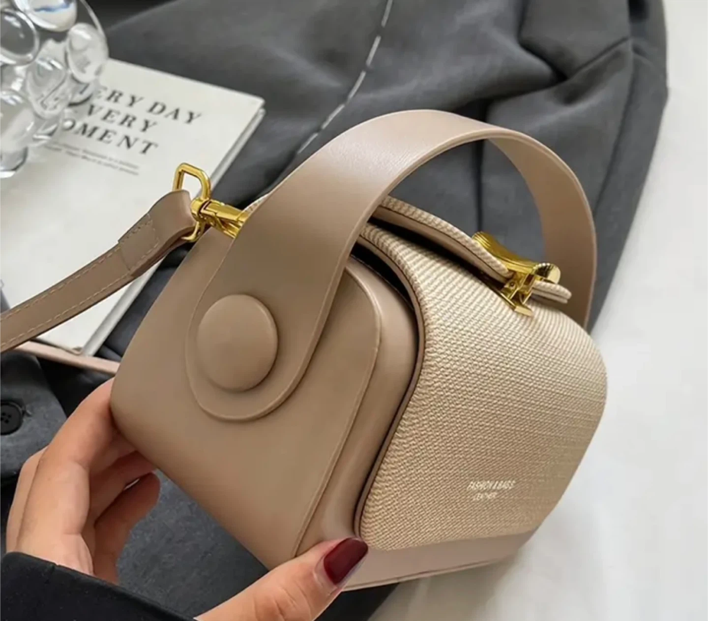 This is a cute crossbody bag with a unique design. The material is leather and it has a nice neutral color. It's perfect for carrying your essentials!