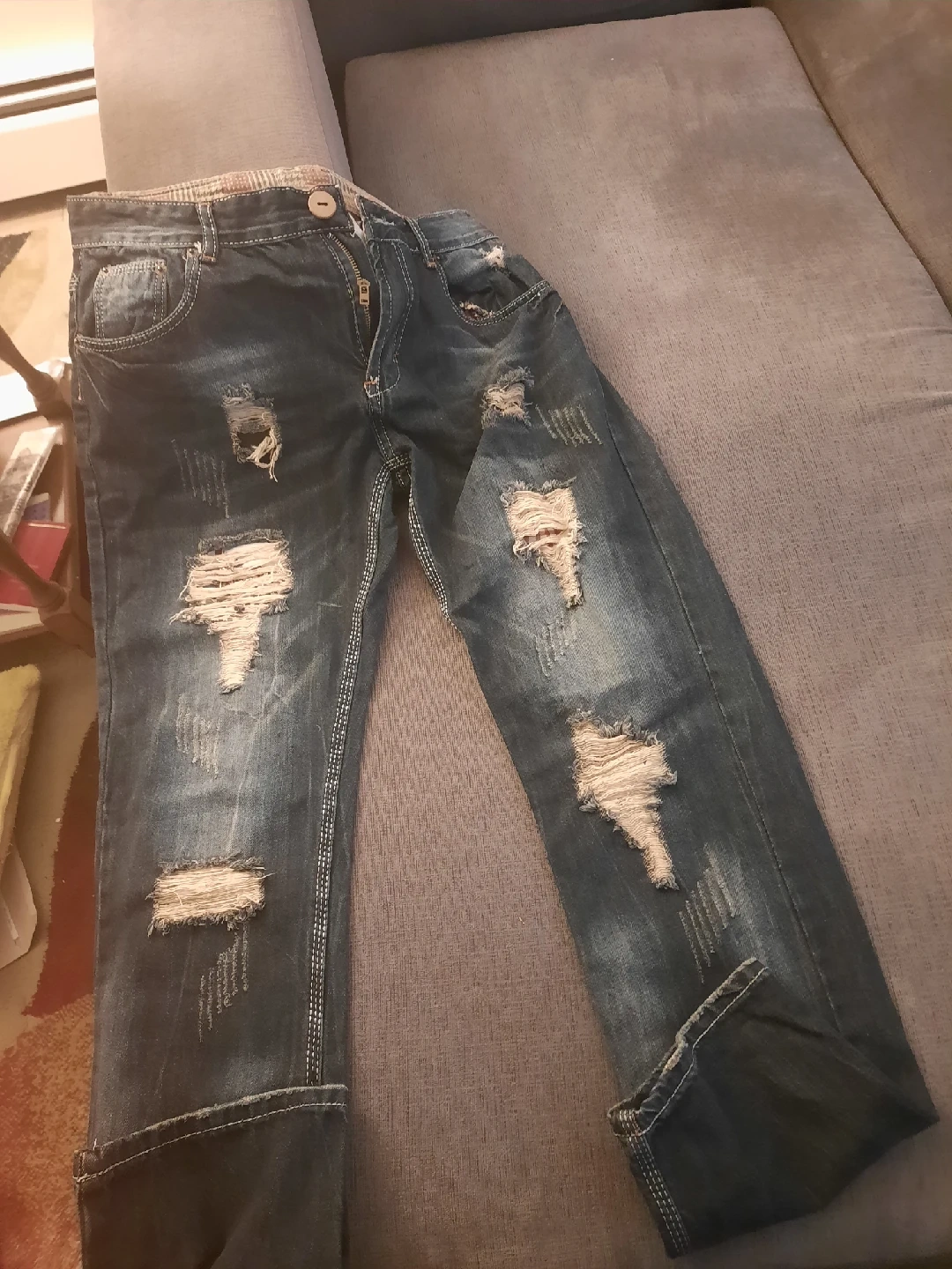 Style: They are characterized by several large, ripped, and frayed areas on the front of both legs, which is a style known as "distressed" or "ripped" jeans.size 34. They have a distressed, ripped look. Good condition!