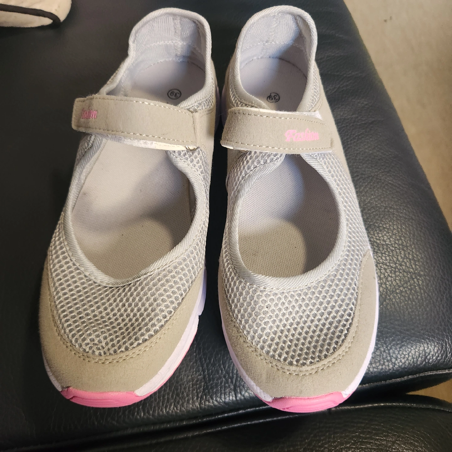 Grey Mary Jane style shoes with a velcro strap. The sole has a pink accent. They are in good condition and would be great for everyday wear! Size 39.I wore them twice, they are a little too tight for me. They are very comfy and super light.