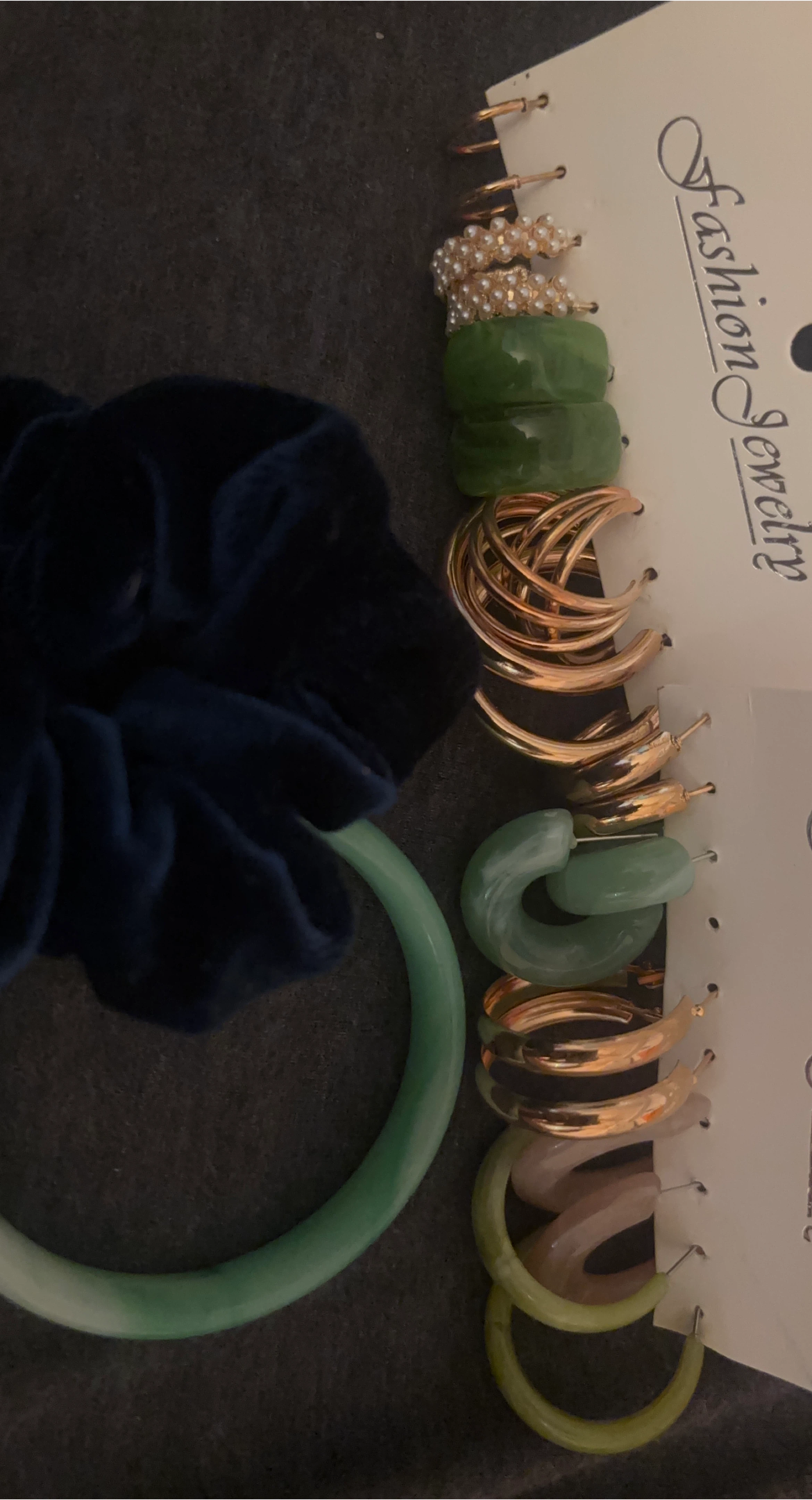 Selling a set of fashion jewelry hoop earrings. Includes various styles and colours. Nice had bangle(I’m including the free scrunchie)