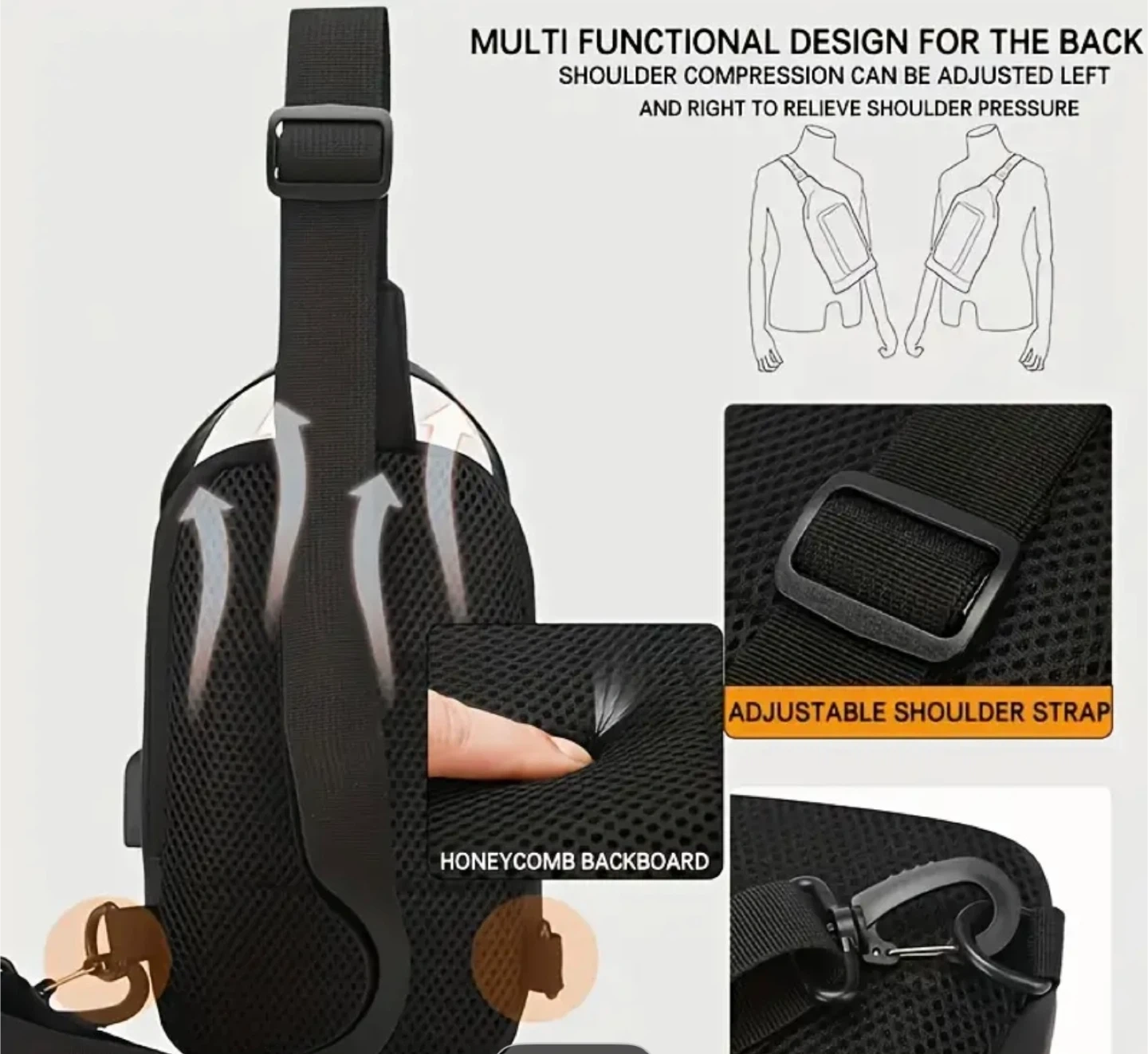10This black sling bag is perfect for everyday use. It features an adjustable shoulder strap and a honeycomb backboard for added comfort. The bag is designed with a multi-functional design for the back, providing shoulder compression to relieve shoulder pressure. It also has a USB charging port