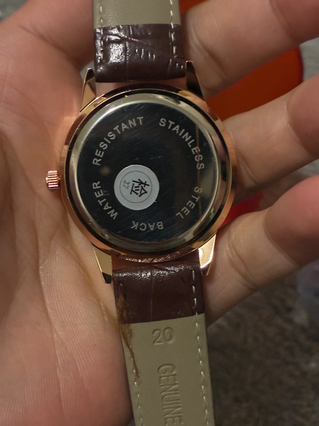 60Selling a fashion watch with a brown genuine leather strap. The watch features a stainless steel back and is water-resistant. The strap size is 20.