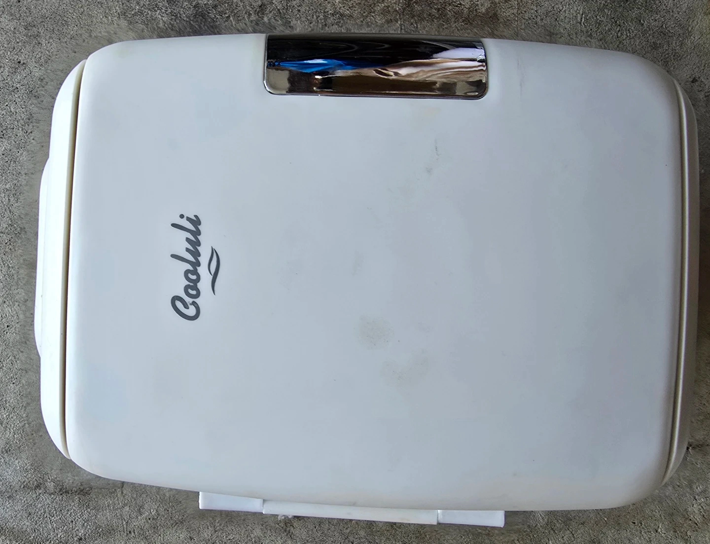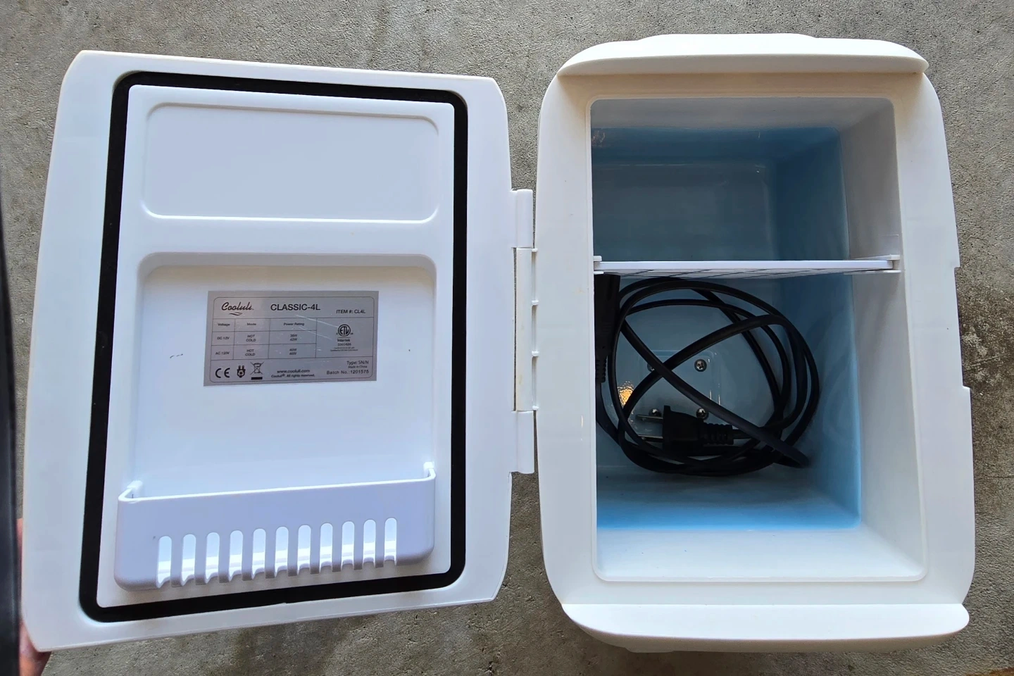 This is a white Cooluli Classic 4L mini fridge. It's a compact thermoelectric cooler, perfect for skincare or small beverages. It comes with a power cord for AC use. Great for personal use or travel!