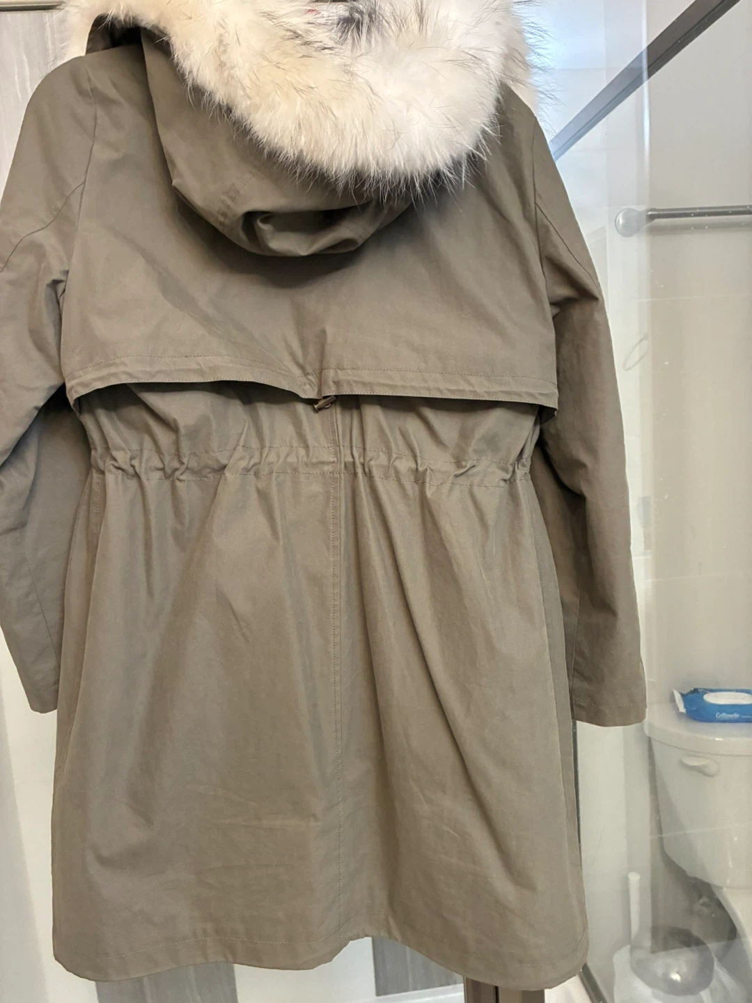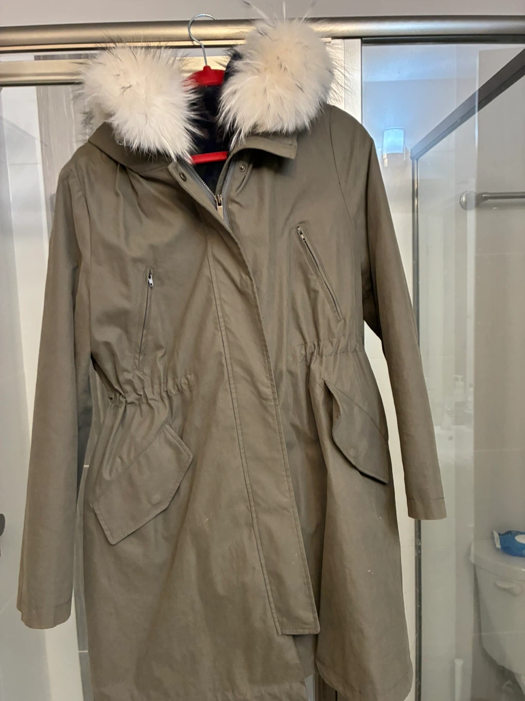 Selling winter coat in size small. It's in great condition and perfect for the cold Canadian winters! The coat features a fur-trimmed hood and a stylish design.