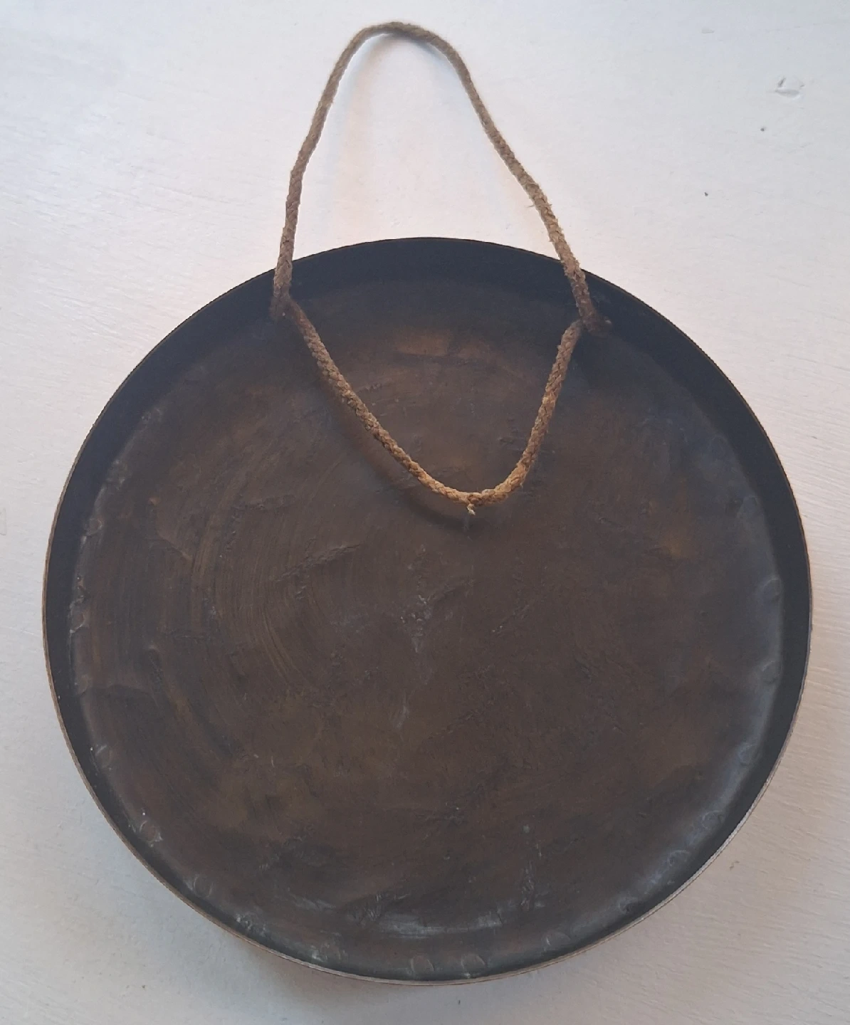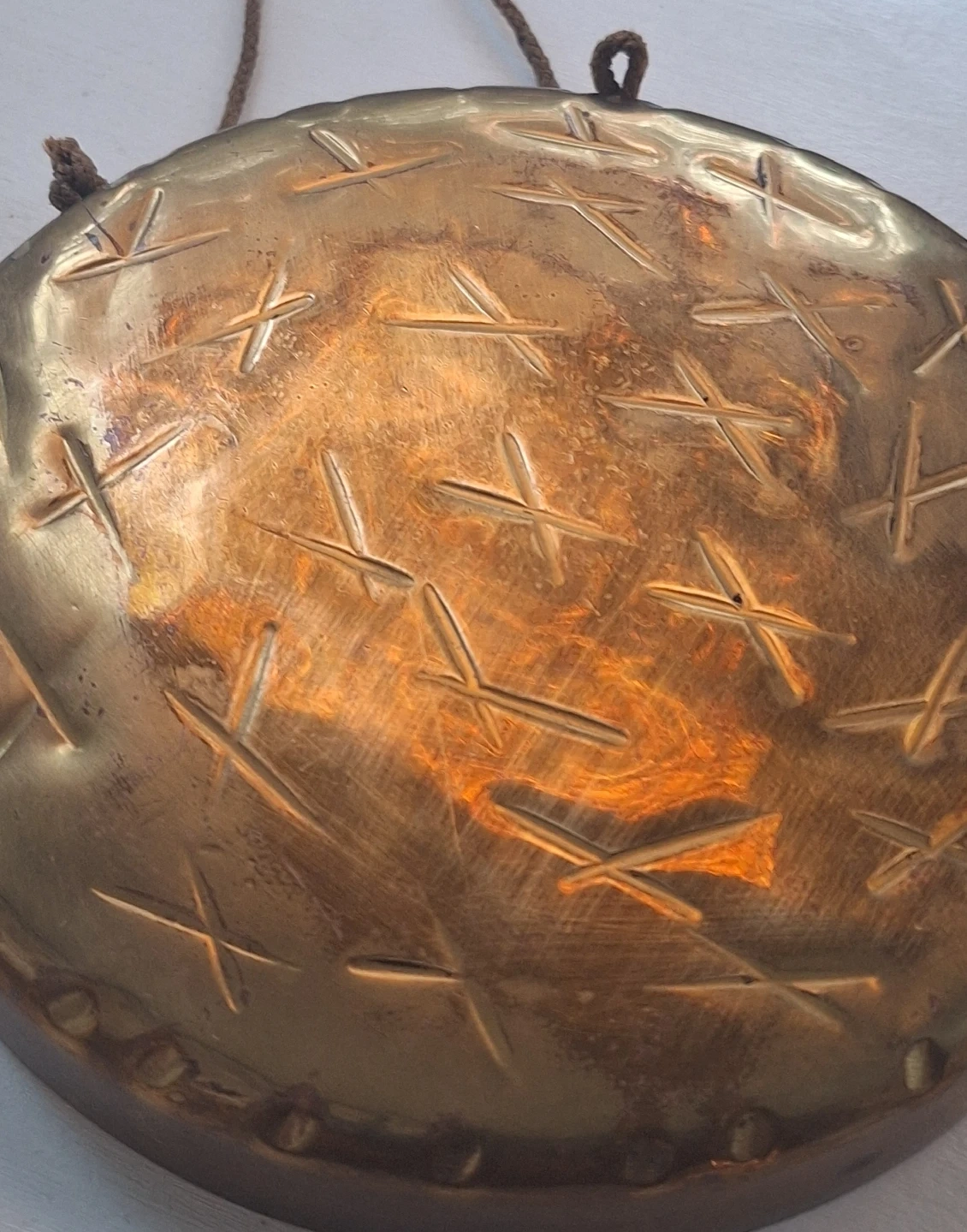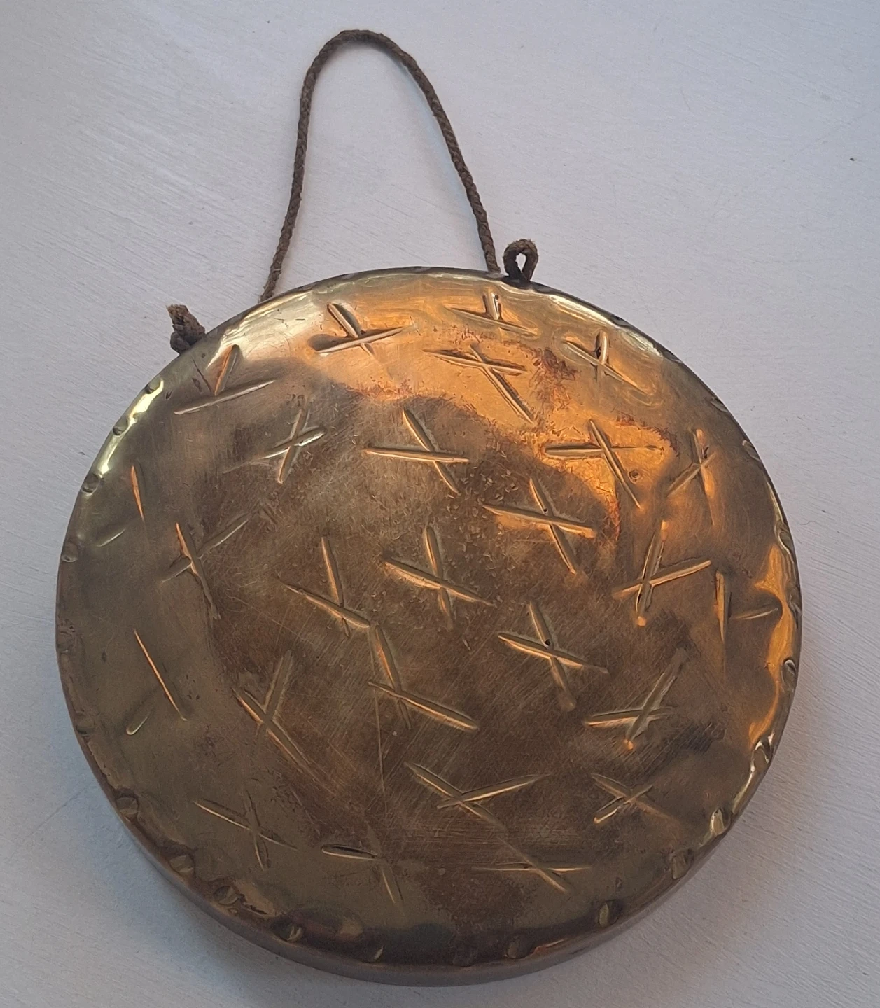 Unique brass wall hanging or brass dinner gong with etched star design. Adds a touch of vintage charm to any room!