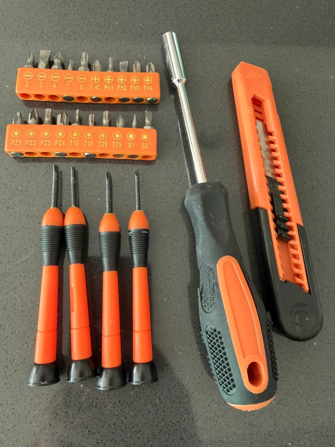 This set includes a screwdriver handle, a socket adapter, and two orange bit holders with various screwdriver bits. It also comes with a utility knife. Bits are labelled with sizes like PZ1, T15, and S2. A handy set for various repair tasks!