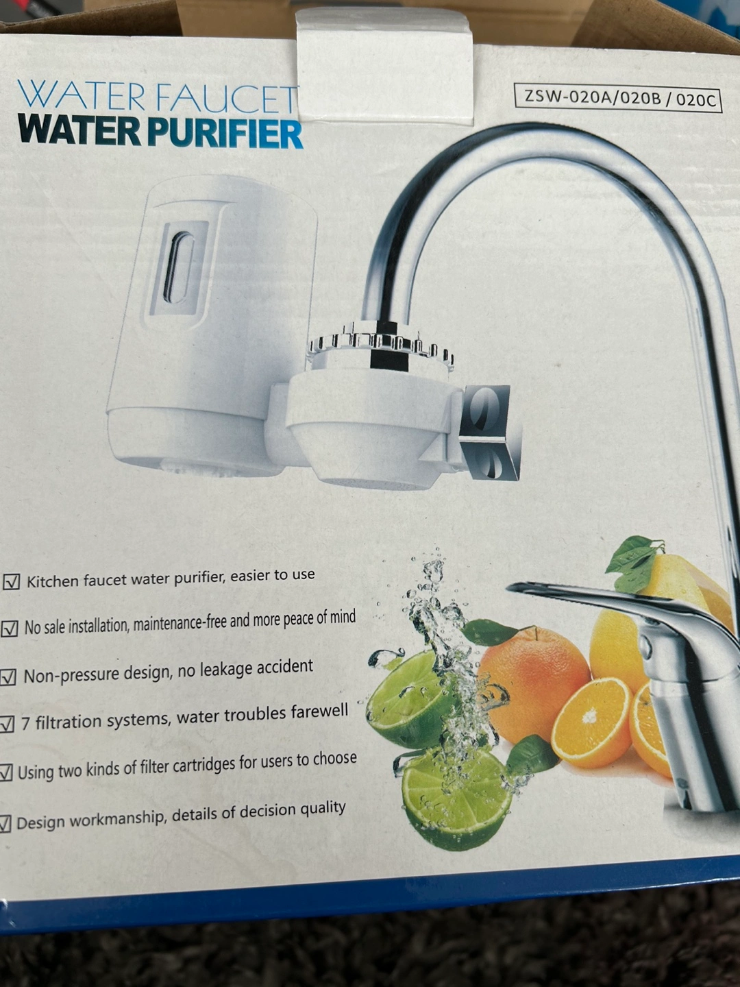 775New faucet water filter purifier. Easy installation. Seven filtration systems. Includes two filter cartridges. Reduces chlorine and bad taste. Rapid flow. 400 gallons.
