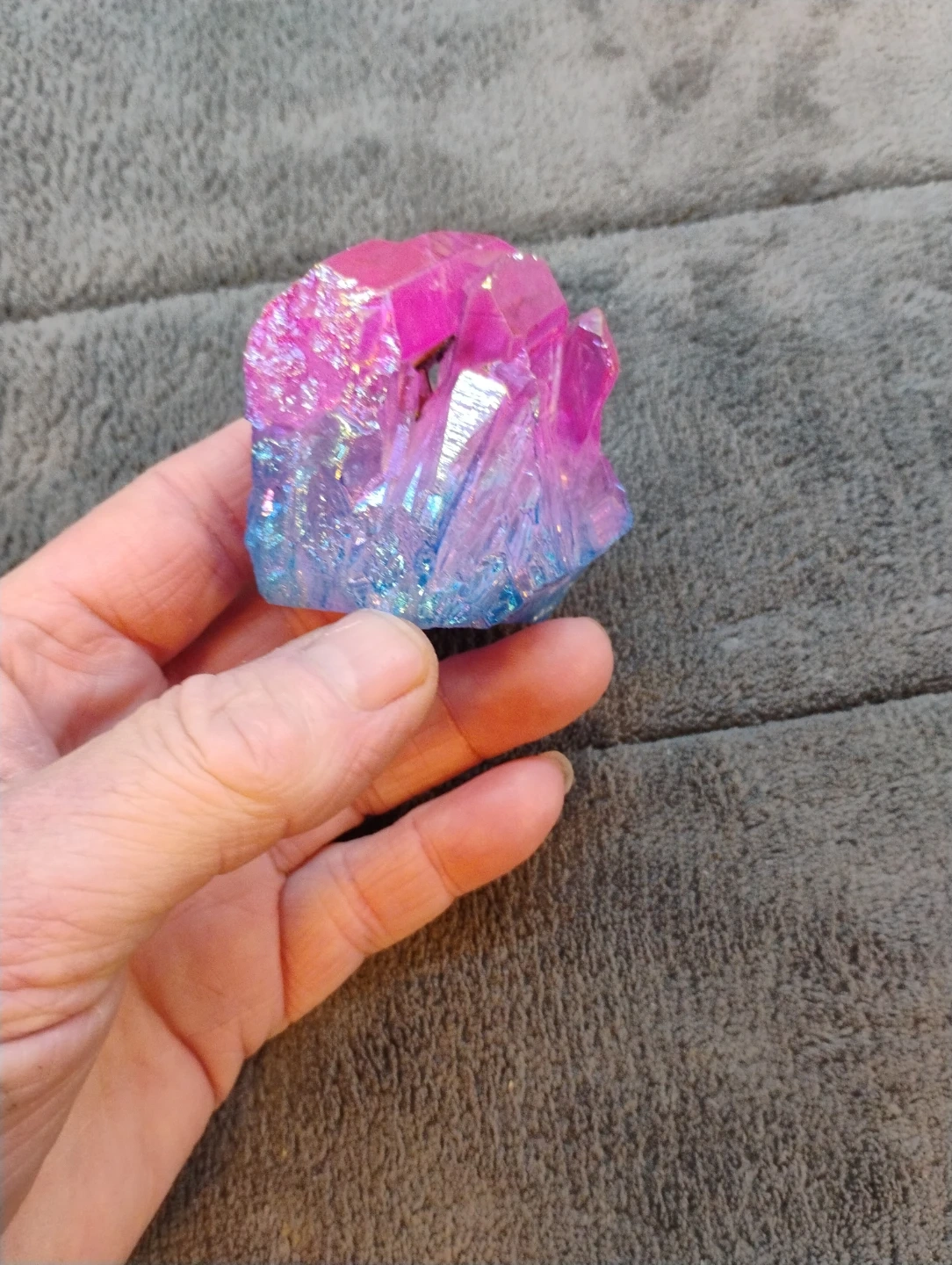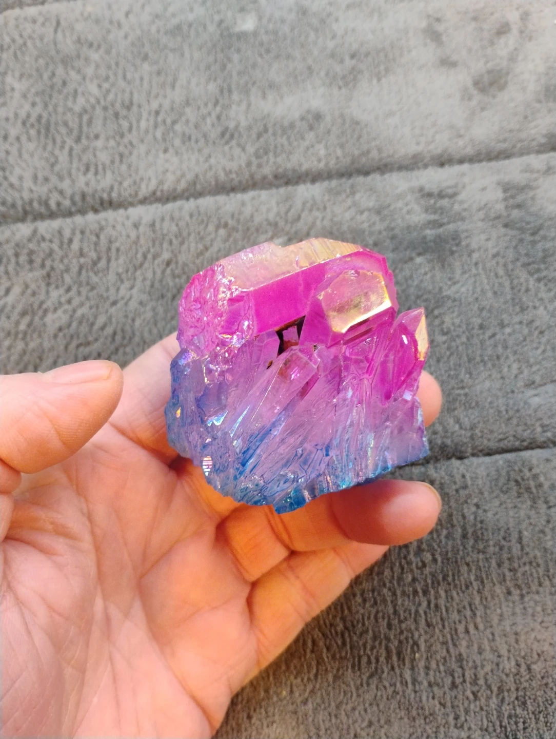 Here's a beautiful aura quartz crystal with a stunning pink and blue gradient! It's a lovely piece to add to any collection or as a unique decorative item for your space