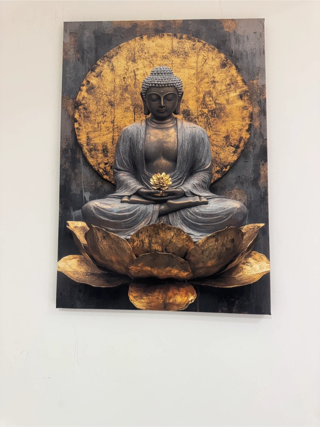 This is a Buddha canvas wall art piece. It features a Buddha figure in a meditative pose, set against a gold and black background. It would be a great addition to any room!