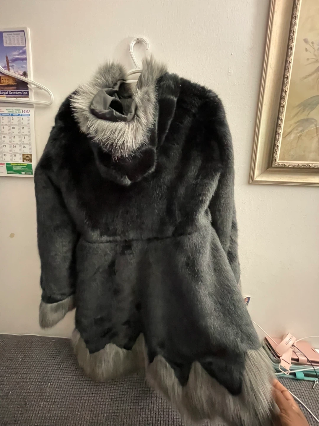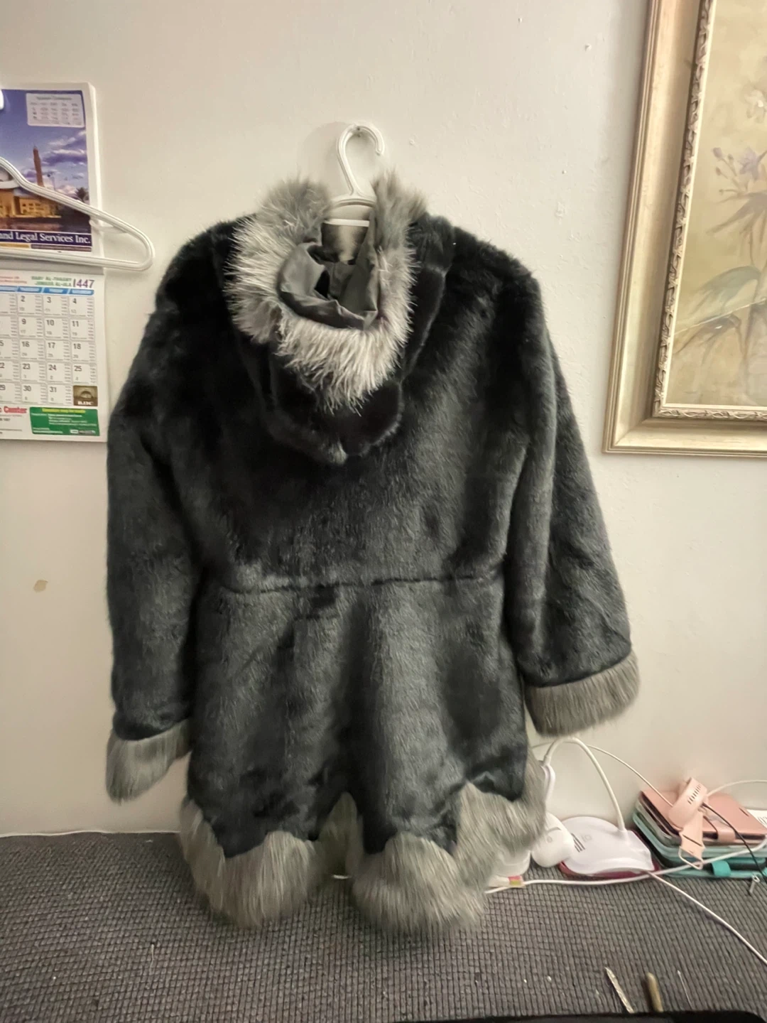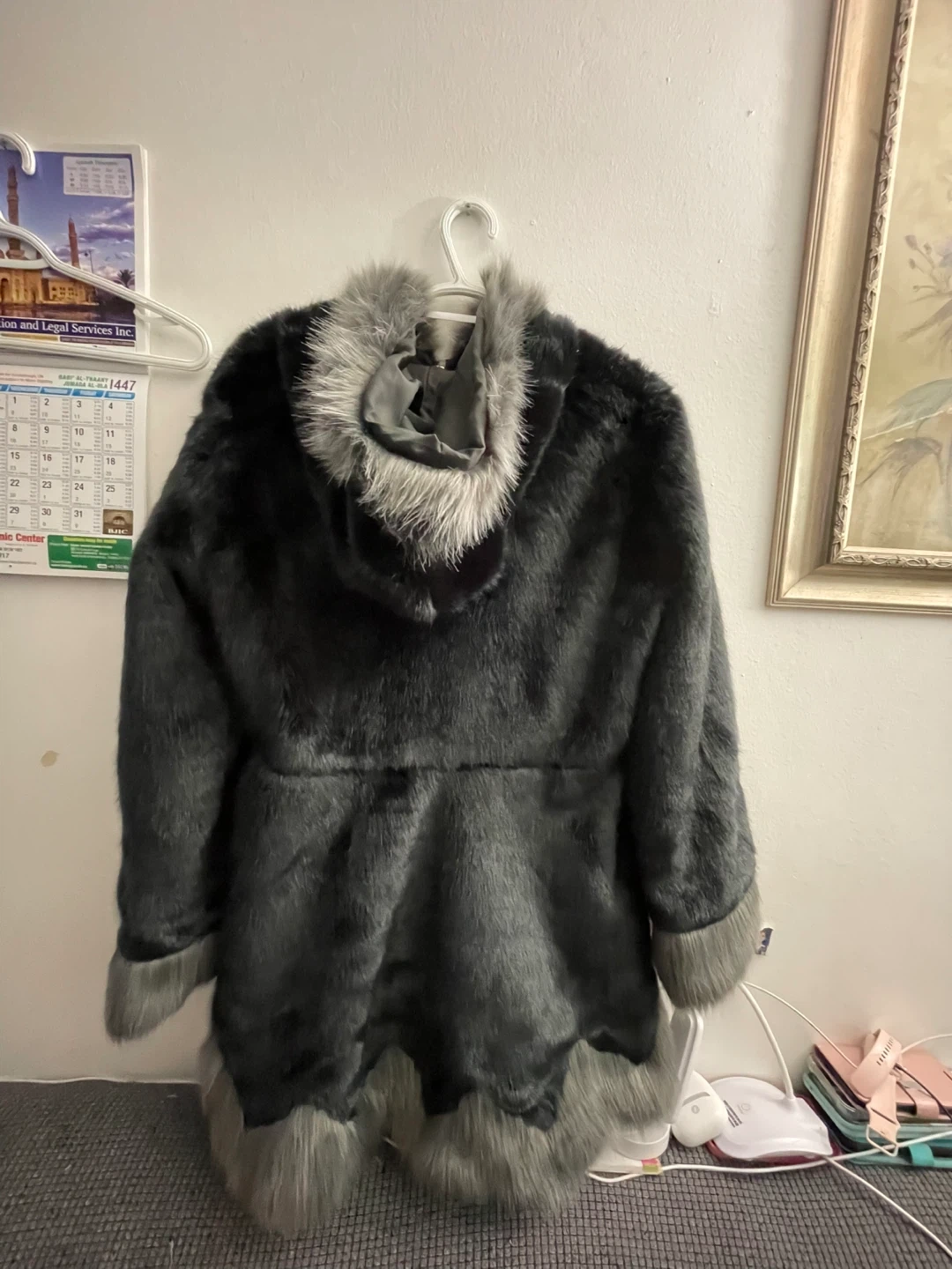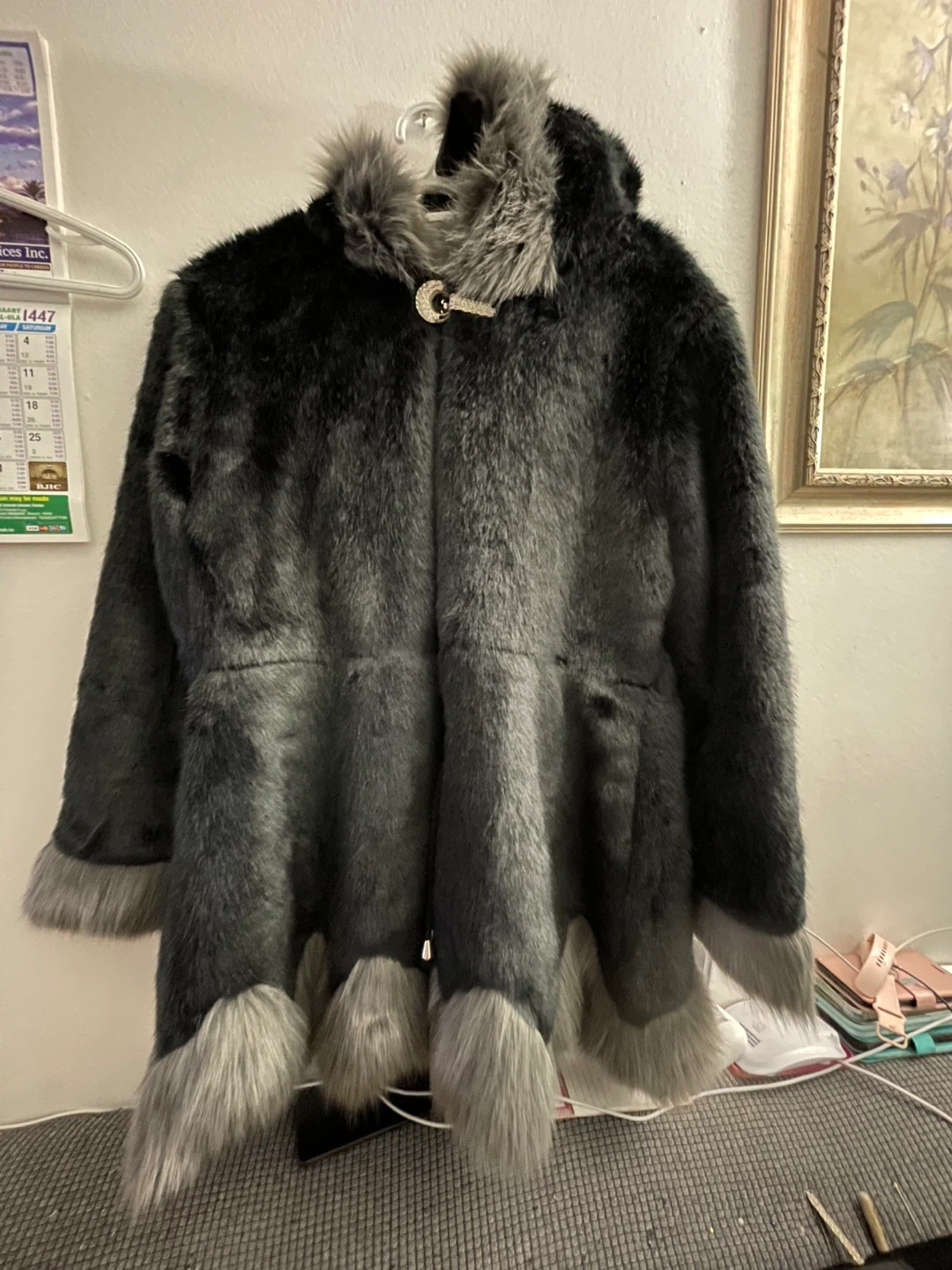 59Cozy faux fur coat in a stylish black and grey colour scheme. Perfect for staying warm and fashionable during the colder months! It has a unique design with faux fur trim. New never worn no tags large size $40 pick up Markham and Lawrence no drop off check out my other listings please.