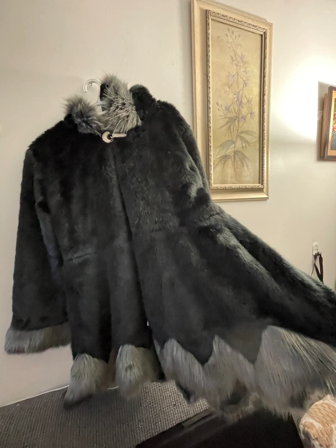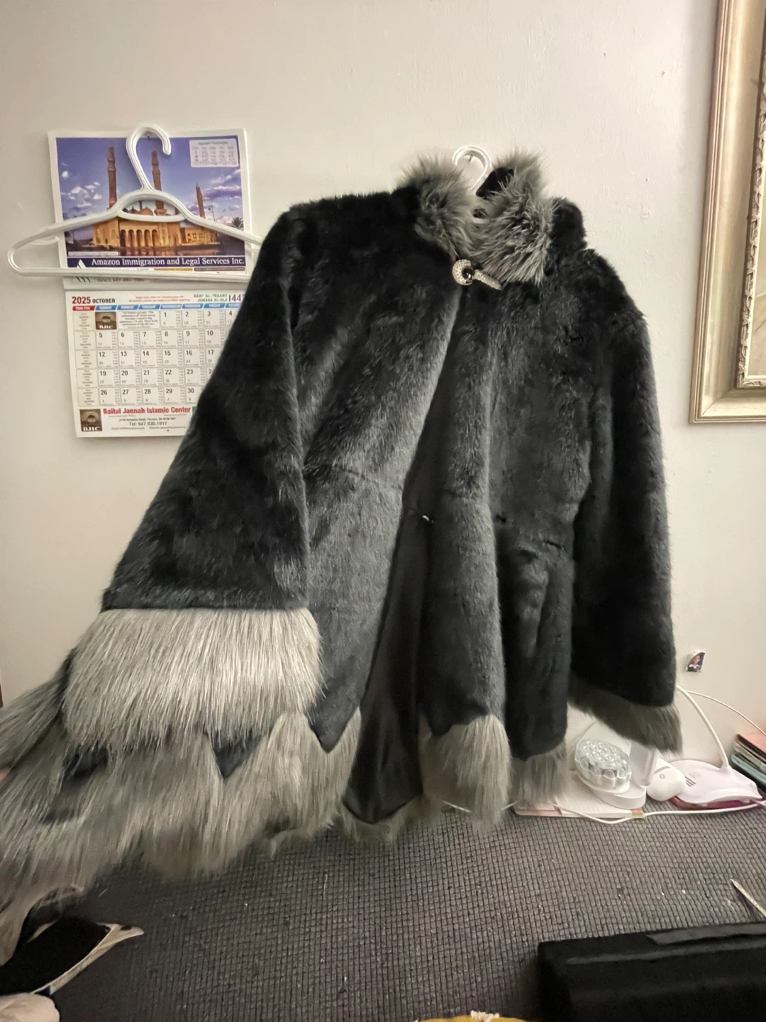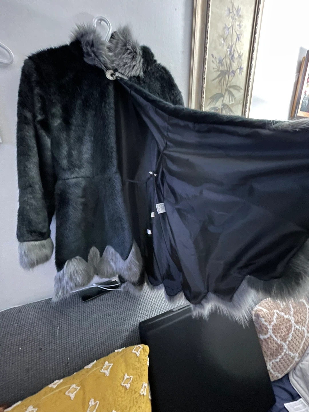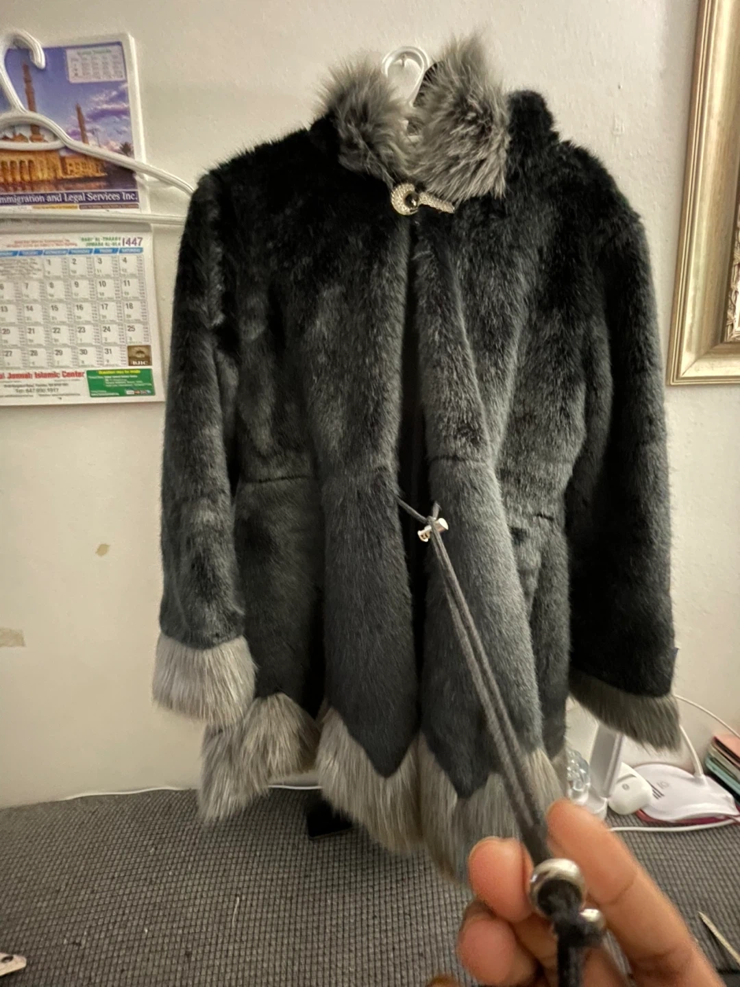 59Cozy faux fur coat in a stylish black and grey colour scheme. Perfect for staying warm and fashionable during the colder months! It has a unique design with faux fur trim. New never worn no tags large size $40 pick up Markham and Lawrence no drop off check out my other listings please.