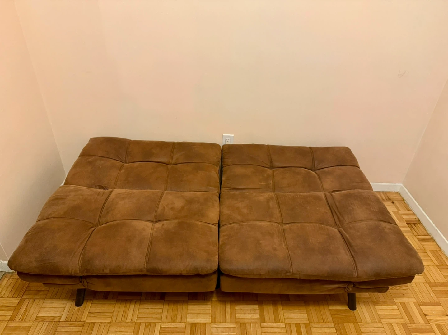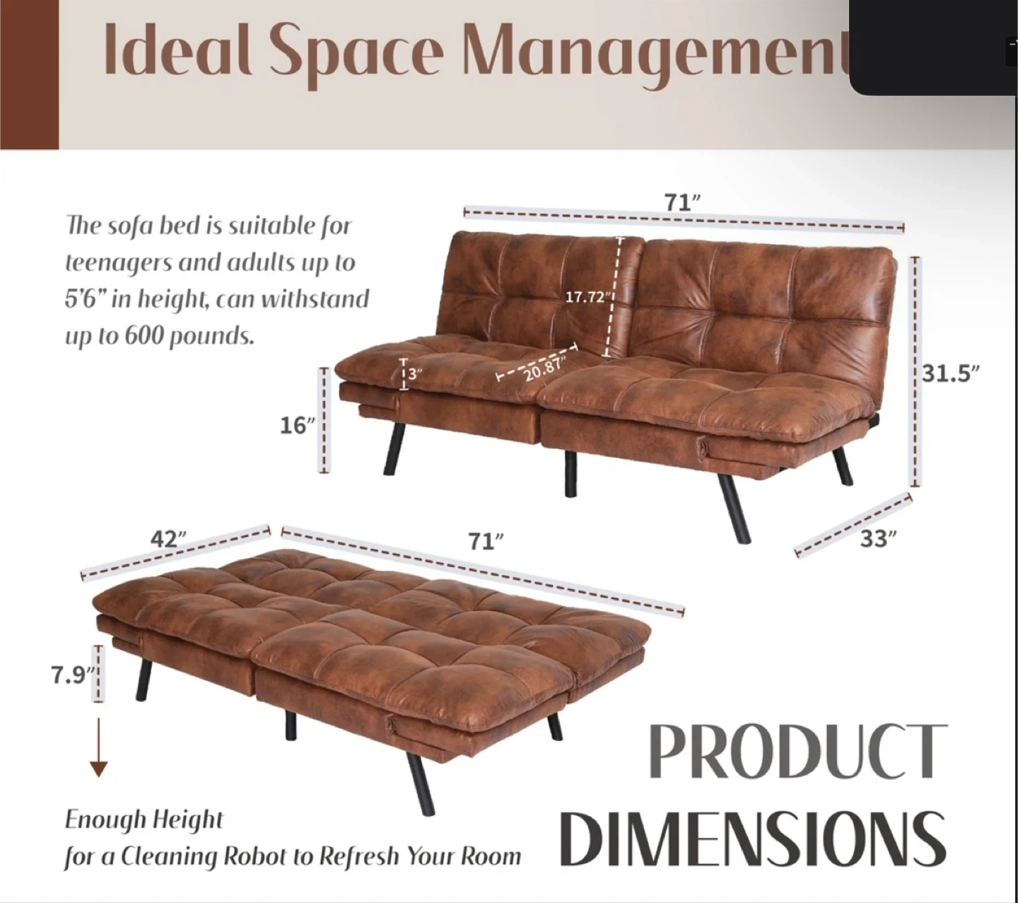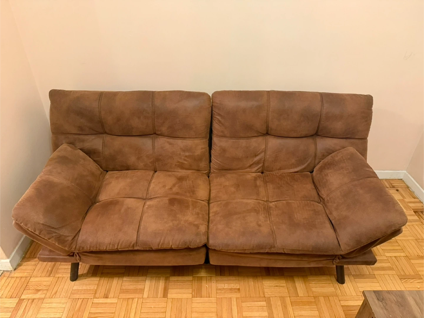 10Brown Futon, originally purchased from Wayfair - great for apartment or guest room! 3 in 1 design - converts from sofa -> recliner -> twin size bed Faux leather upholstery Metal legs and solid frame Dimensions : 71 W x 33 D x 31 H 180cm W x 84 cm D x 79 cm H) Gently used, from smoke free home. No major scratches or stains. Pick up: Beaches, Toronto