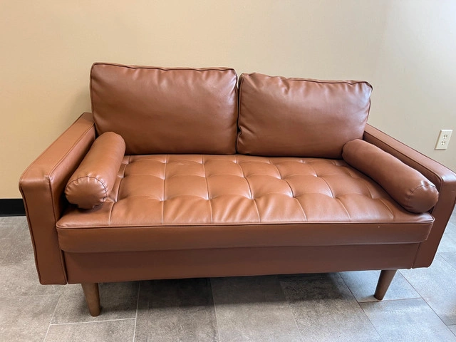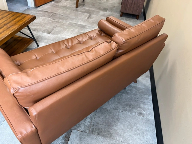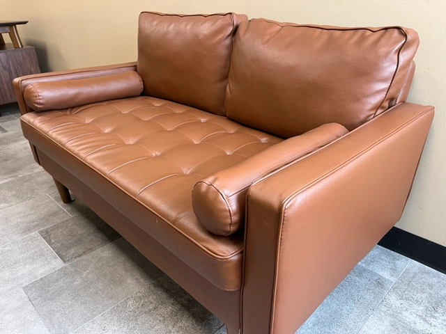 91This stylish, used mid-century modern loveseat features a sleek, caramel-coloured faux leather exterior that brings a touch of vintage charm to any living space. It has a tufted seat, two plush back cushions, and two matching bolster pillows, perfect for cozying up. The loveseat is supported by tapered wooden legs, adding to its retro aesthetic. * Colour: Caramel * Material: Faux Leather * Style: Mid-Century Modern * Legs: Tapered Wood