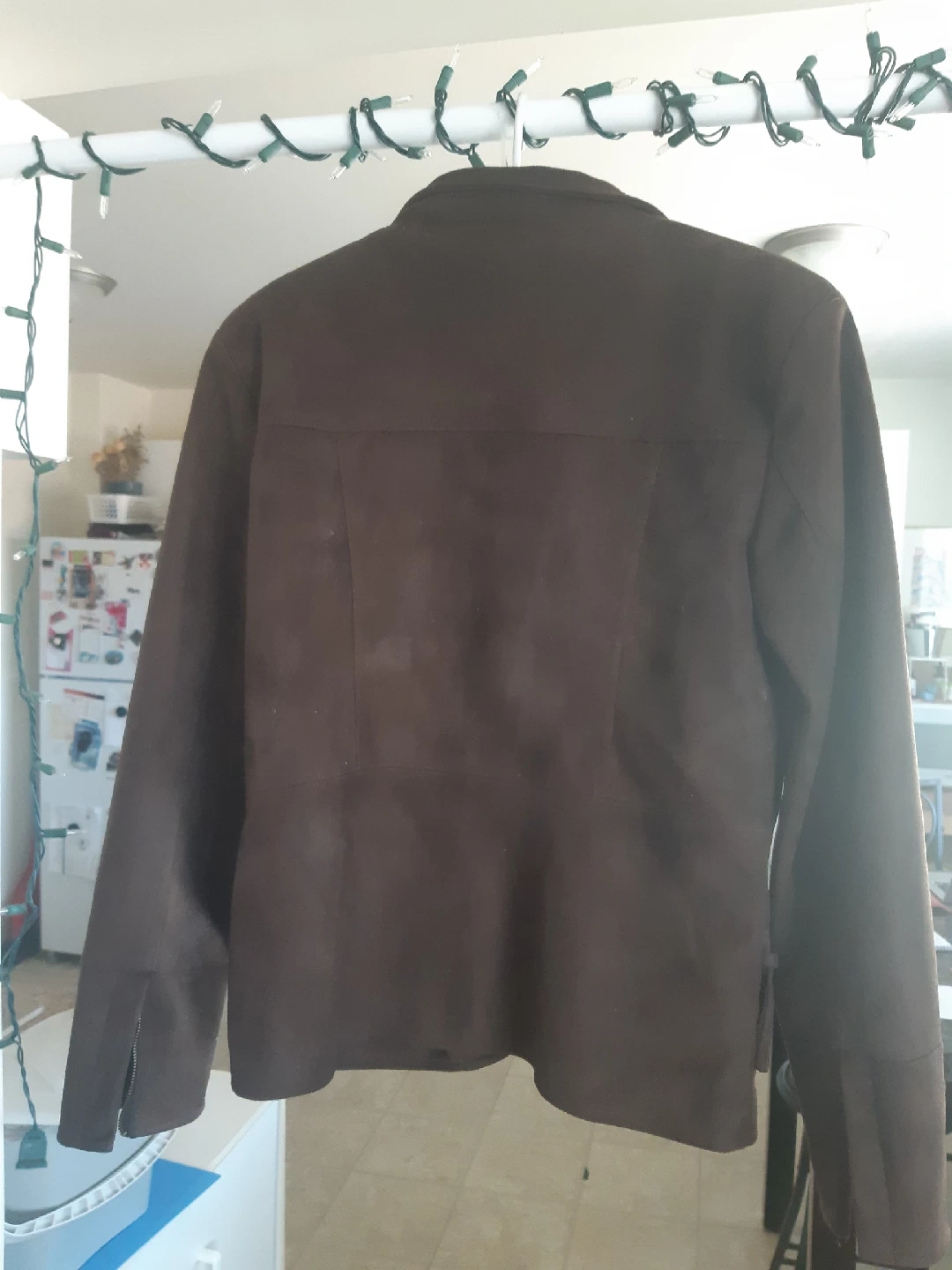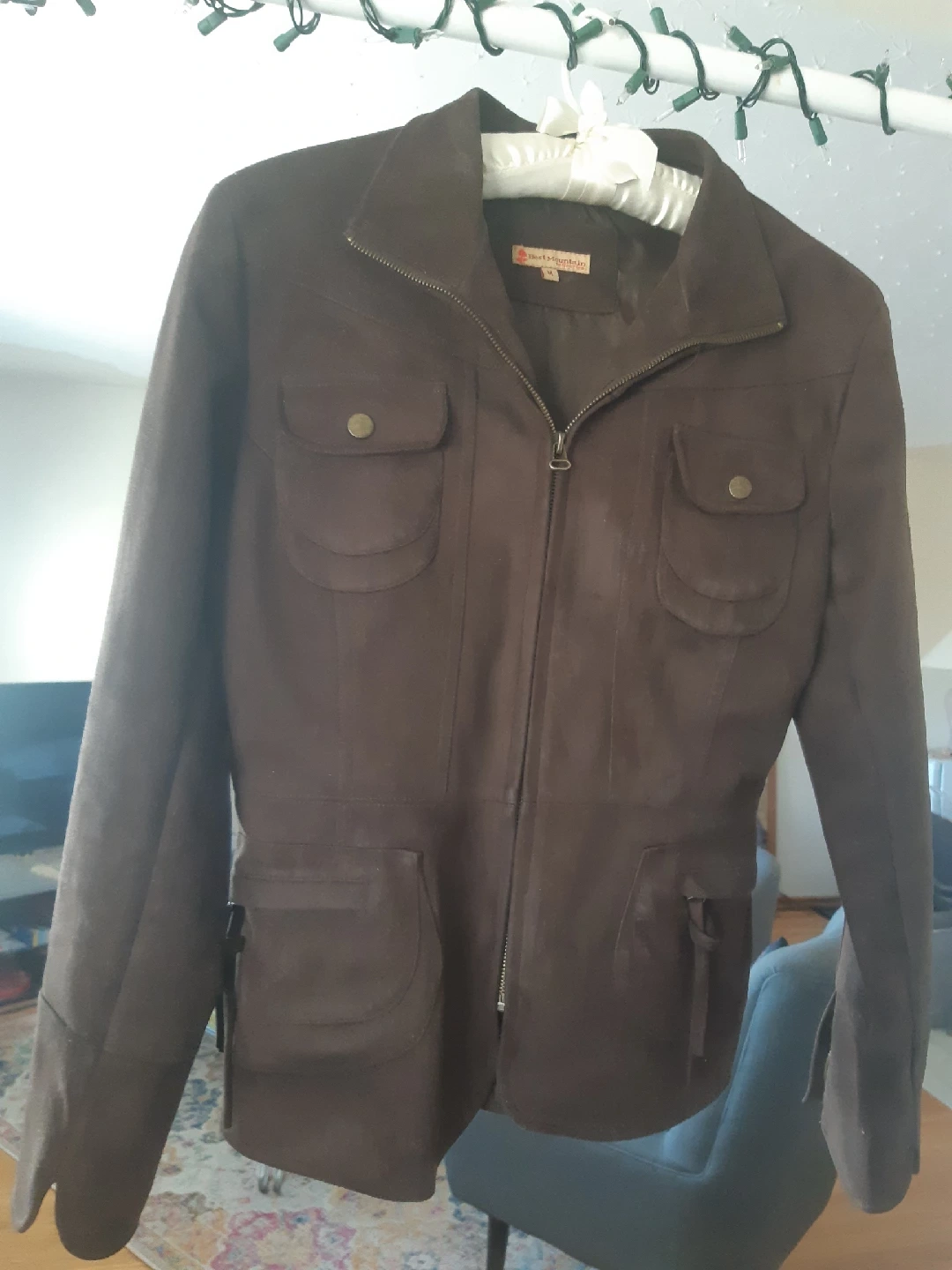 117Pick up Banff Trail NW. Selling a Rest Mountain faux suede brown jacket by David Lee in size medium. It's in great condition and ready for a new home! It has a unique classic design. Open to reasonable offers.