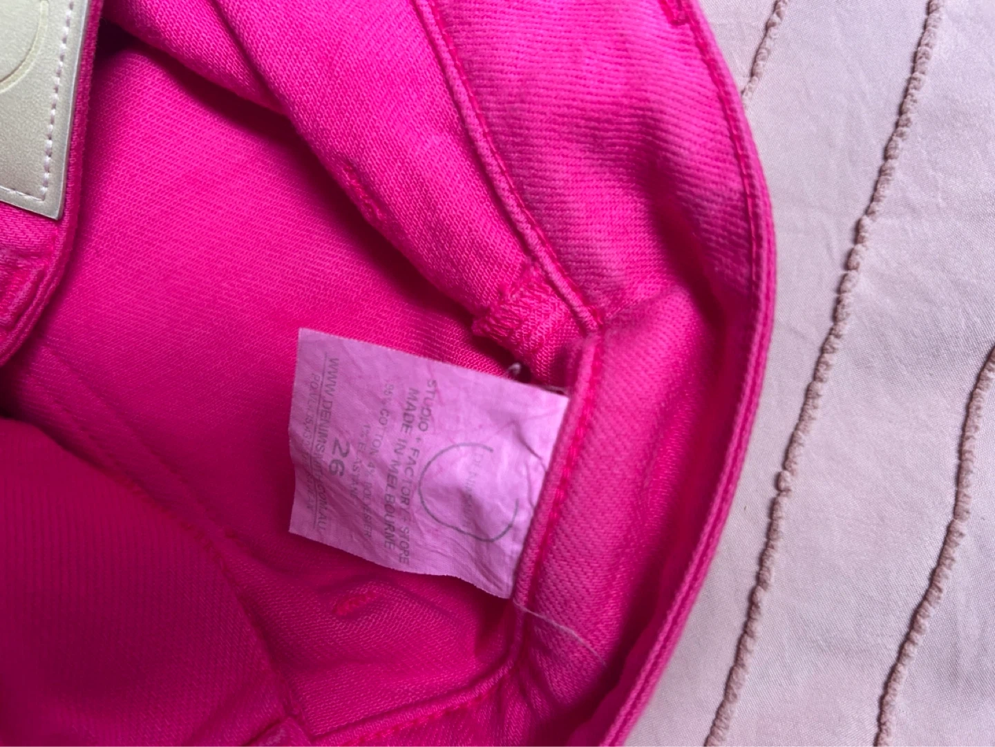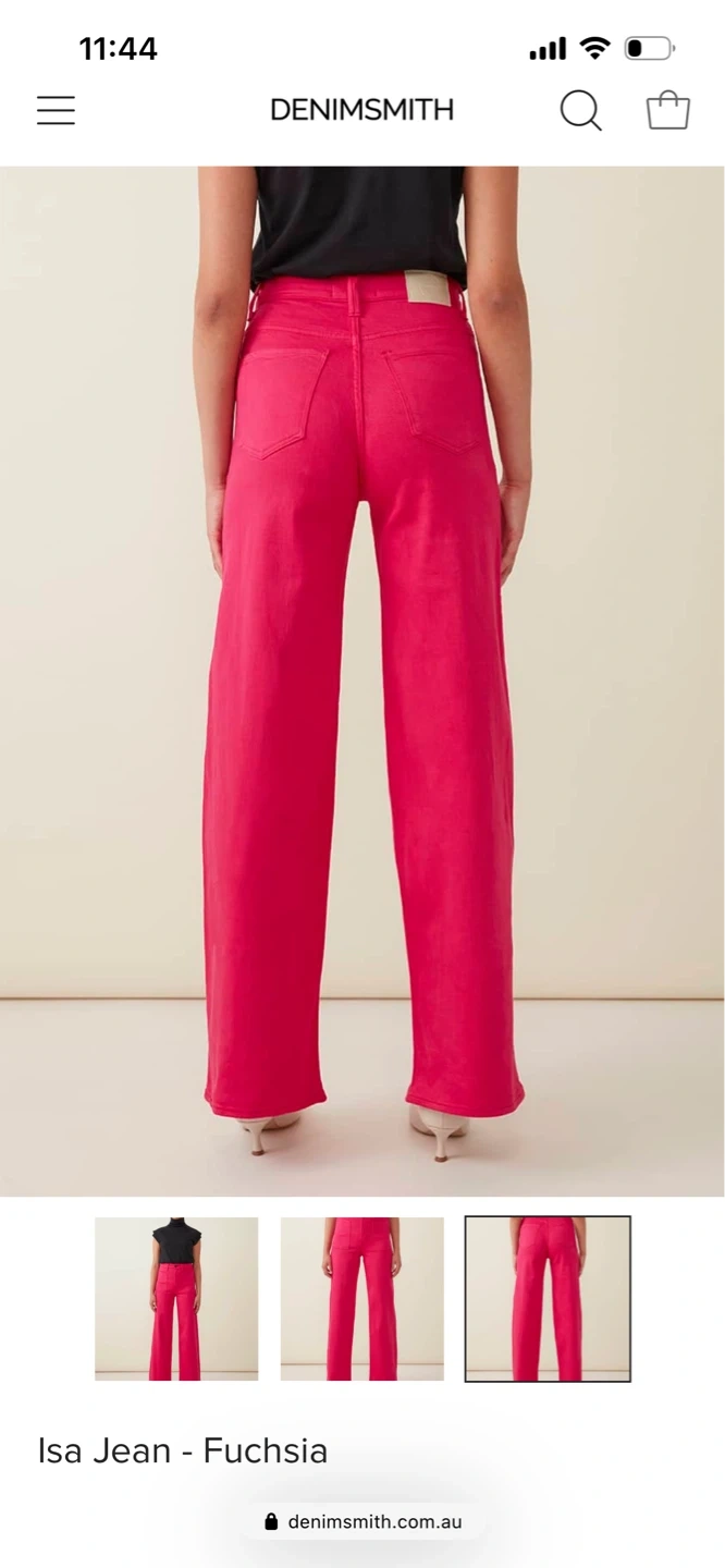 These Denimsmith Isa Jeans are a vibrant fuchsia colour. They're a high-waisted, wide-leg style. Made in Australia. European Denim, stretch half a size!