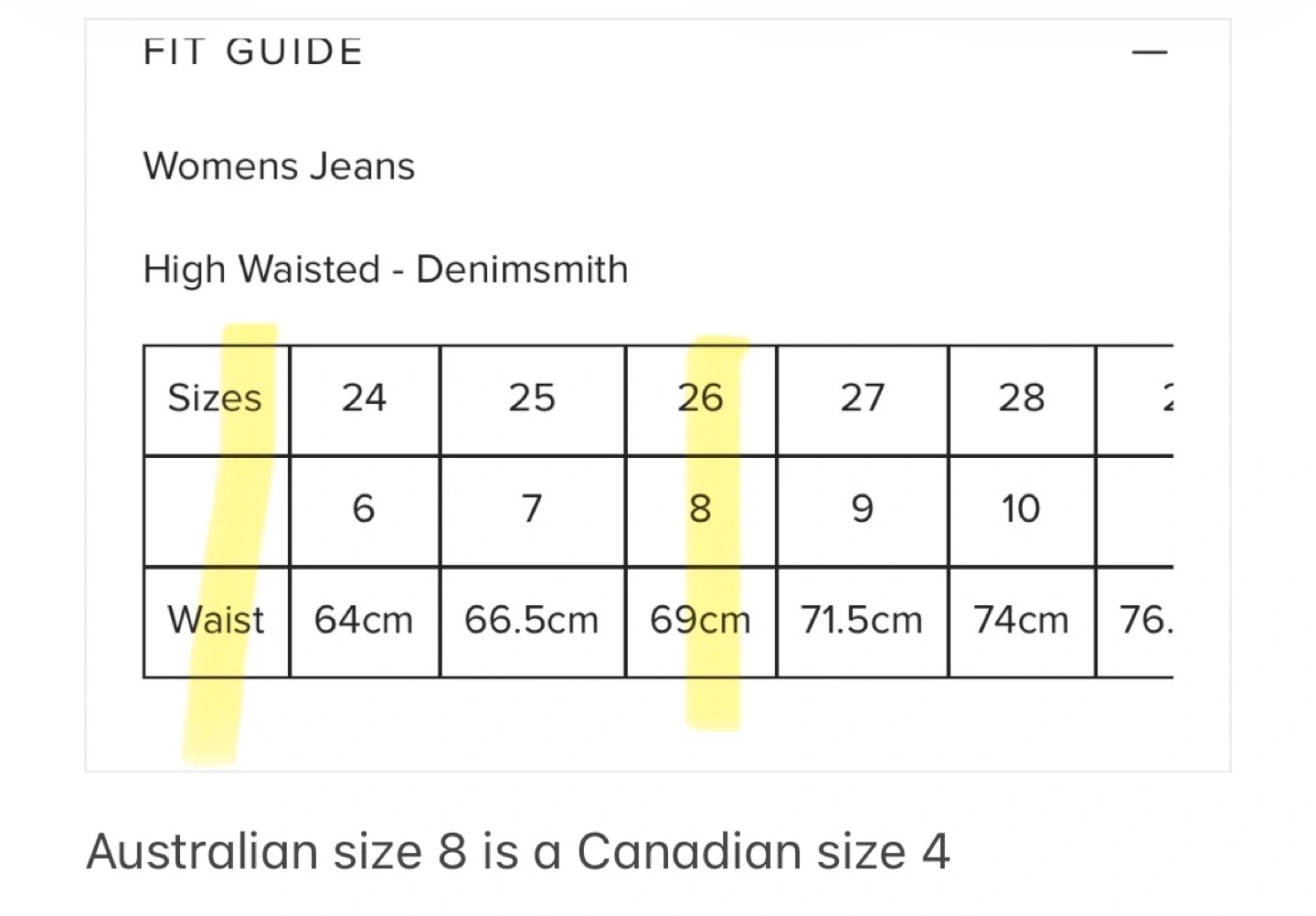 Size 26 waist, equivalent to an Australian size 8 or Canadian size 4.
